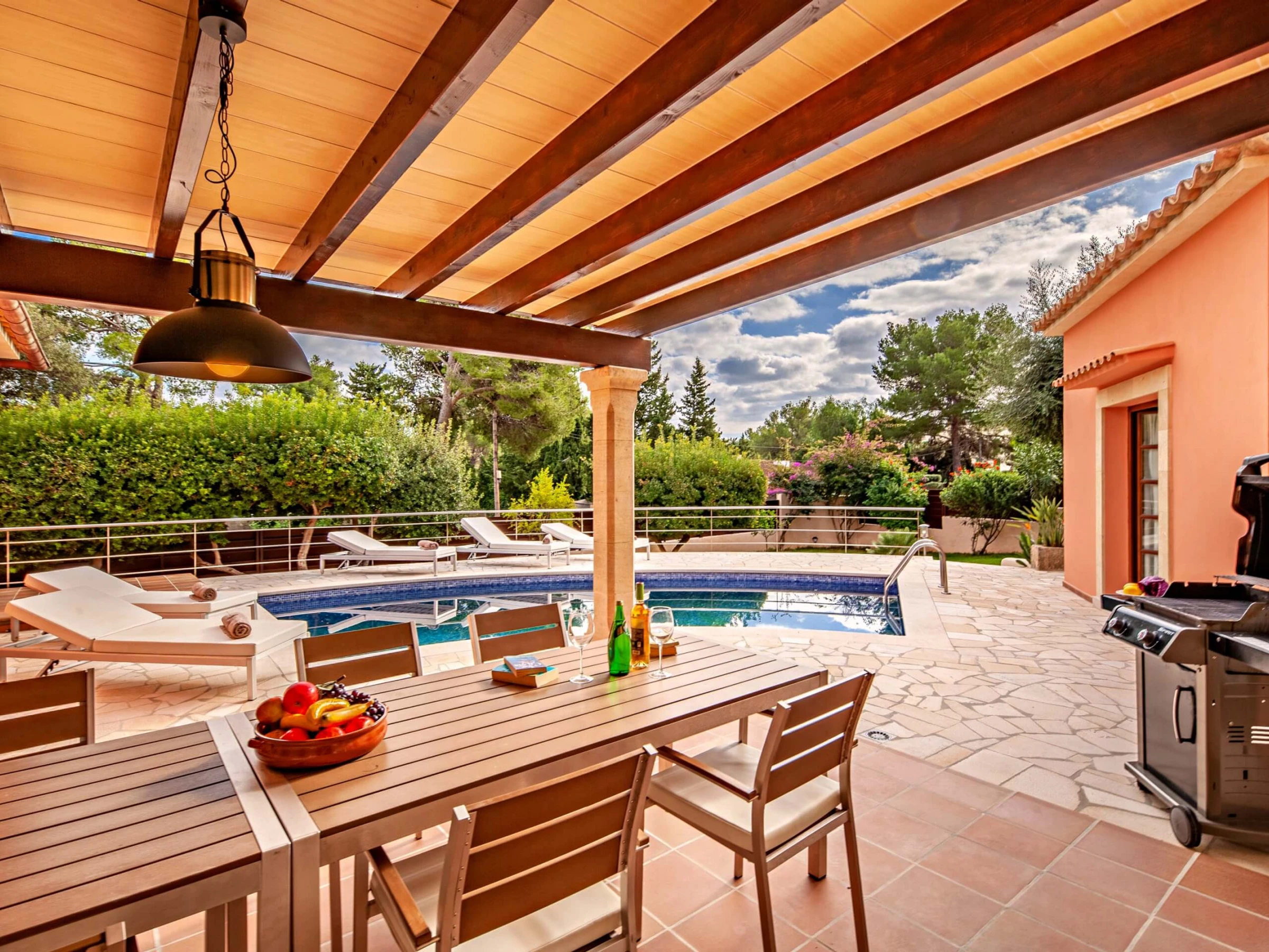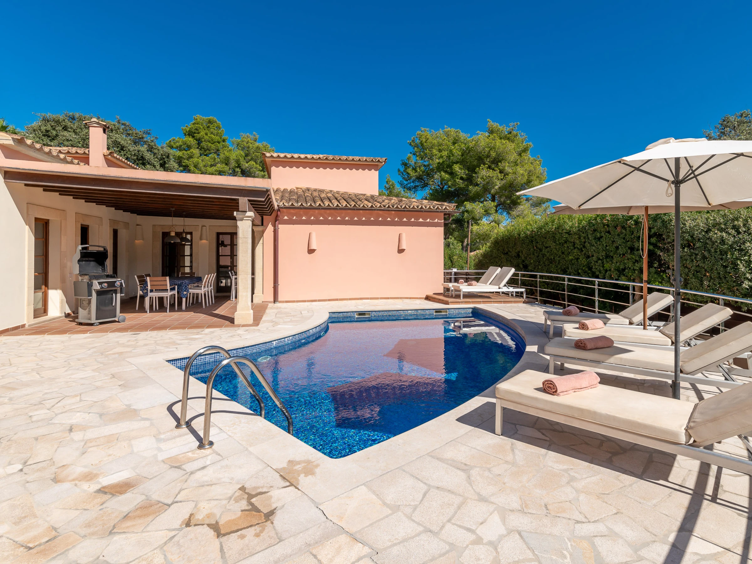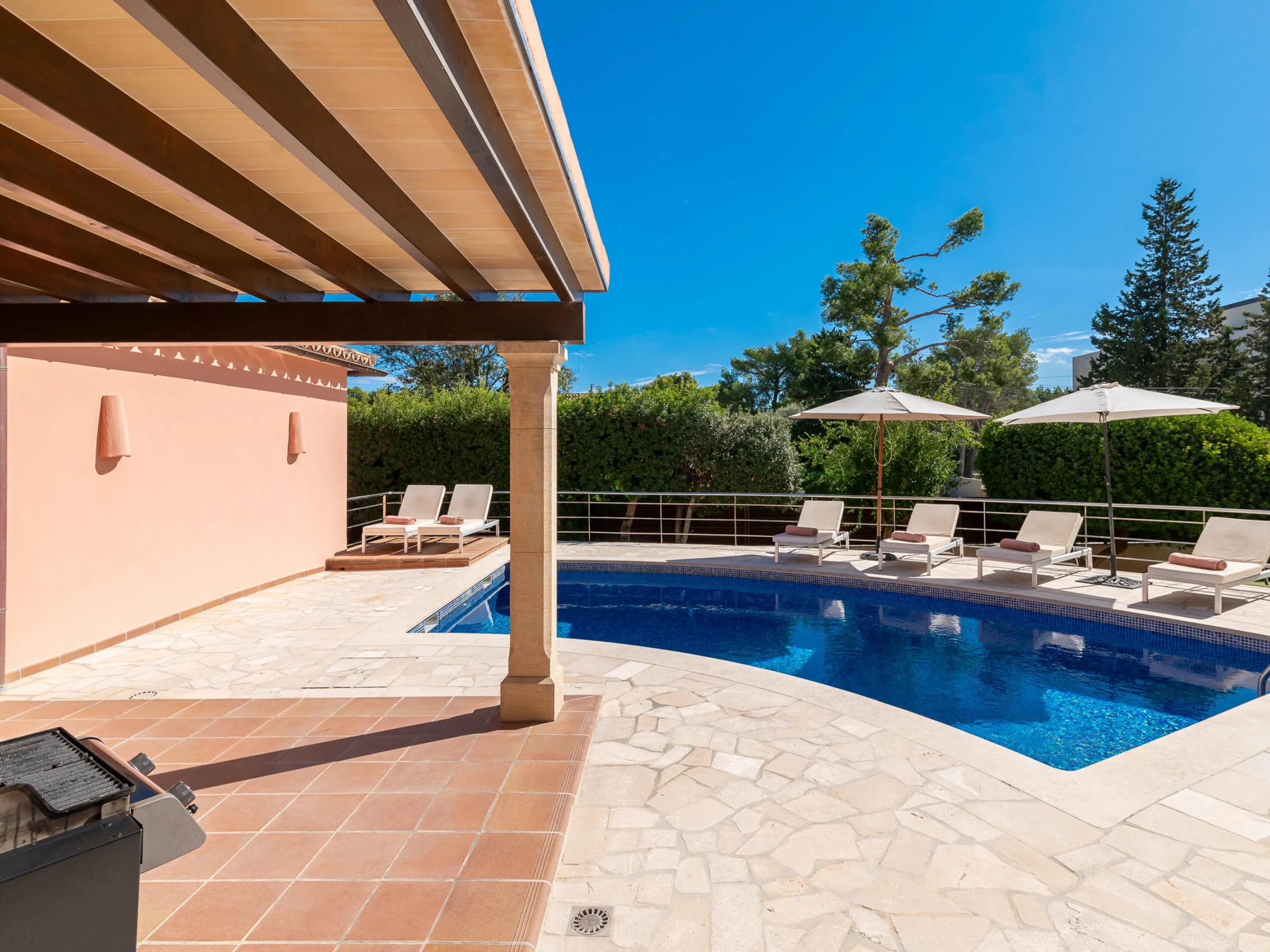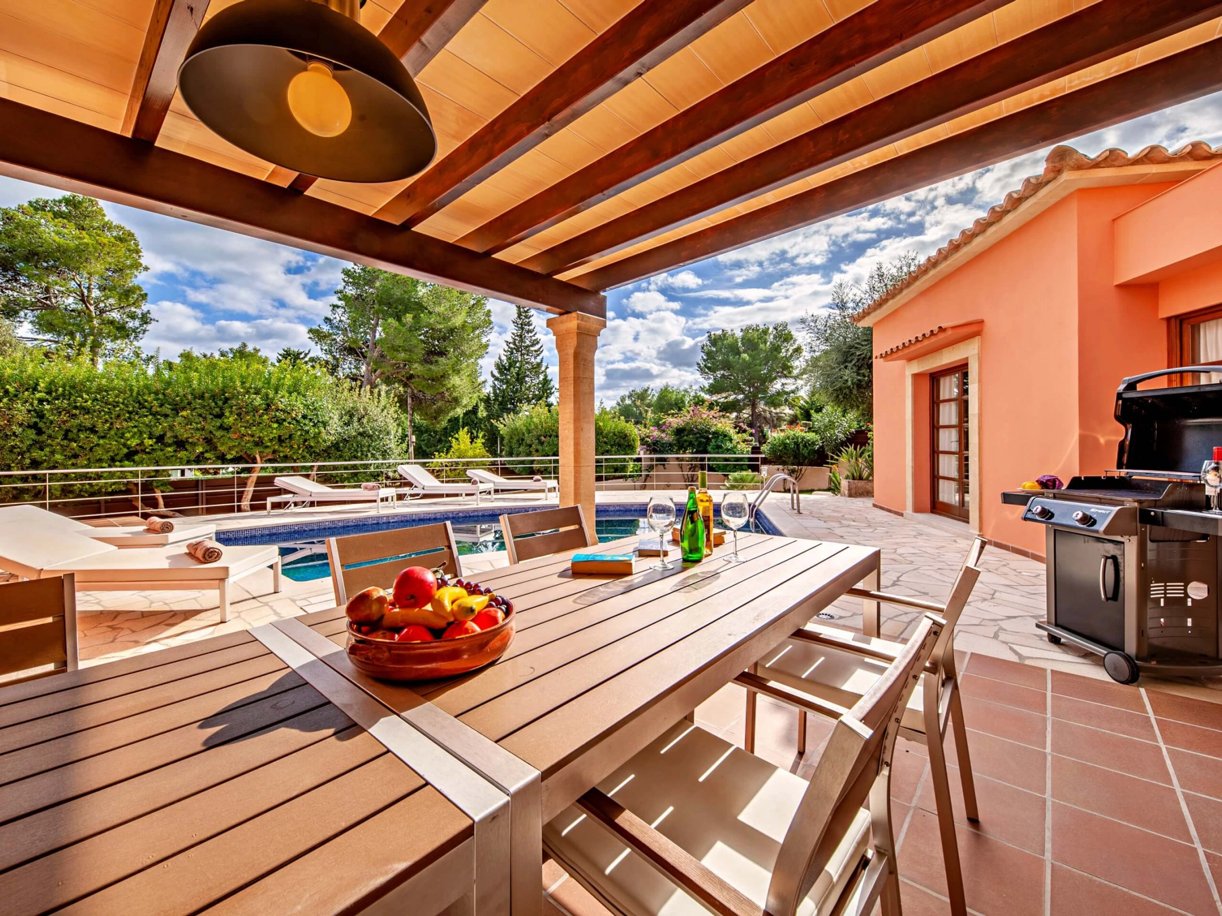 Im Außenbereich befindet sich die Villa auf 1200 Quadratmetern privatem Grundstück mit Kiefern, Blumen, Sträuchern und einem gemütlichen privaten Swimmingpool. Der private Pool misst 6 m x 4,8 m (Tiefe zwischen 1,2 m und 2 m). Liegestühle werden bereitgestellt, um angenehme Stunden der Entspannung unter der warmen mallorquinischen Sonne zu genießen. Auf dem Gelände gibt es auch einen privaten Parkplatz.