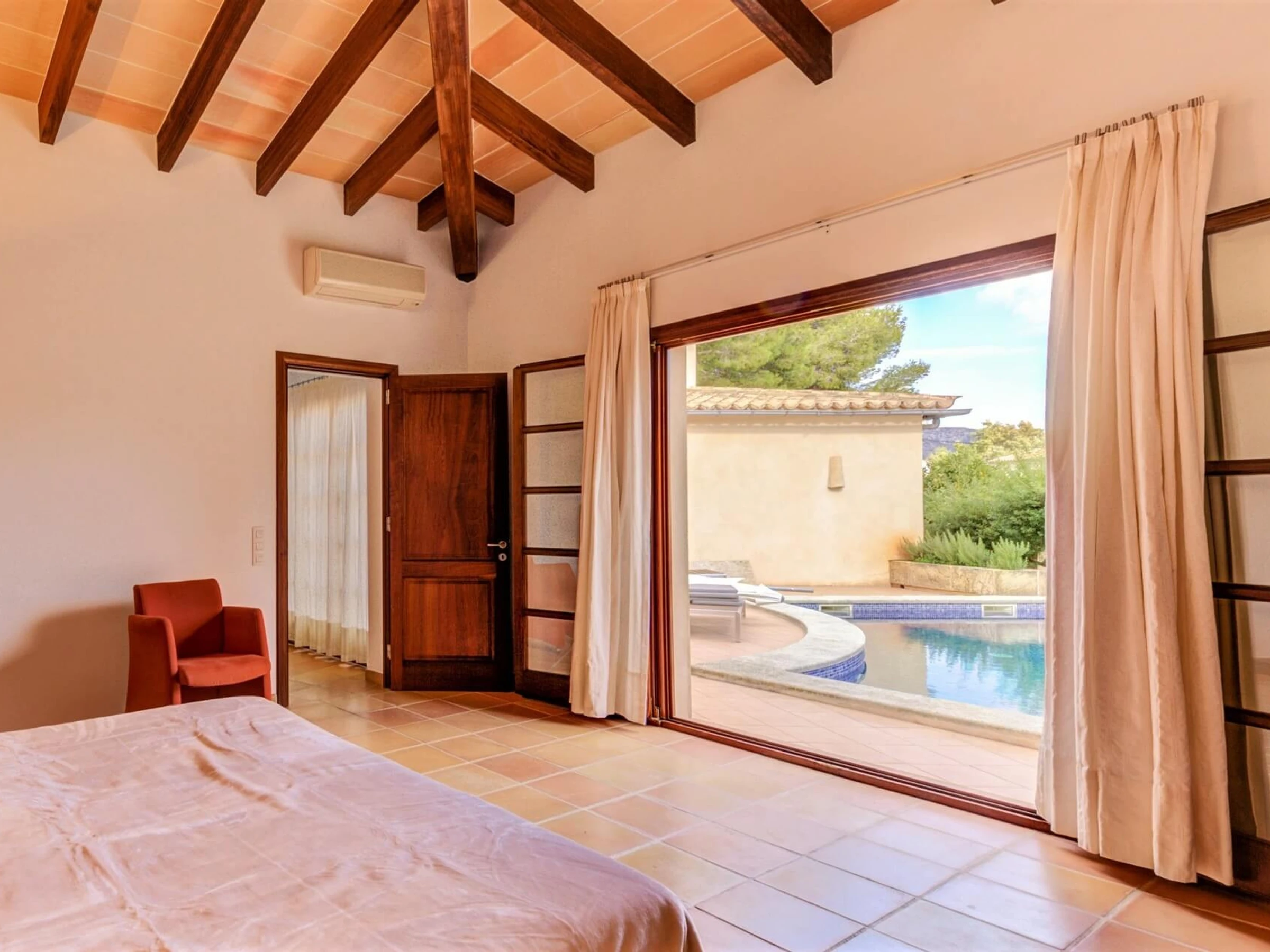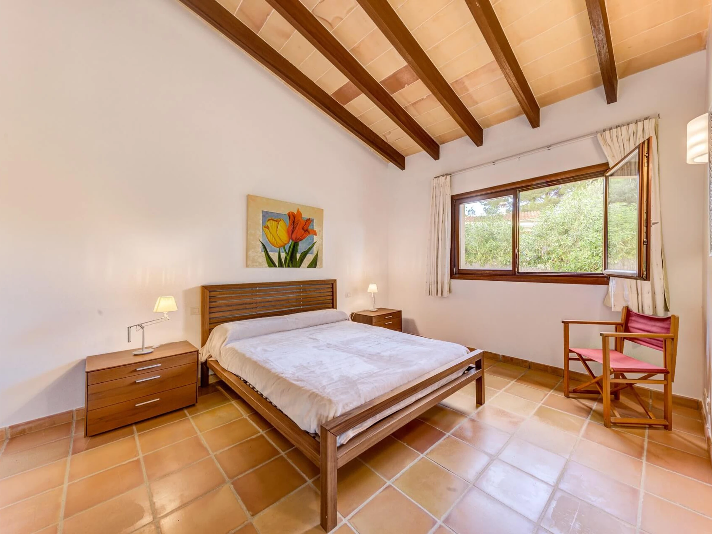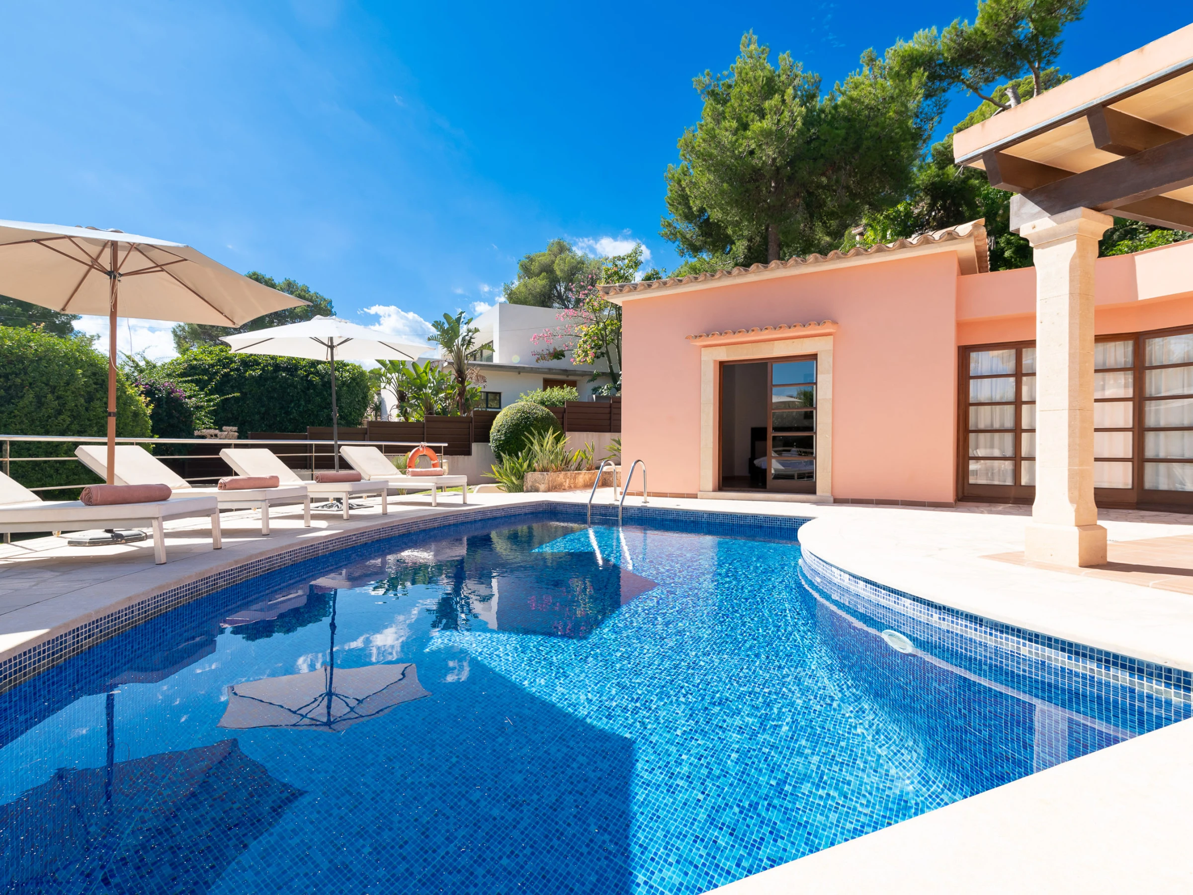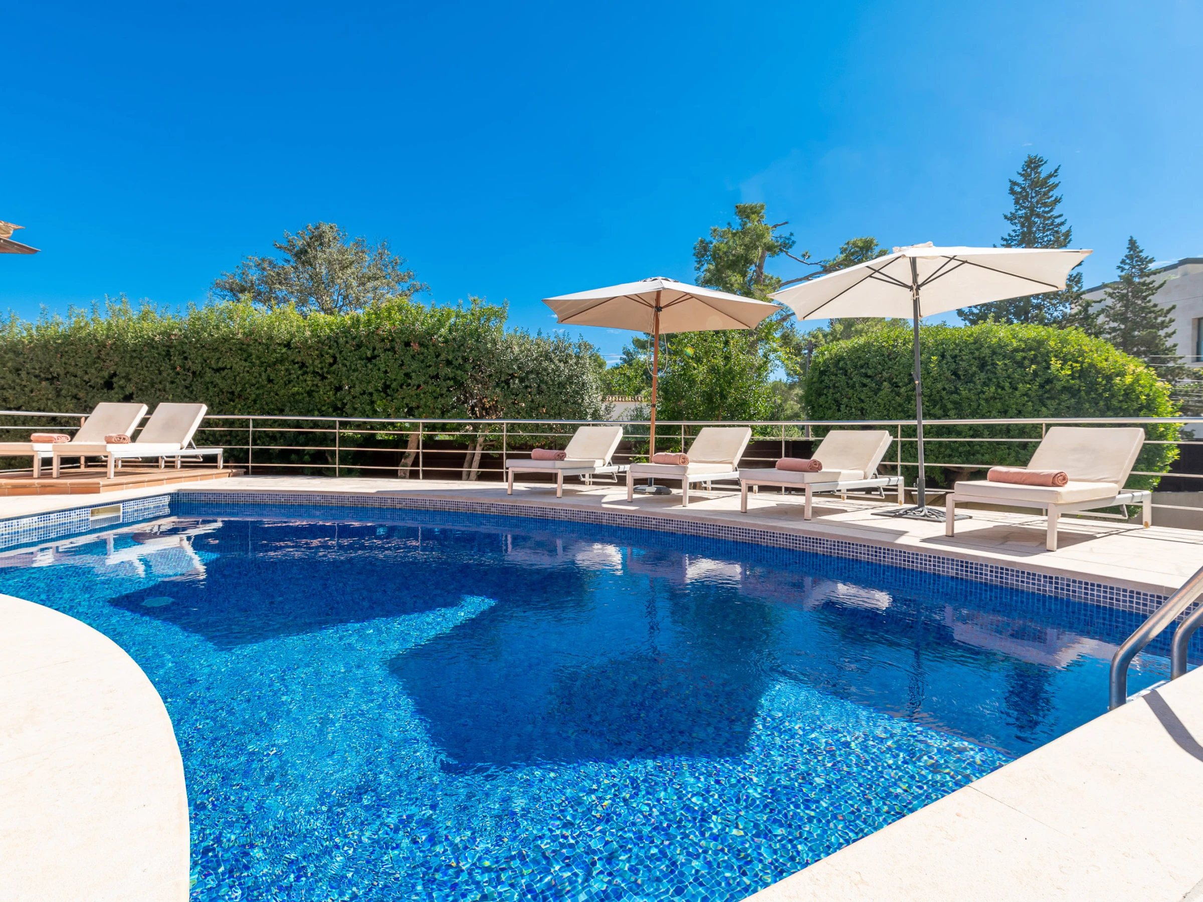 Im Außenbereich befindet sich die Villa auf 1200 Quadratmetern privatem Grundstück mit Kiefern, Blumen, Sträuchern und einem gemütlichen privaten Swimmingpool. Der private Pool misst 6 m x 4,8 m (Tiefe zwischen 1,2 m und 2 m). Liegestühle werden bereitgestellt, um angenehme Stunden der Entspannung unter der warmen mallorquinischen Sonne zu genießen. Auf dem Gelände gibt es auch einen privaten Parkplatz.