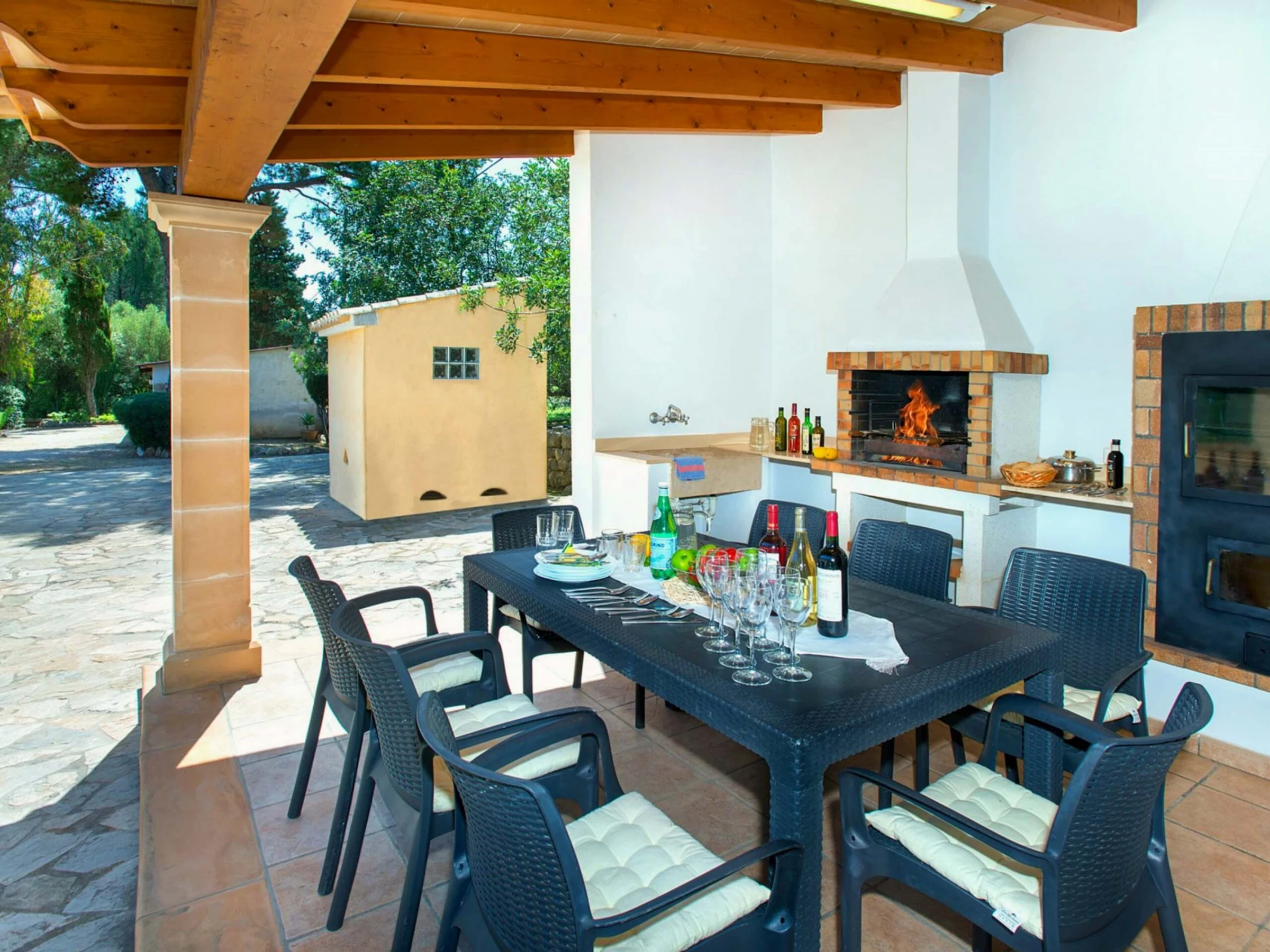 Eine der herausragendsten Eigenschaften des Außenbereichs ist die überdachte Grillhütte, ausgestattet mit einem Ziegelgrill und einem Brotbackofen. Diese Zone ist perfekt, um köstliche Mahlzeiten im Freien zu genießen, begleitet von einem Tisch und Stühlen, um die ideale Atmosphäre für Sommerabendessen mit Familie oder Freunden zu schaffen.
