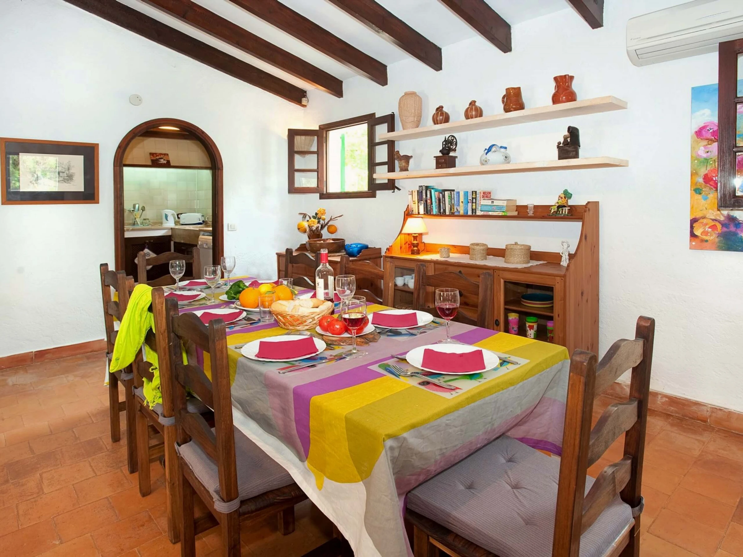 Der Salon-Speisesaal ist geräumig und im traditionellen spanischen Stil eingerichtet, mit hohen Decken, Holzbalken und Fliesenboden. Der Salon ist mit bequemen Sitzgelegenheiten, einem Flachbildfernseher, einem dekorativen Kamin und einem Esstisch mit Stühlen ausgestattet, was ihn zu einem perfekten Ort macht, um sich zu entspannen und mit Familie oder Freunden zu genießen. Vom Esszimmer aus gelangt man in eine kompakte, aber vollständig ausgestattete Küche, die ideal ist, um bequem Hausmannskost zuzubereiten.