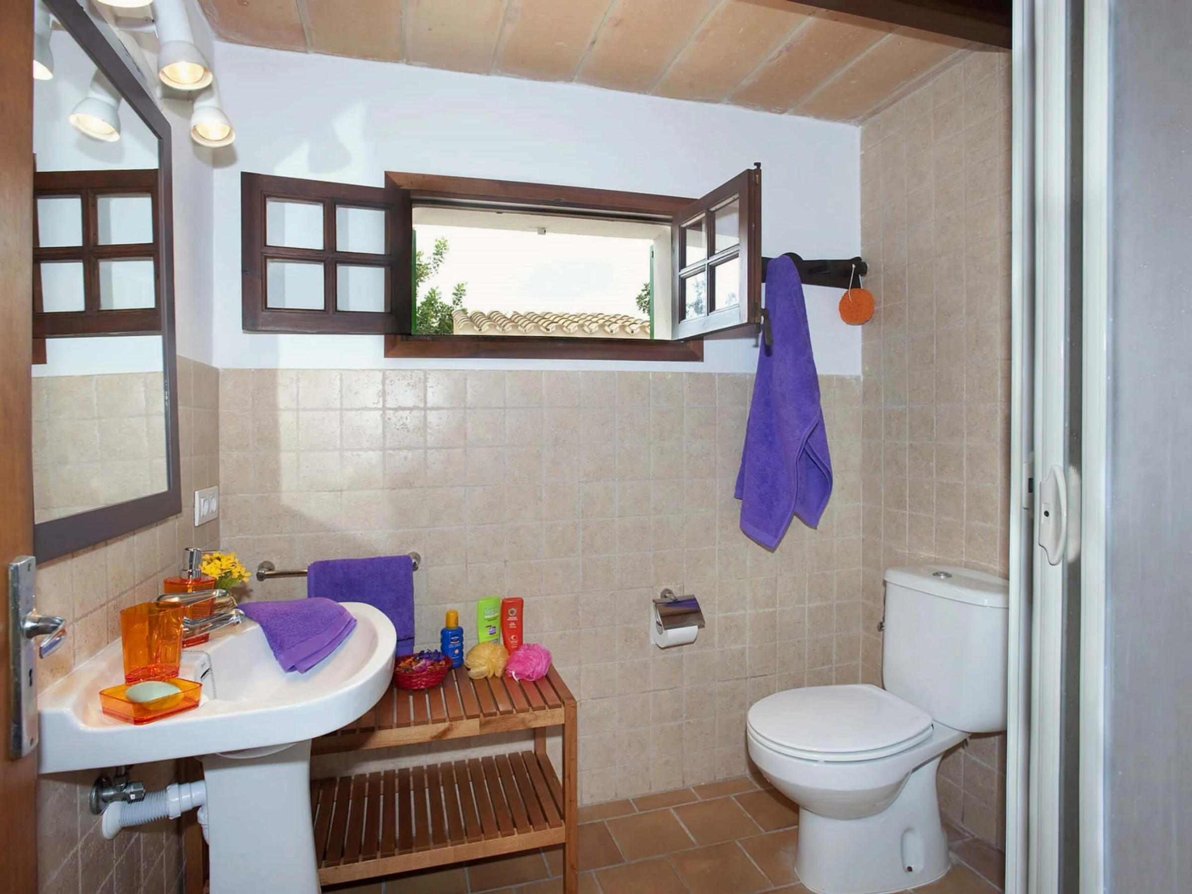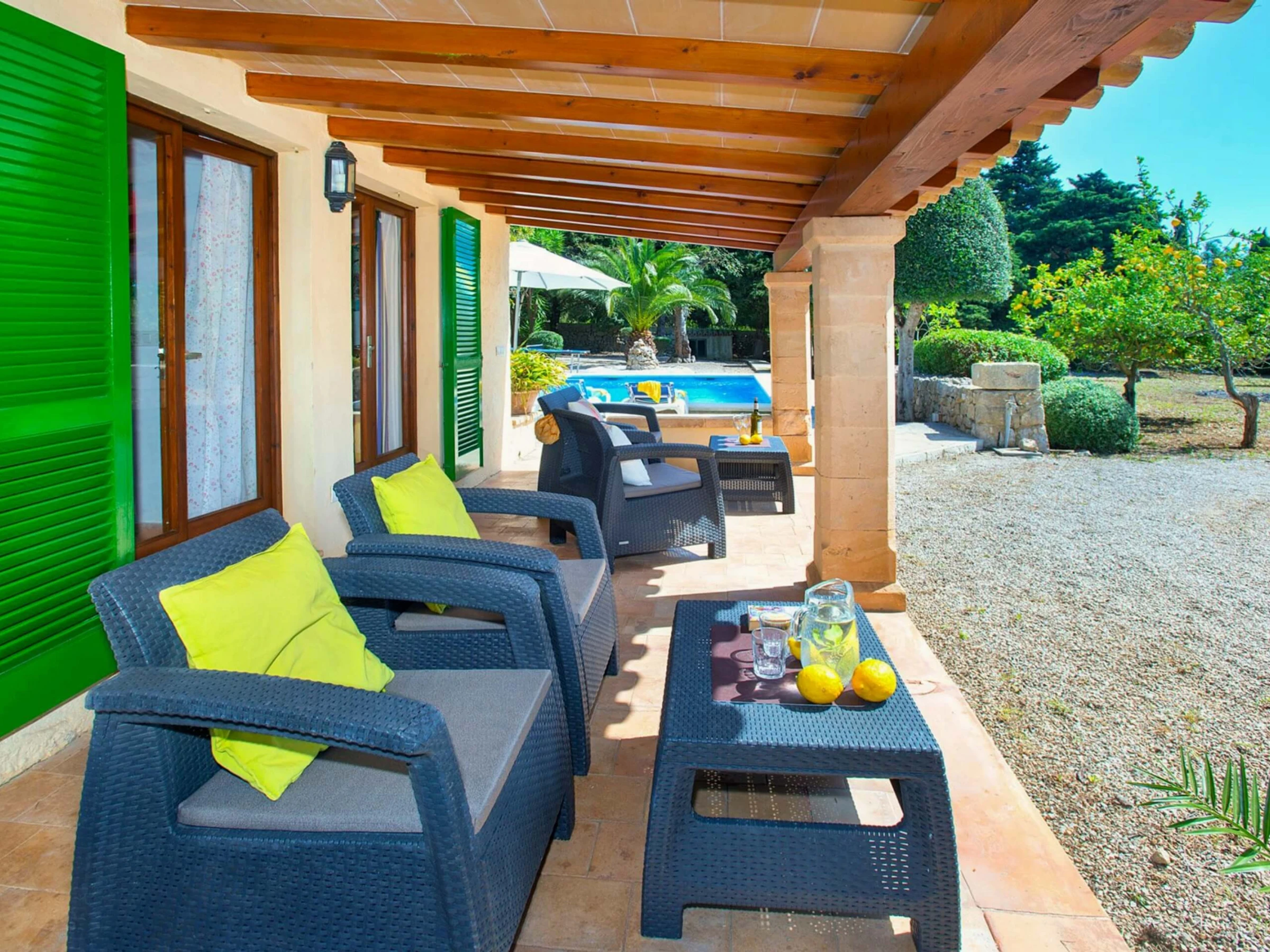 Der Eingang zu Villa Vilar de Baix befindet sich entlang eines kurzen Feldwegs, der die Hauptstraße zwischen Puerto Pollensa und der Altstadt von Pollensa verbindet. Nach Passieren einiger Holztore gelangt man auf einen privaten Weg, der von einem Obstgarten umgeben ist und eine ruhige und natürliche Atmosphäre bietet. Der Haupteingang der Villa befindet sich an der Vorderseite des Hauses.