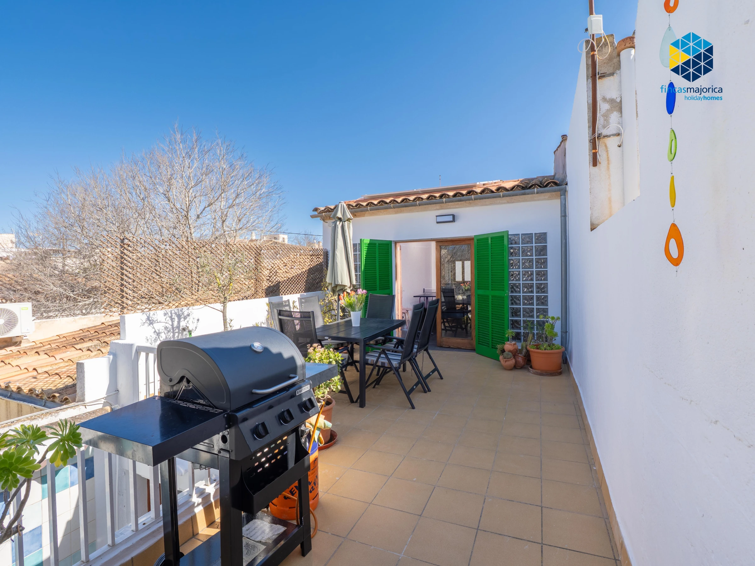 Im Erdgeschoss finden Sie eine voll ausgestattete Küche, ein helles Wohn-Esszimmer, zwei Schlafzimmer und ein Badezimmer mit Dusche. Von diesem Stockwerk aus gelangt man auch zu einem kleinen Hof mit Treppen, die in das Obergeschoss führen.