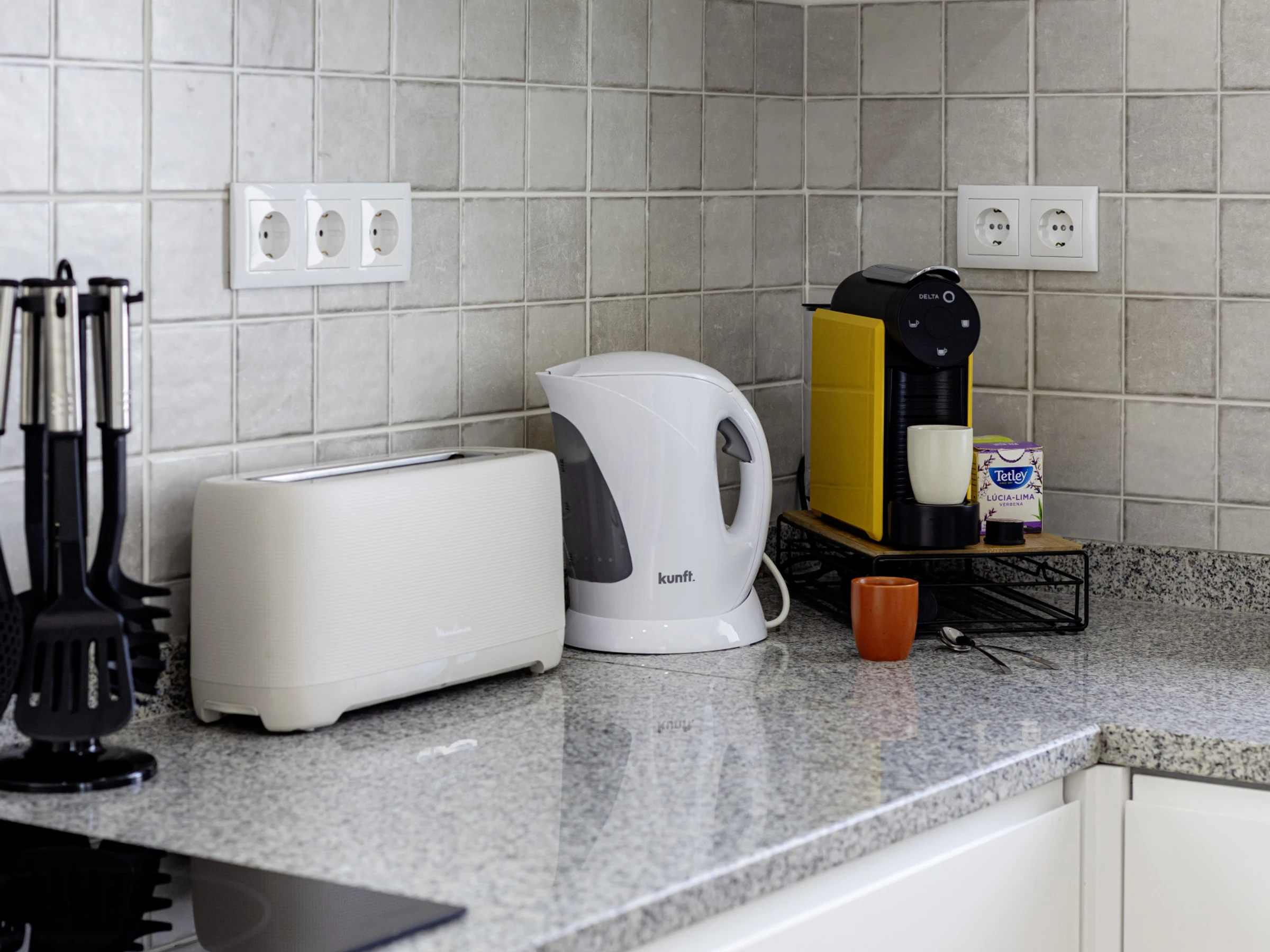 Dieses küche, ist ausgestattet in kühlschrank, mikrowelle, backofen, gefrierschrank, spülmaschine, kochutensilien, kaffeemaschine, toaster und wasserkocher.