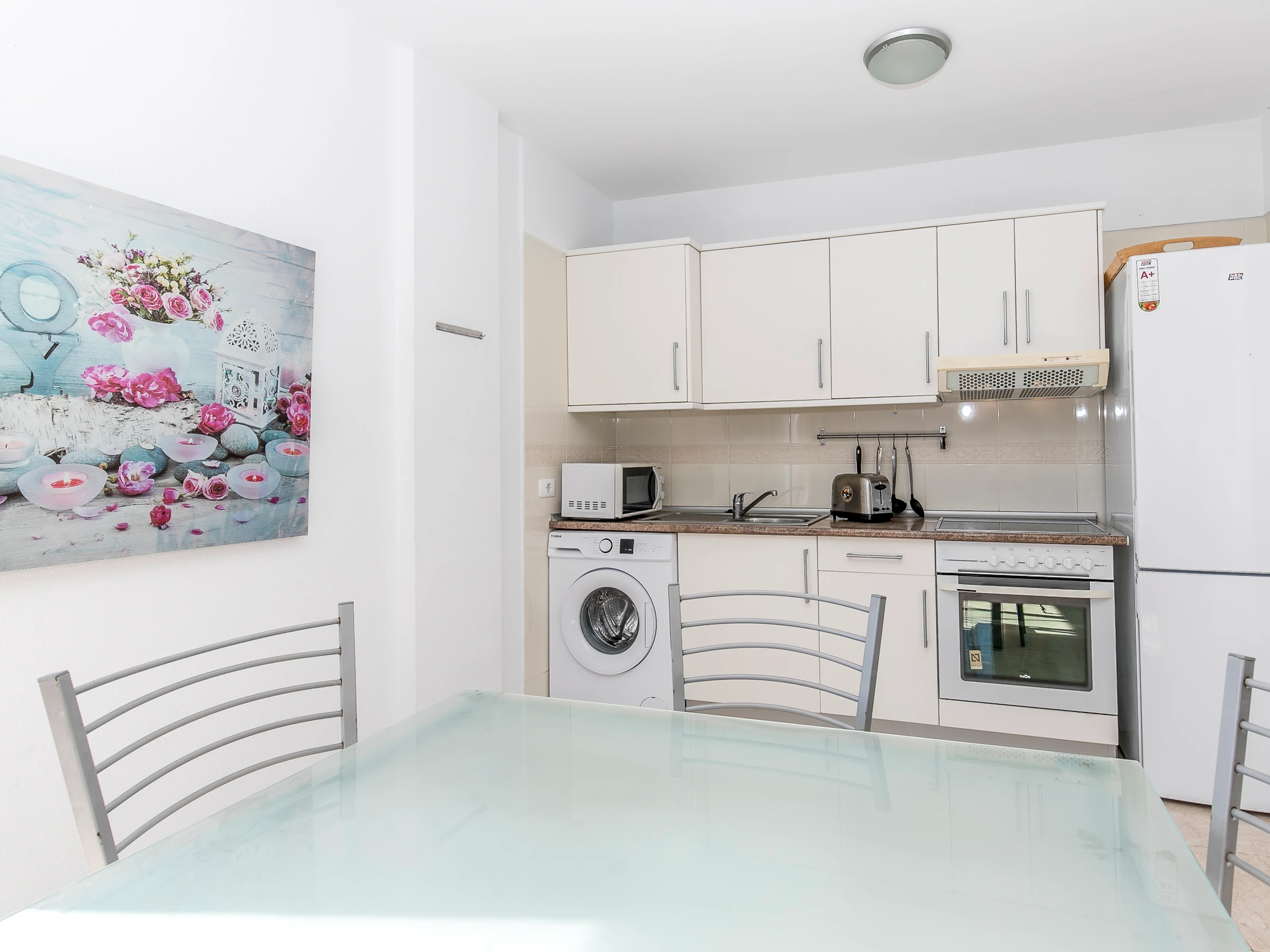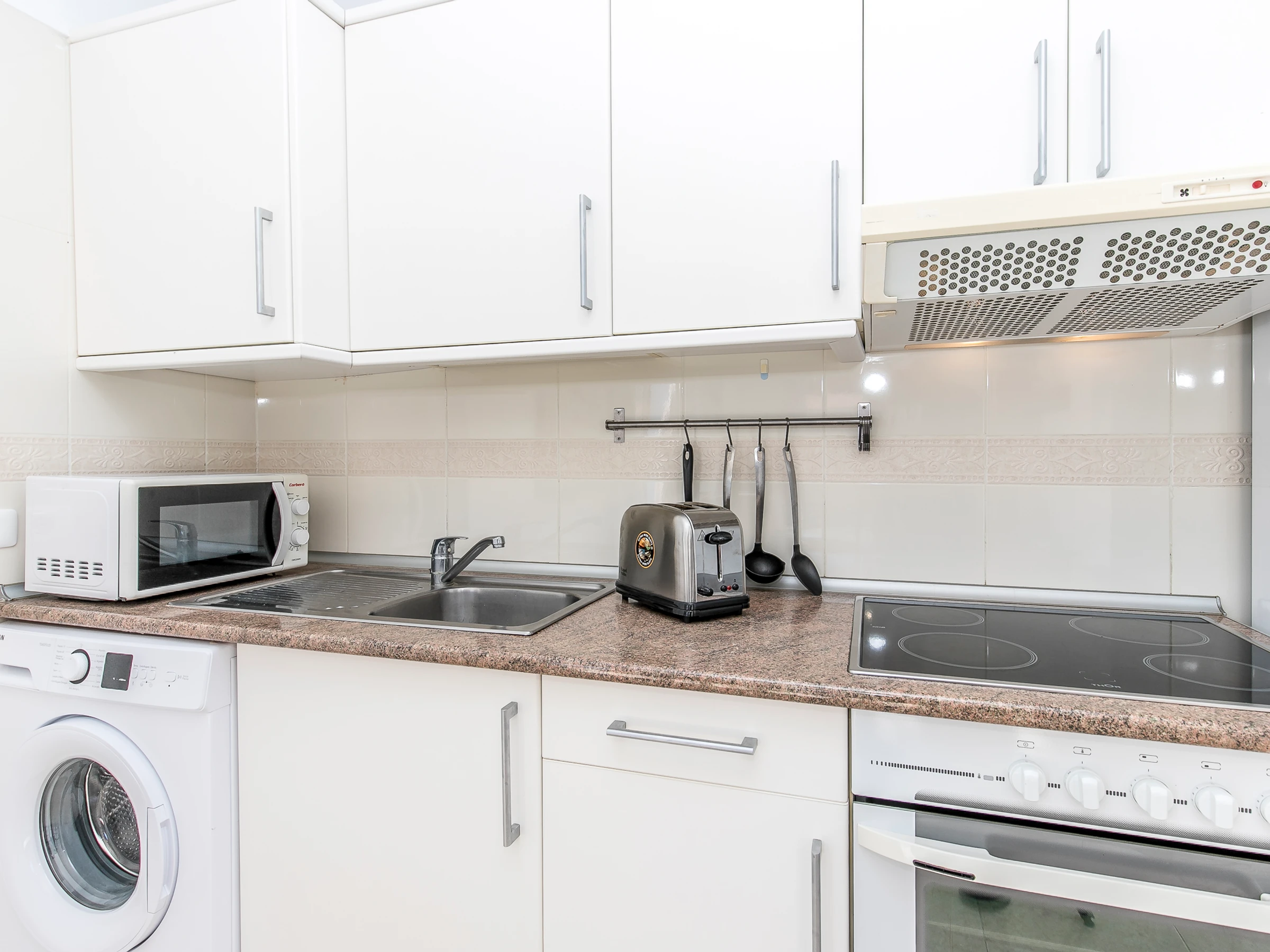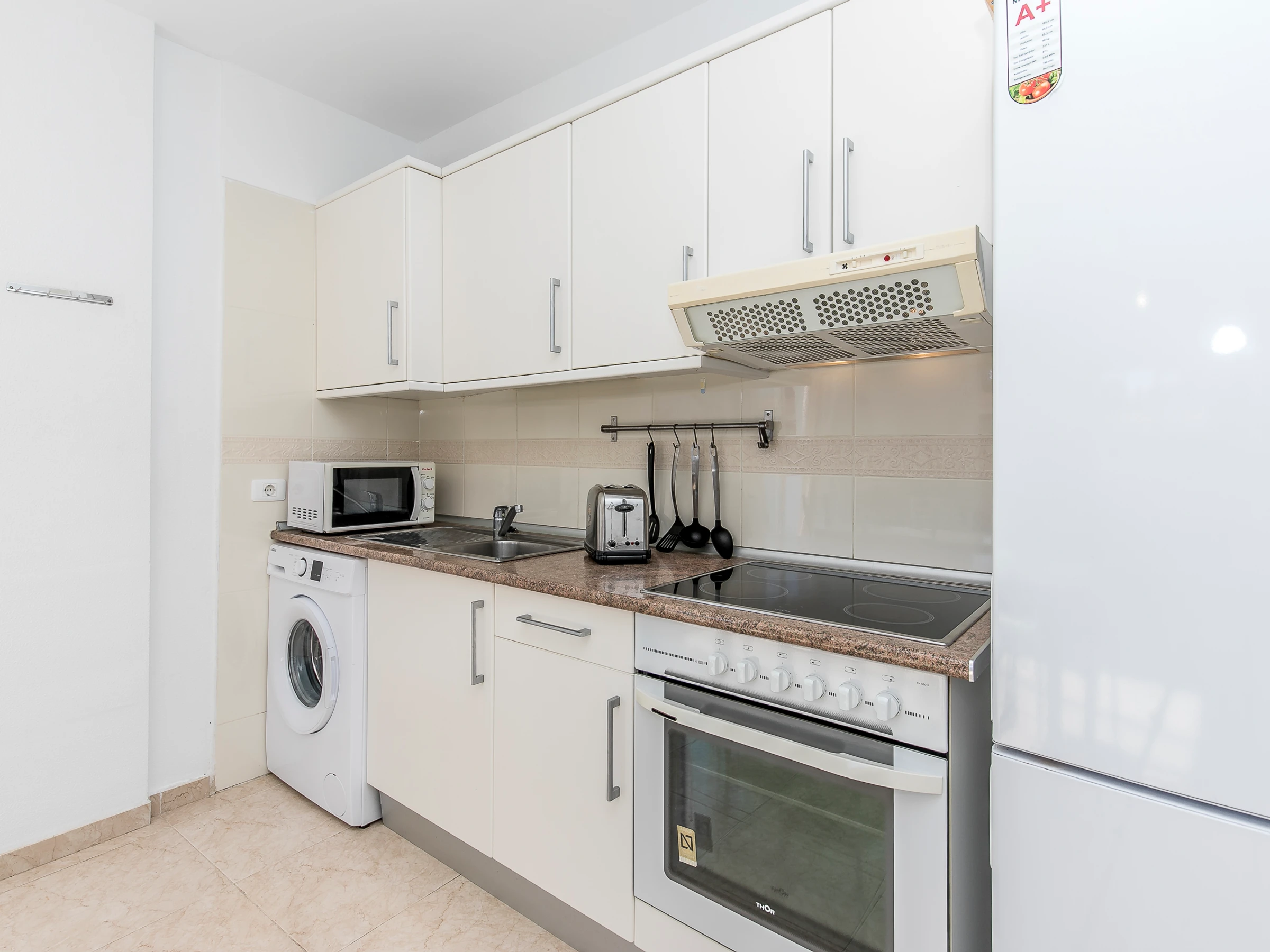 Dieses küche, ist ausgestattet in mikrowelle, backofen, kochutensilien und kaffeemaschine.
