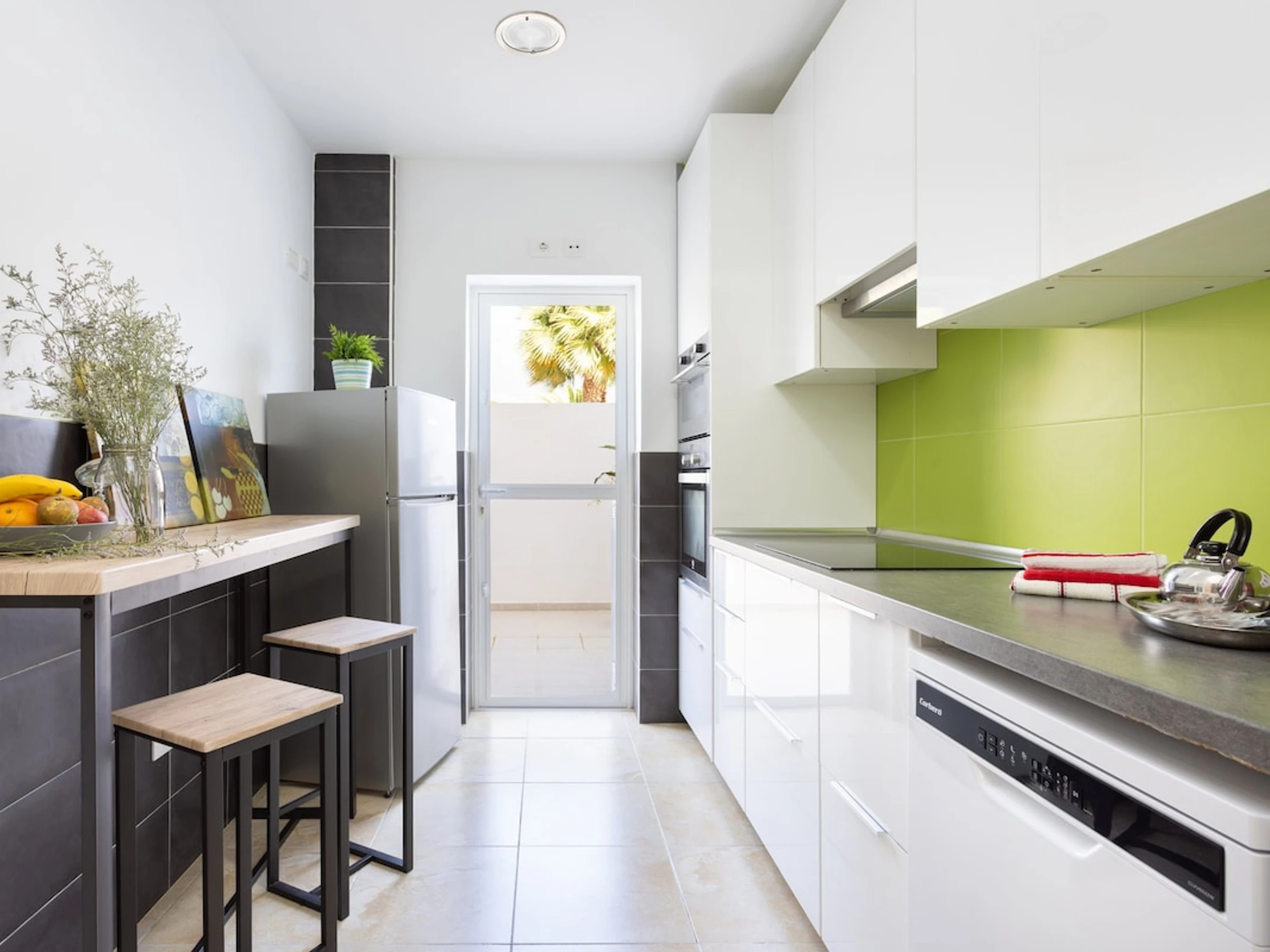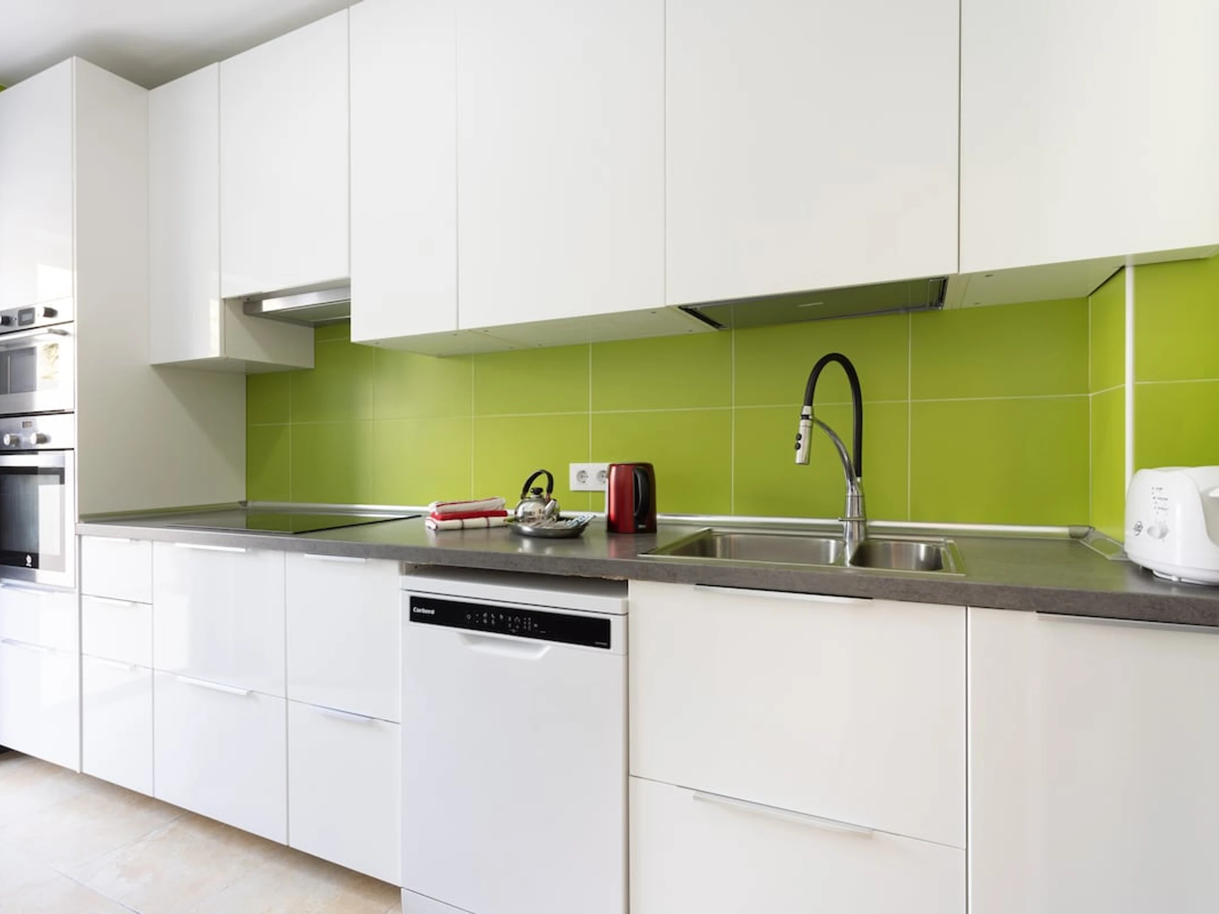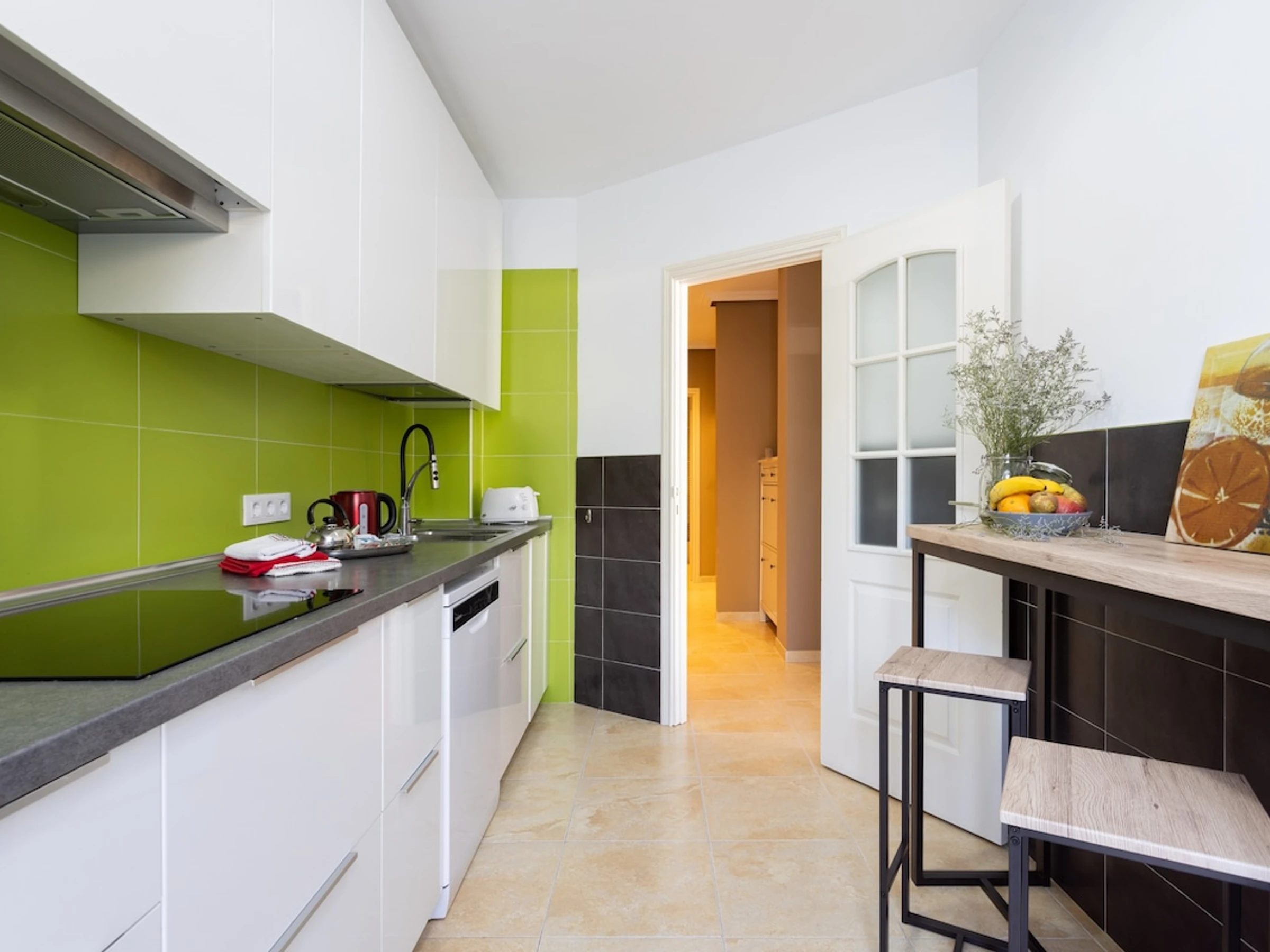 Dieses küche, ist ausgestattet in mikrowelle, backofen, spülmaschine, kochutensilien und kaffeemaschine.