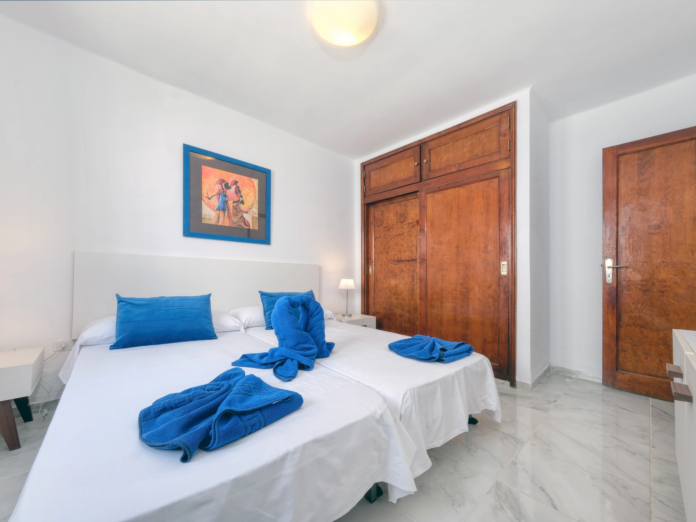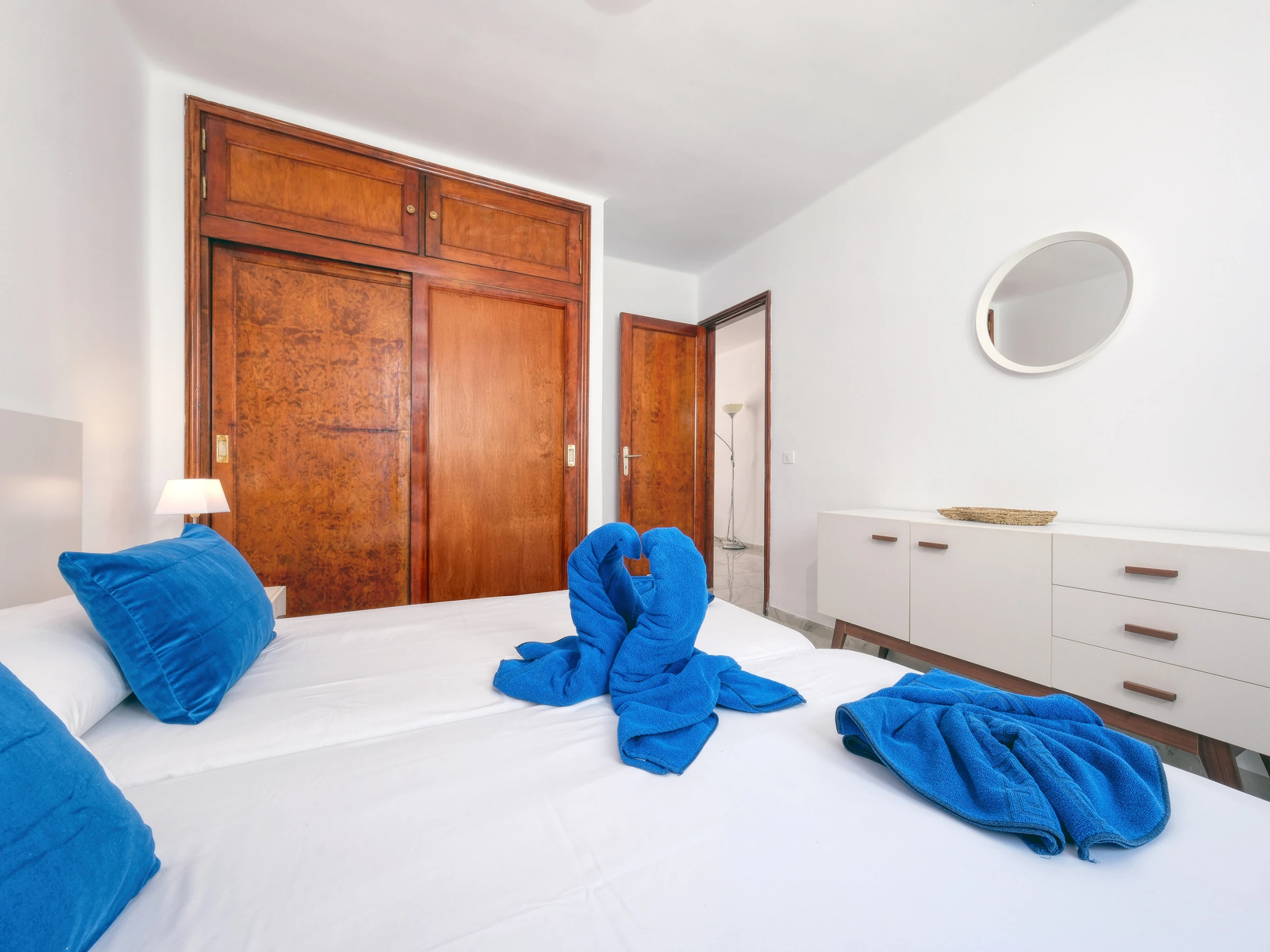 Die Unterkunft verfügt über ein geräumiges und komfortables Schlafzimmer, das mit zwei nebeneinander stehenden Einzelbetten, einem Einbauschrank und einer sorgfältigen Dekoration in Blautönen ausgestattet ist, die Frische, Ruhe und eine angenehme Küstenatmosphäre vermittelt.