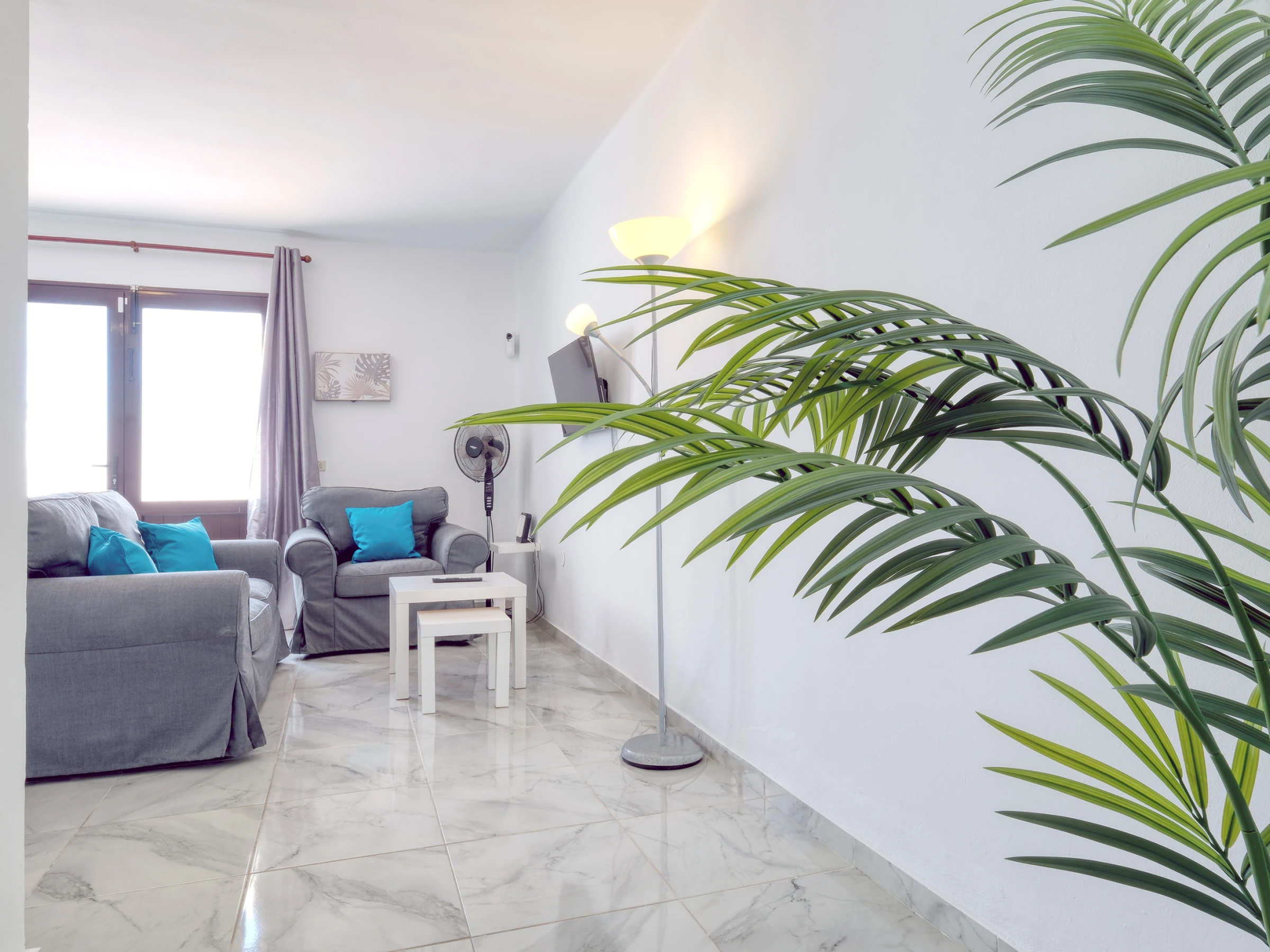 Der Salon bietet eine warme und entspannende Atmosphäre, perfekt zum Abschalten nach einem fantastischen Strandtag oder beim Erkunden der Gegend. Er verfügt über bequeme Sofas, einen Flachbildfernseher und einen Ventilator, der eine angenehme Temperatur garantiert. Die Essenszone, in denselben Raum integriert, ist ideal, um Mahlzeiten und besondere Momente zu teilen.