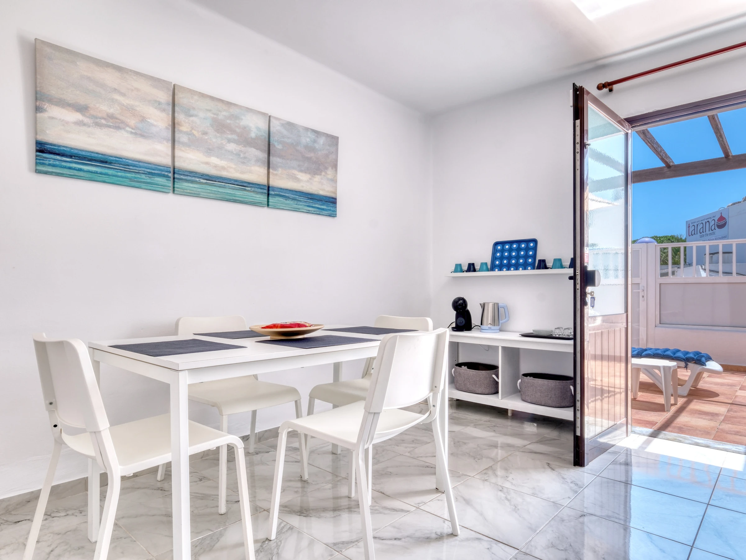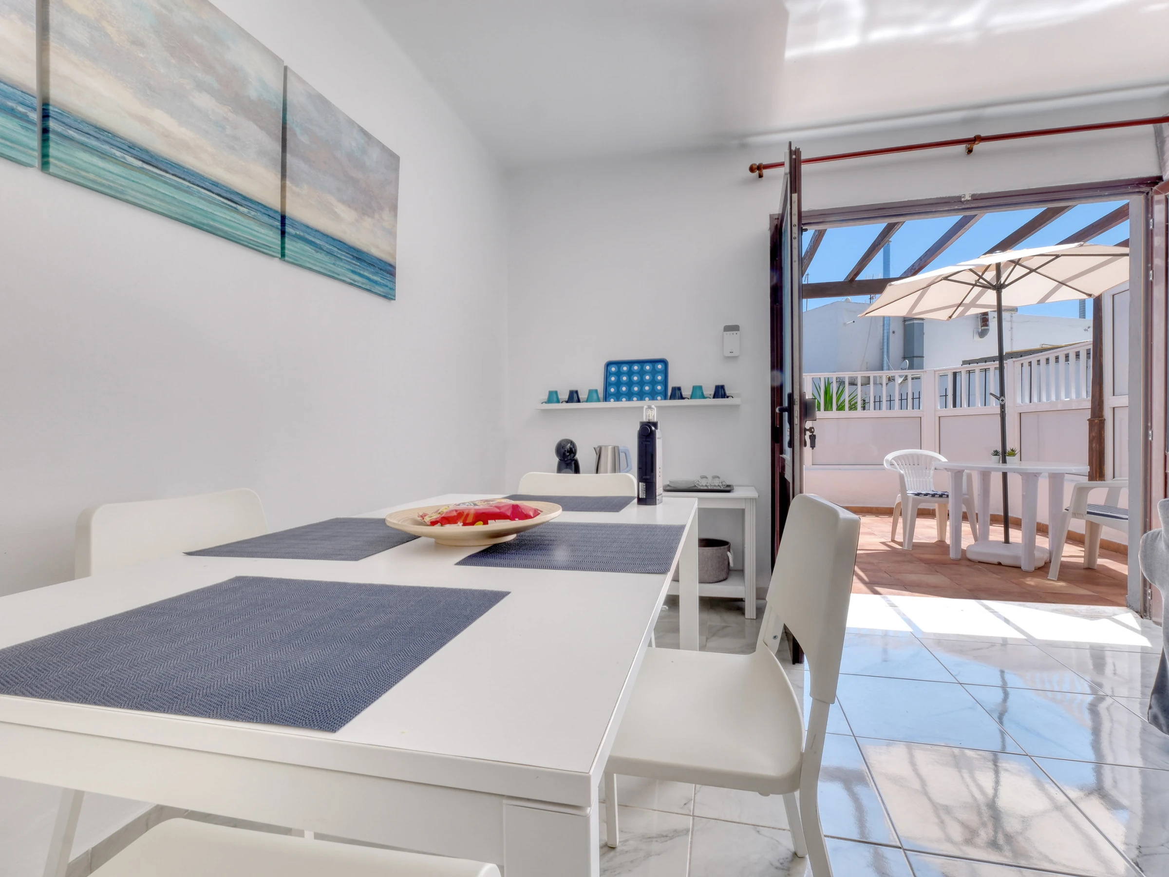 Eine der großen Attraktionen der Wohnung ist ihre private Terrasse, eine perfekte Ecke, um das Wetter und die Ruhe zu genießen. Sie ist mit zwei Hängematten ausgestattet, die ideal zum Sonnenbaden sind, sowie einem Tisch mit Sonnenschirm, an dem Sie Frühstück im Freien, einen Drink bei Sonnenuntergang oder Abendessen unter dem Sternenhimmel genießen können.