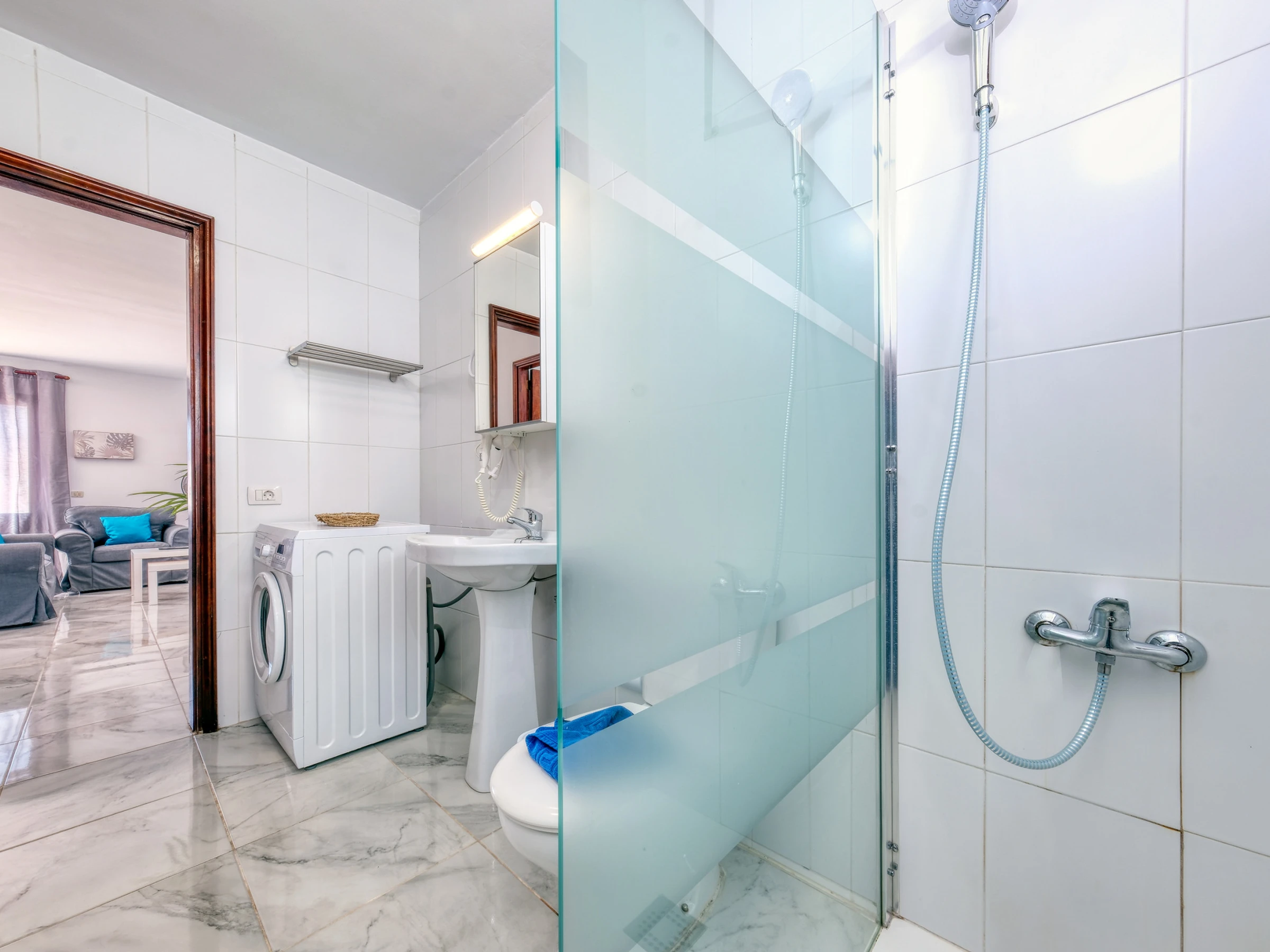 Das Badezimmer, modern und funktional, verfügt über eine Dusche, Haartrockner und Waschmaschine, konzipiert, um Ihnen während Ihres Aufenthalts alle Annehmlichkeiten des Zuhauses zu bieten.