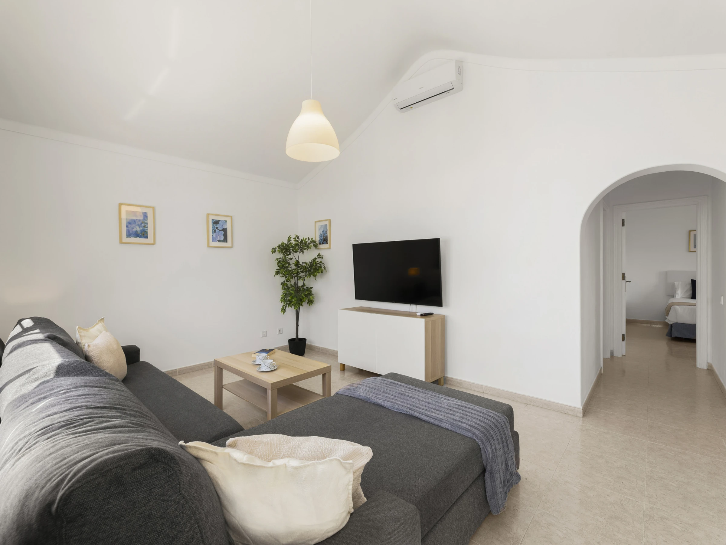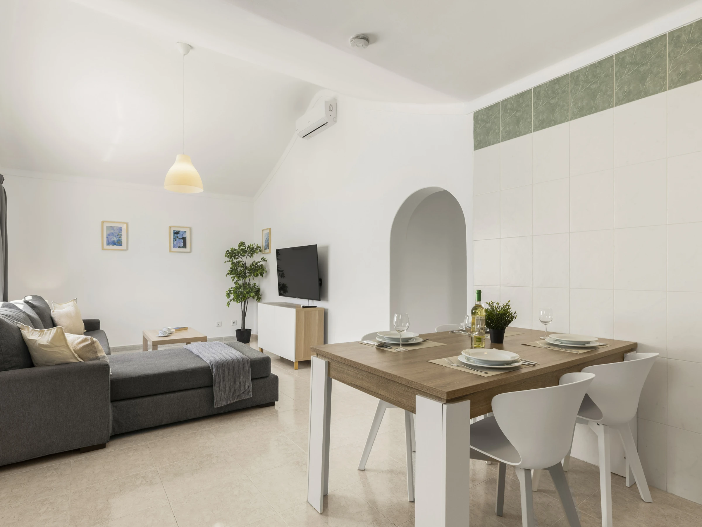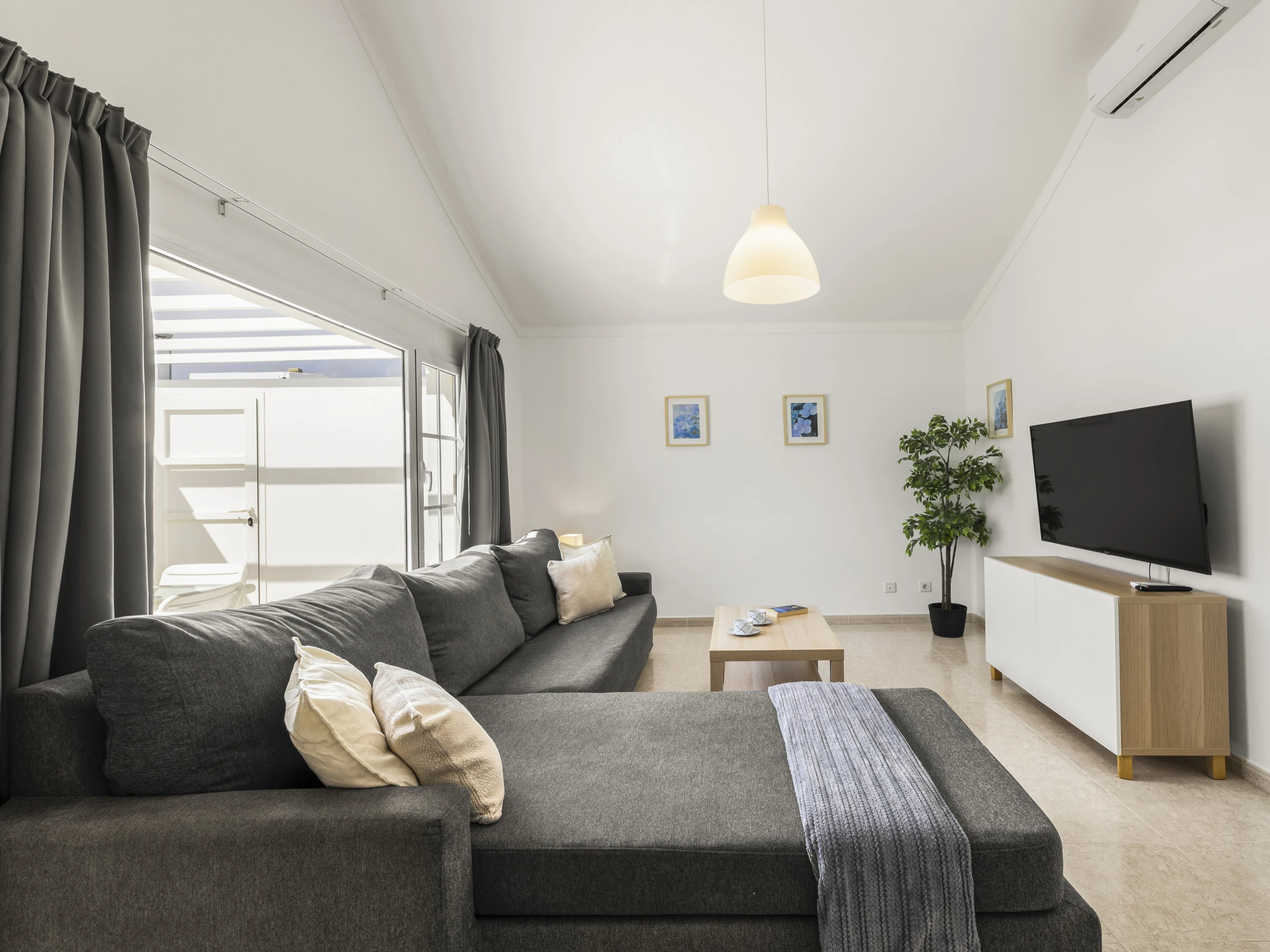 Der Wohnbereich verfügt über ein bequemes Sofa, Flachbild-TV und Zugang zur Terrasse im Freien mit Tisch und Stühlen sowie Sonnenliegen zum Sonnenbaden oder entspannten Lesen.