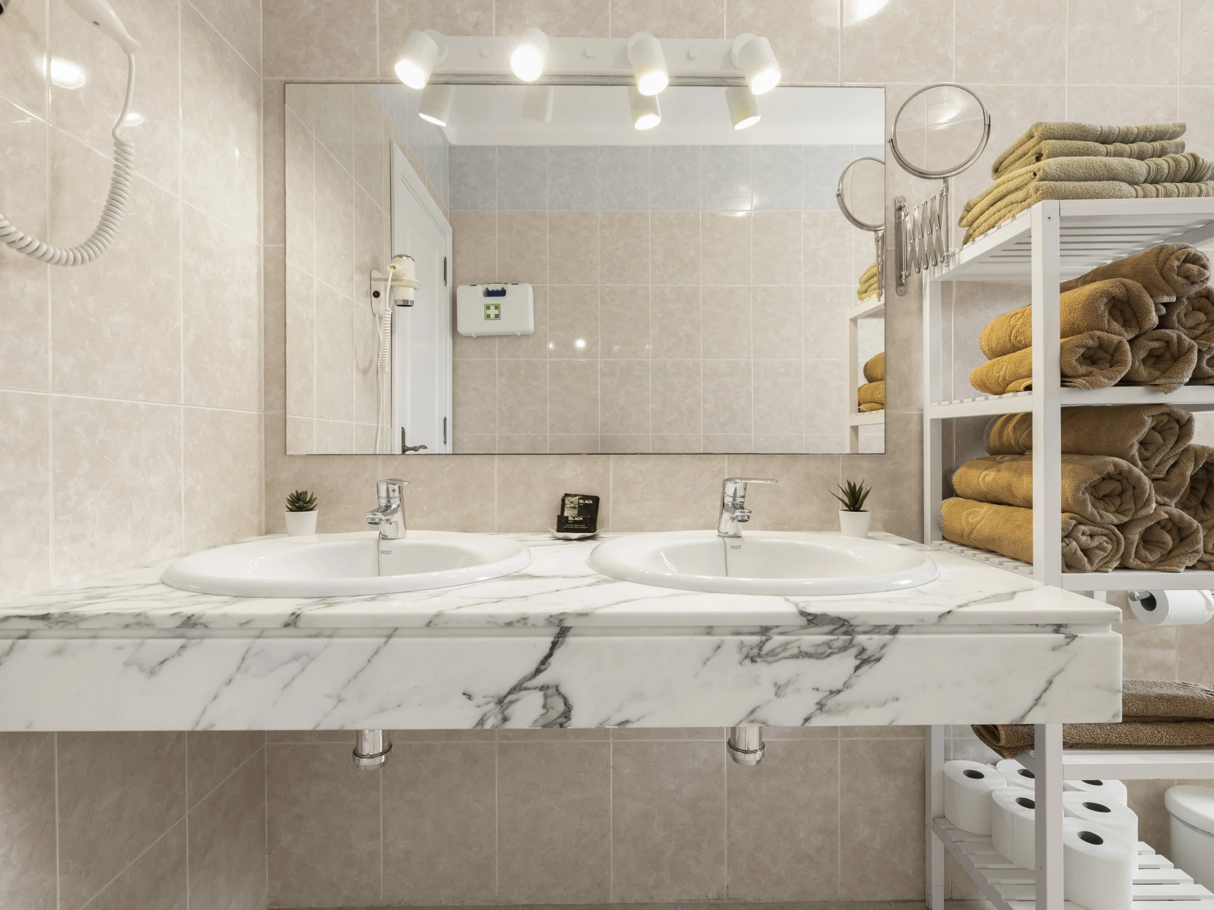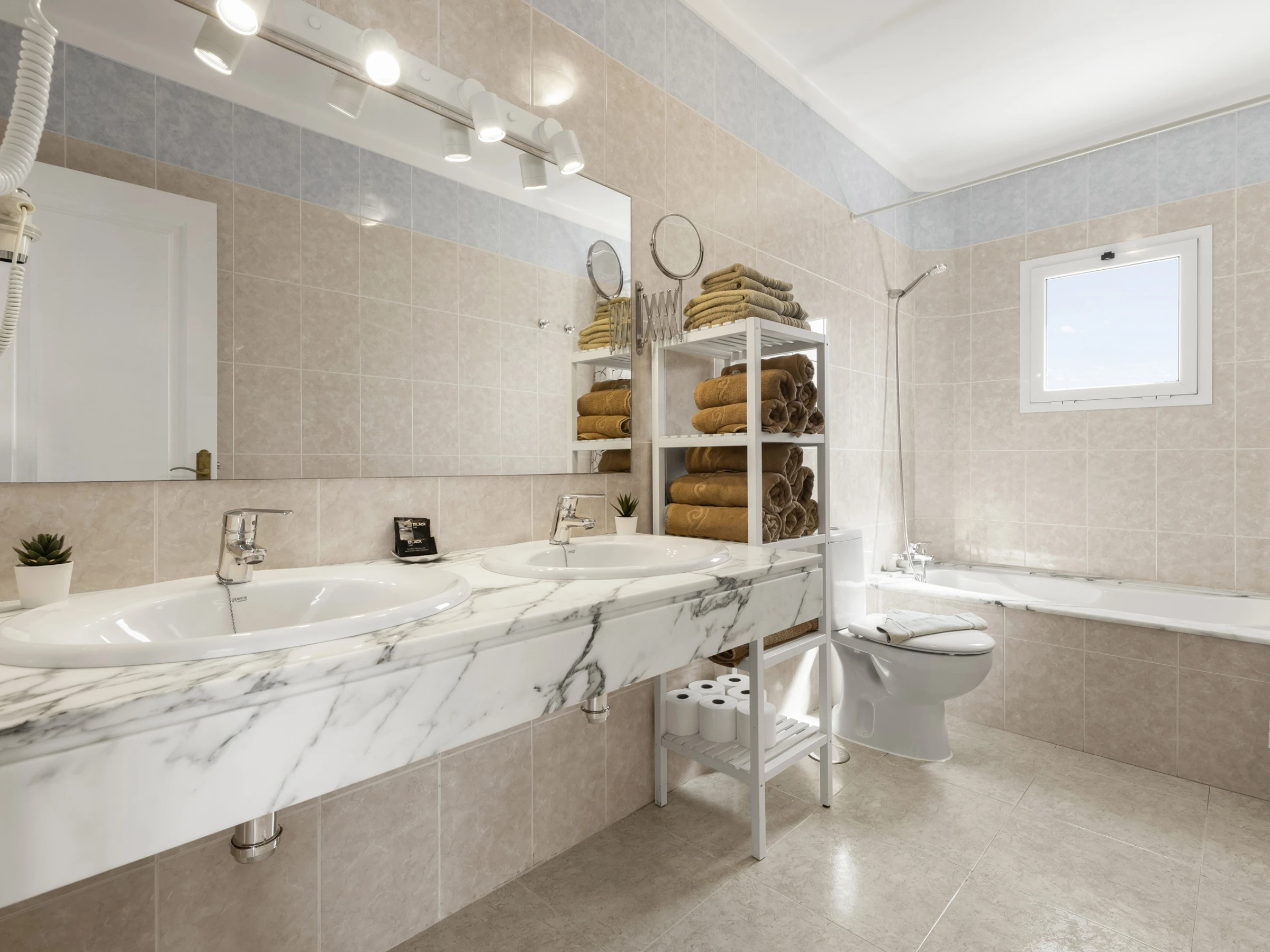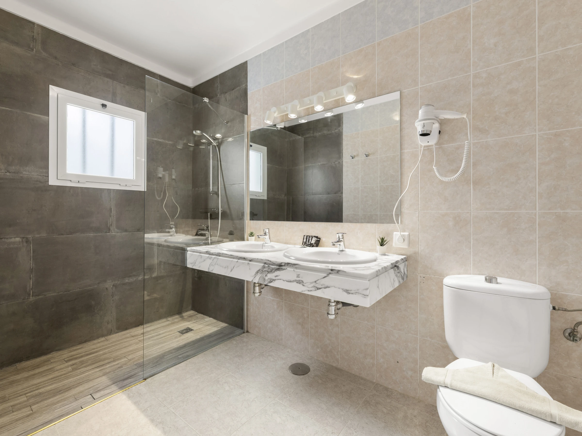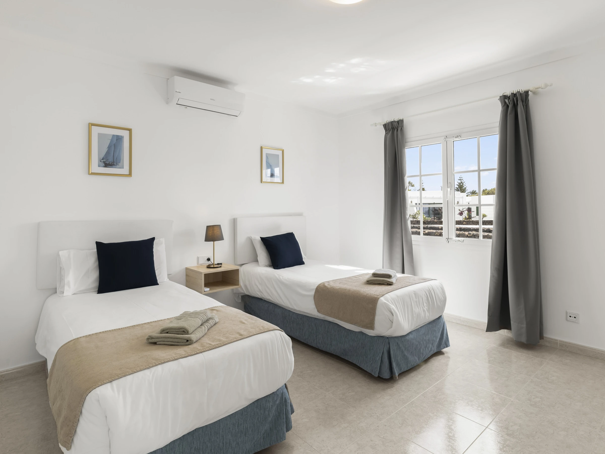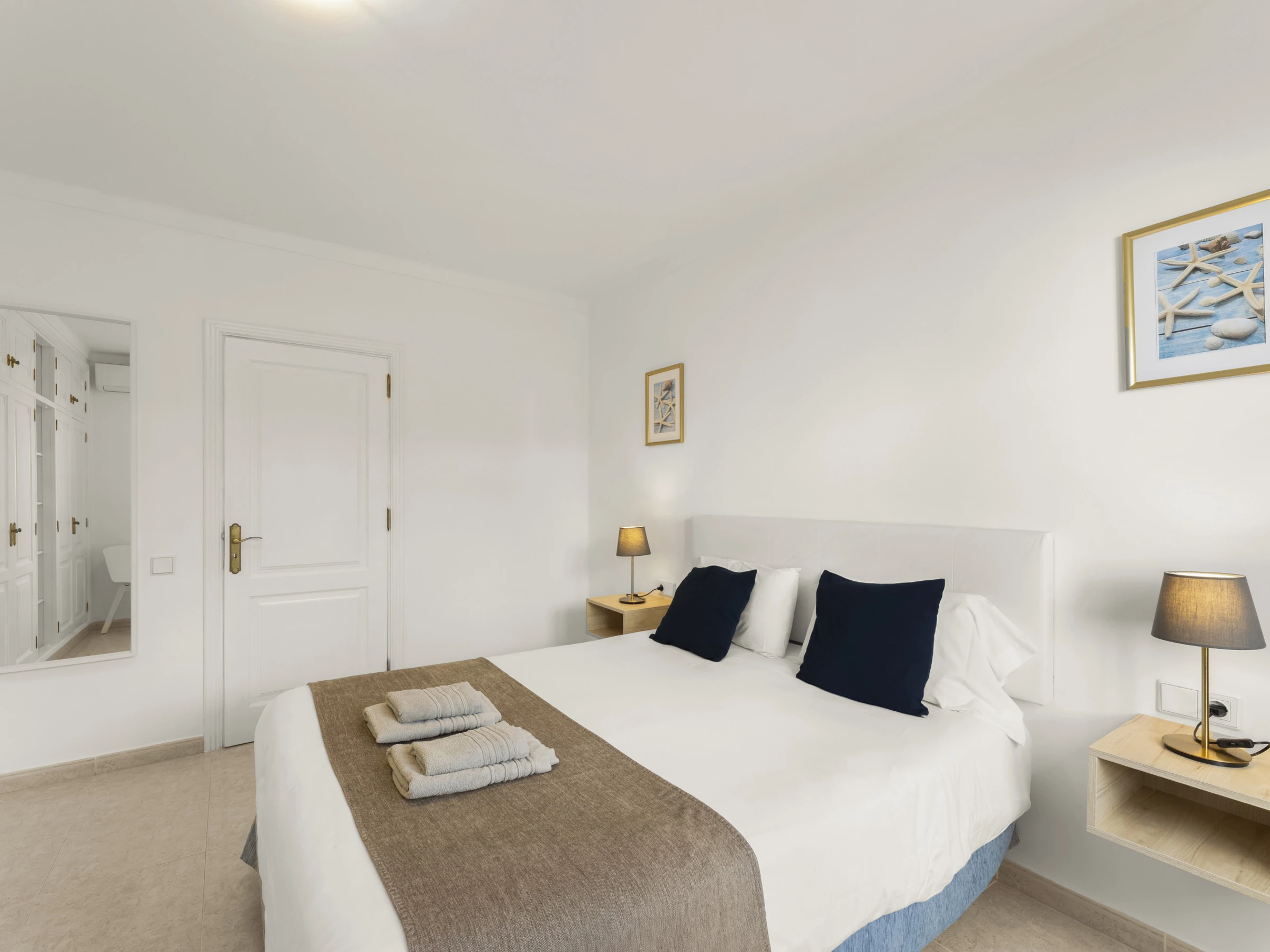Er besteht aus zwei geräumigen Schlafzimmern, eines mit Doppelbett und das andere mit zwei Einzelbetten, zwei Badezimmern (eines davon en suite), großen eingebauten Schränken, ruhiger und eleganter Einrichtung.