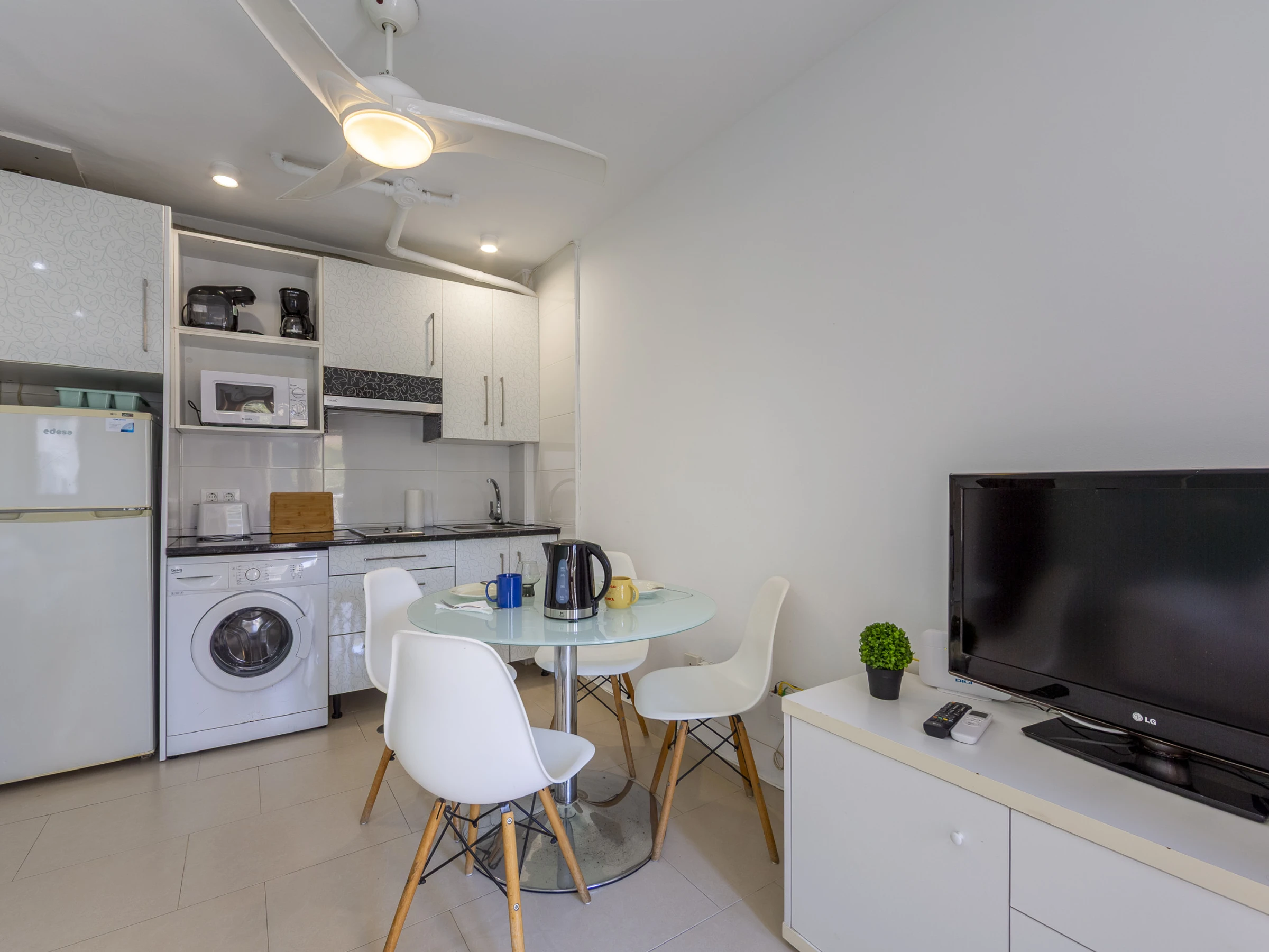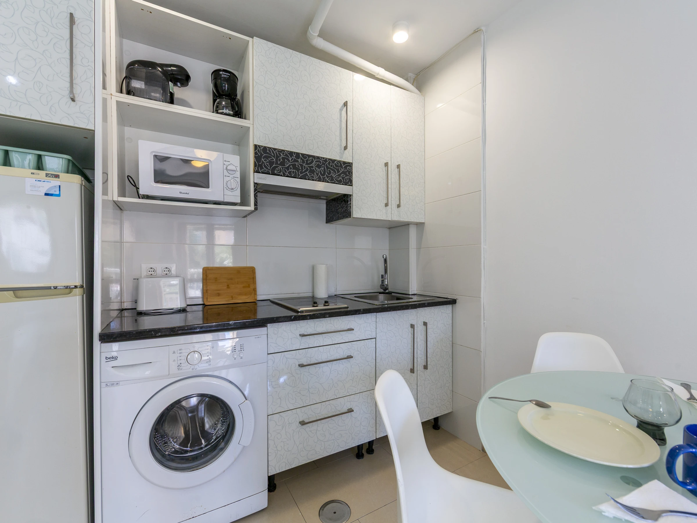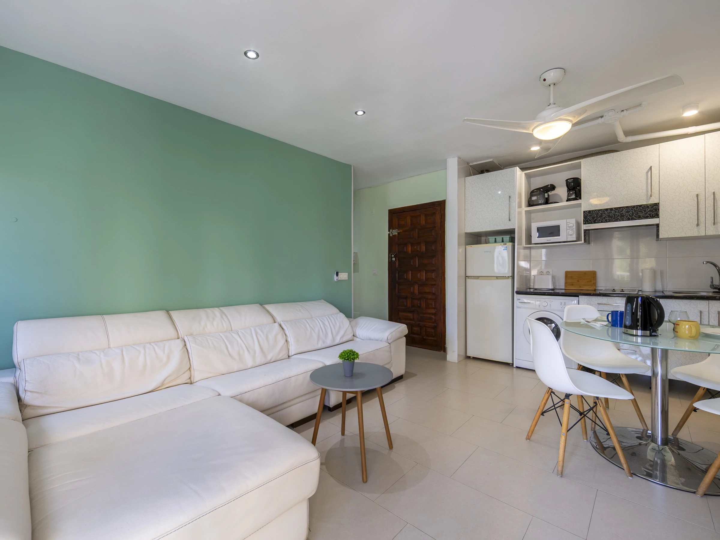 Dieses offene küche, mit ceranfeld, ist ausgestattet in kühlschrank, mikrowelle, gefrierschrank, geschirr/besteck, kochutensilien, kaffeemaschine, toaster und wasserkocher.