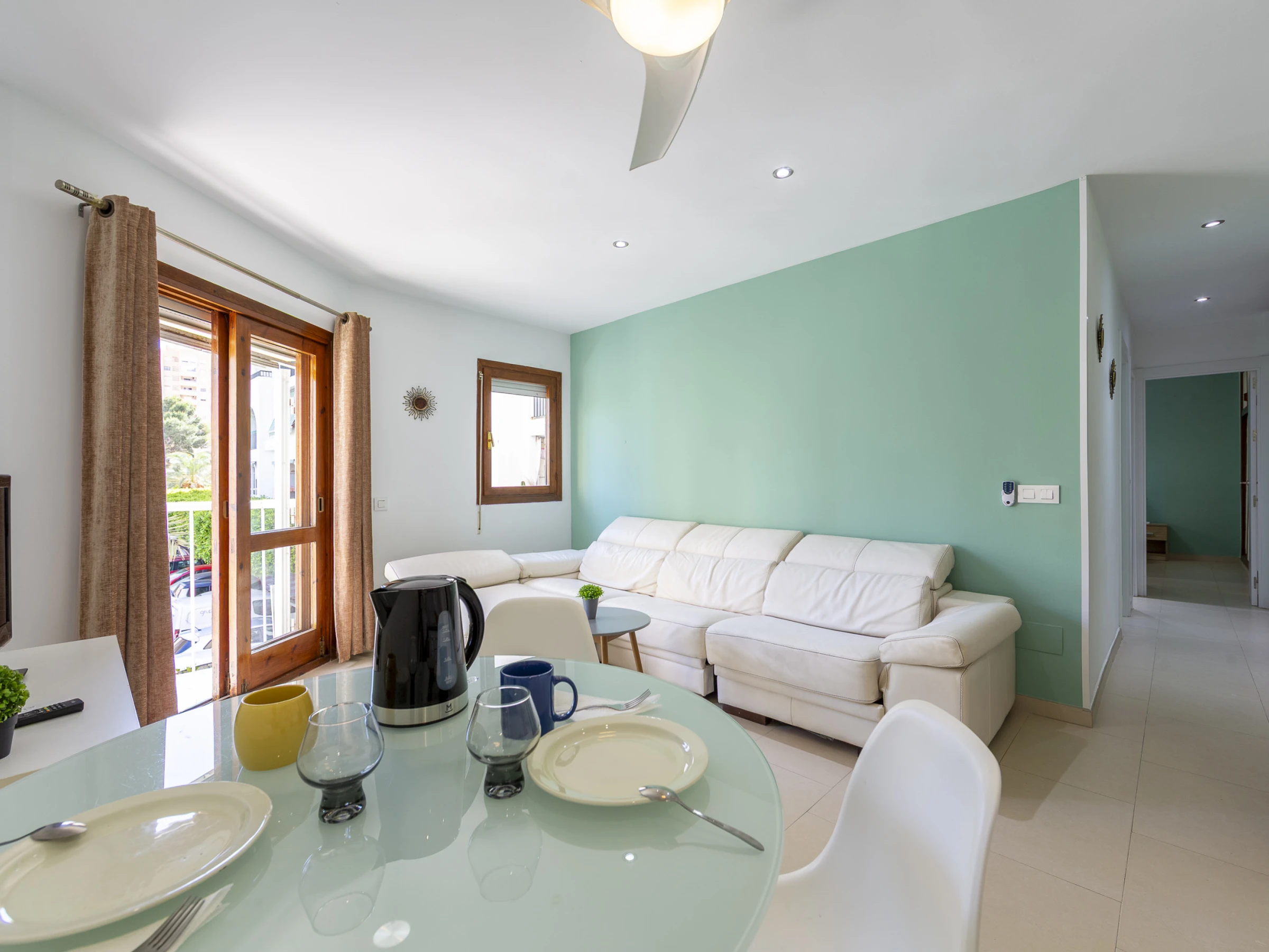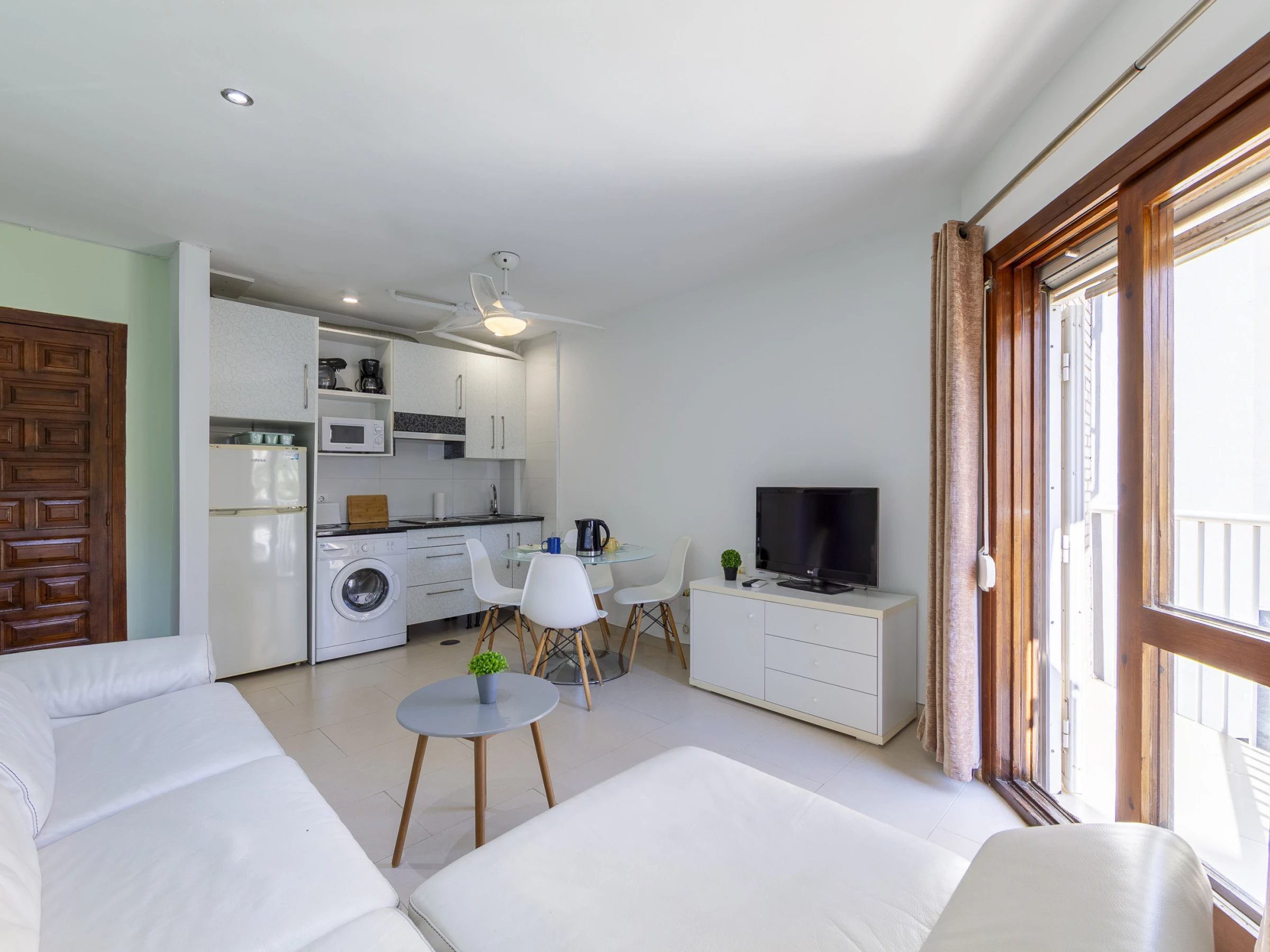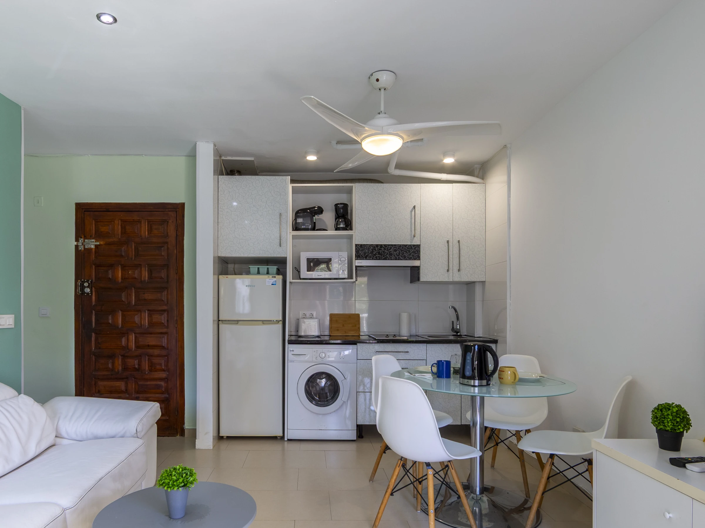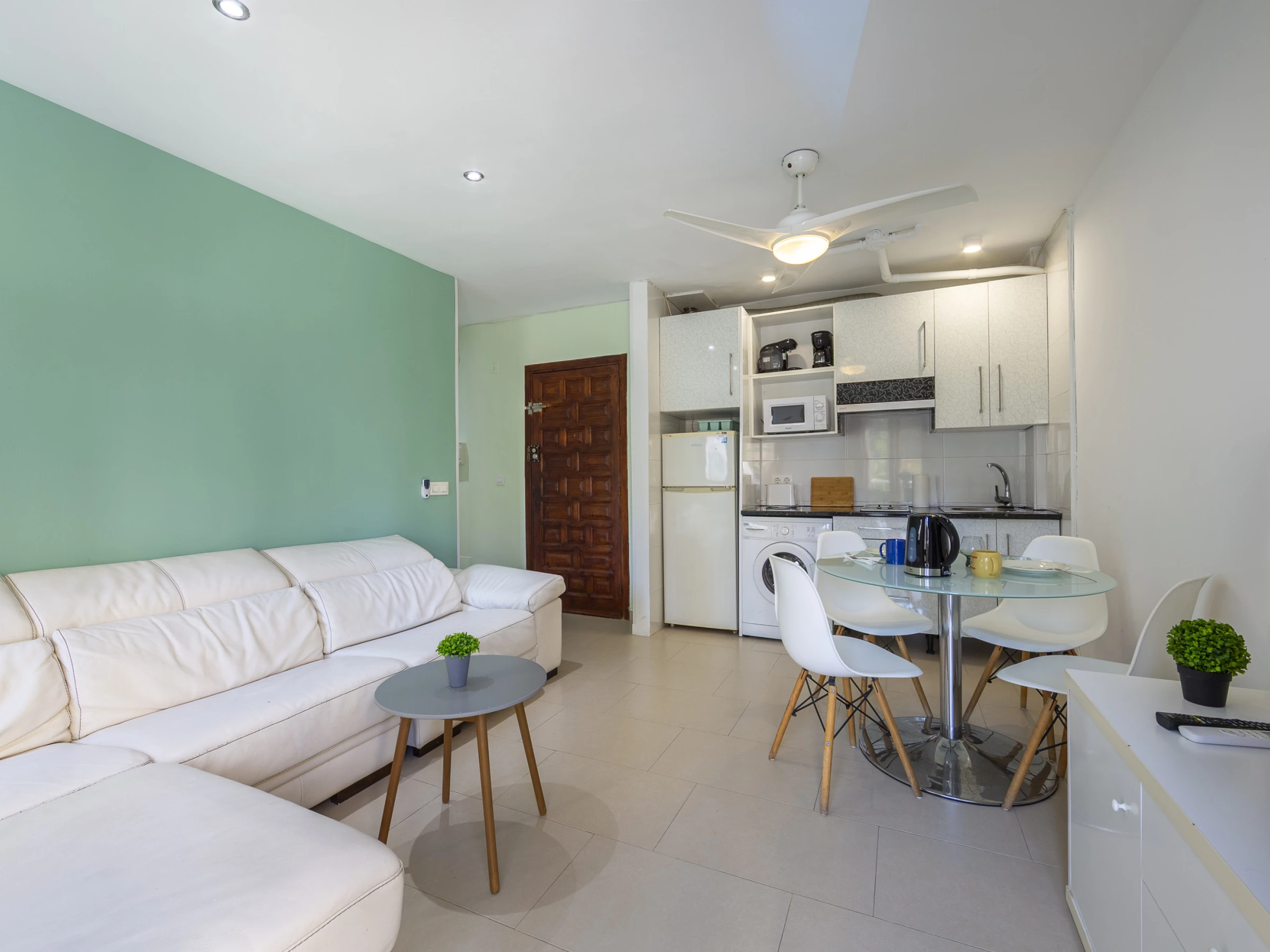 Dieses offene küche, mit ceranfeld, ist ausgestattet in kühlschrank, mikrowelle, gefrierschrank, geschirr/besteck, kochutensilien, kaffeemaschine, toaster und wasserkocher.