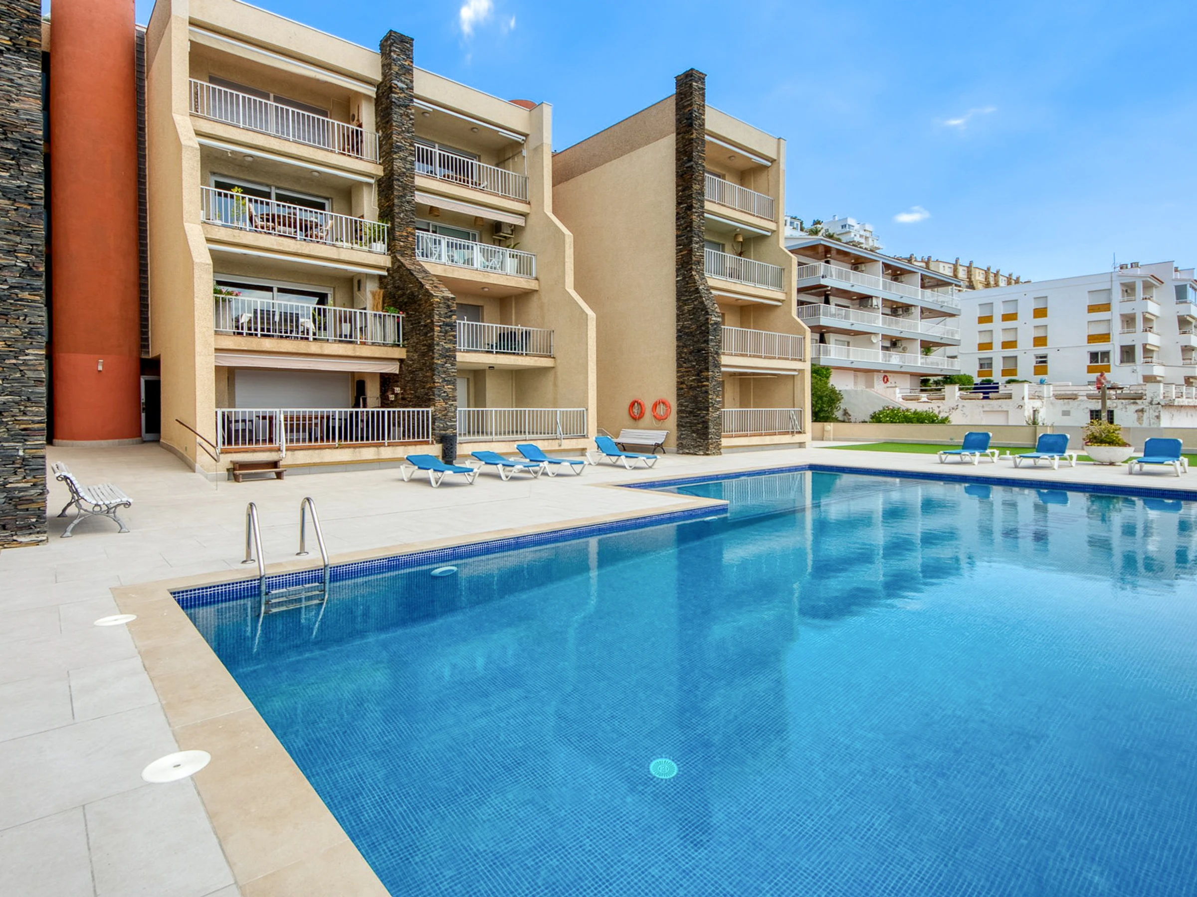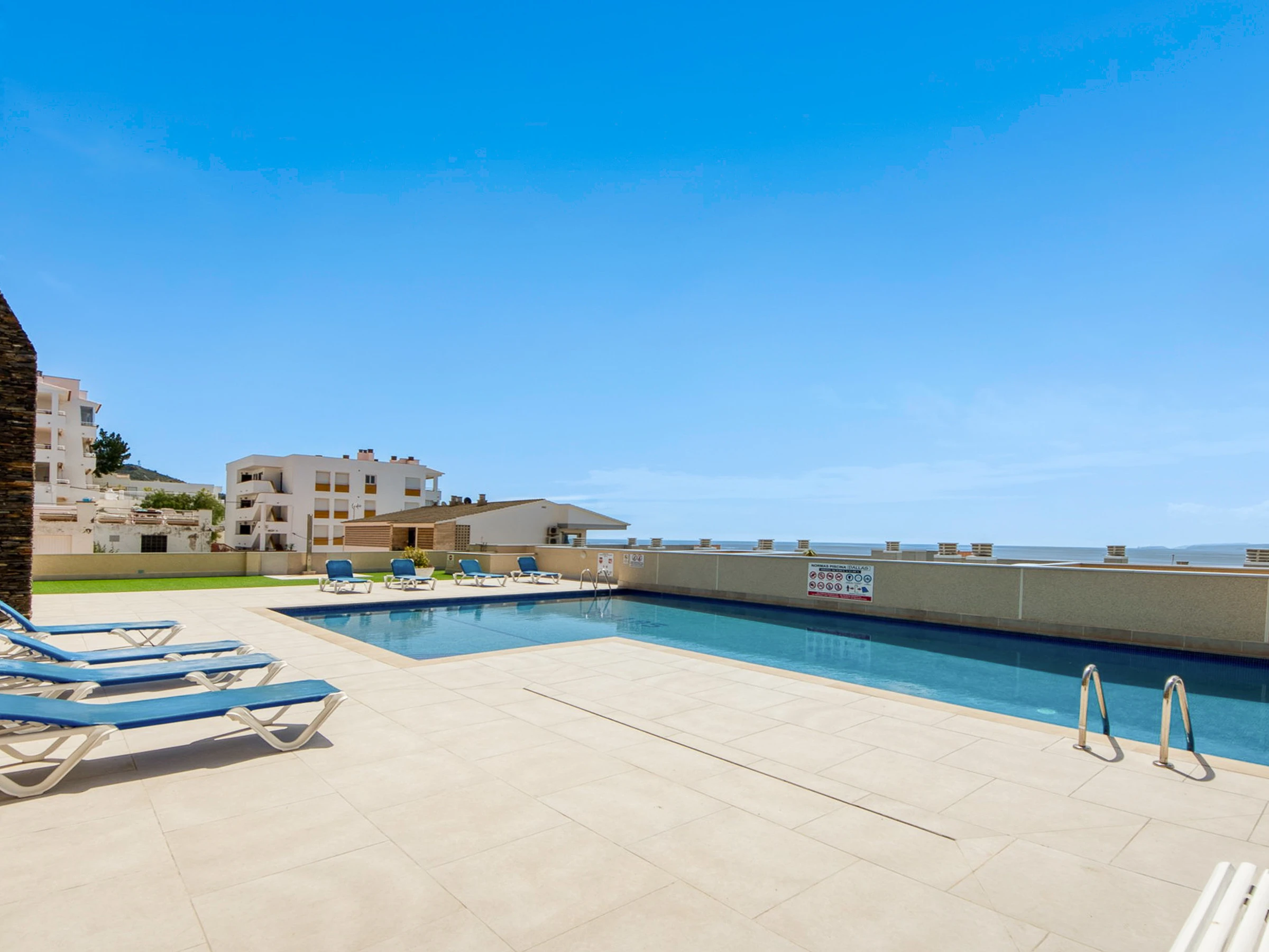 Die Wohnung befindet sich im zweiten Stock und bietet direkten Zugang zum Pool, ideal für einen Familienurlaub.