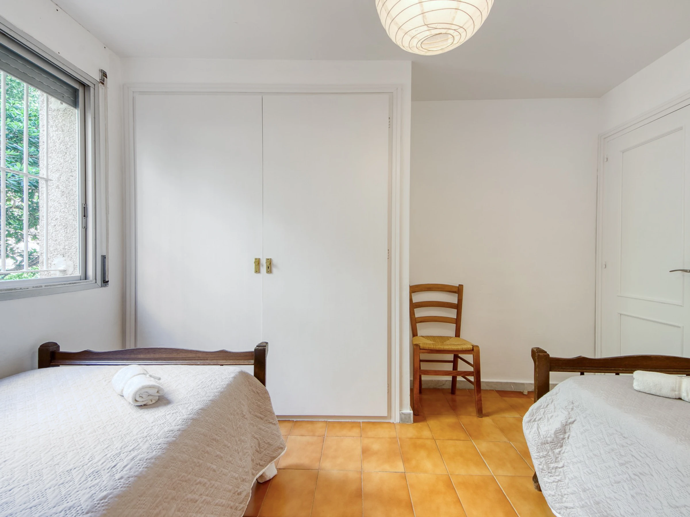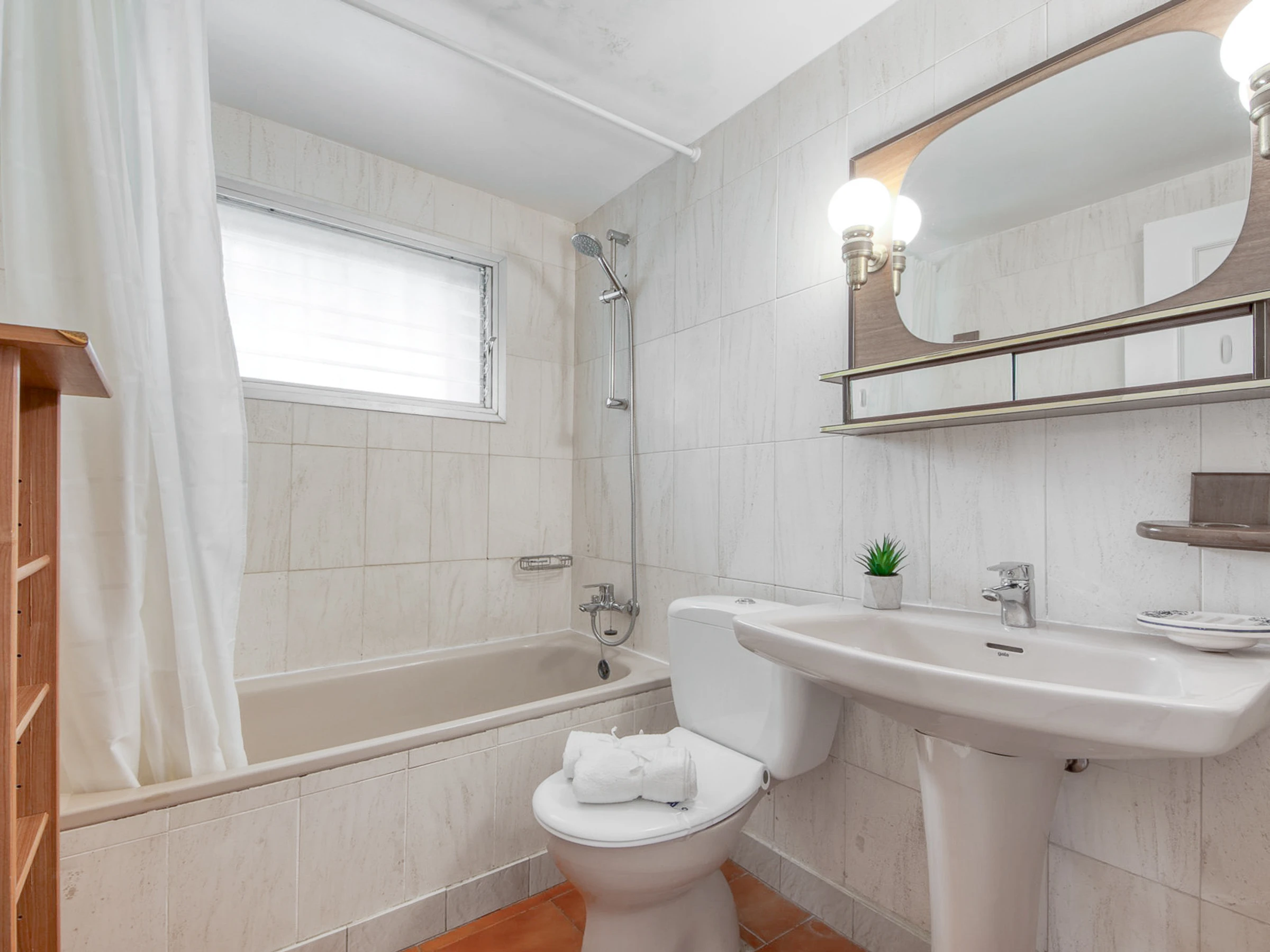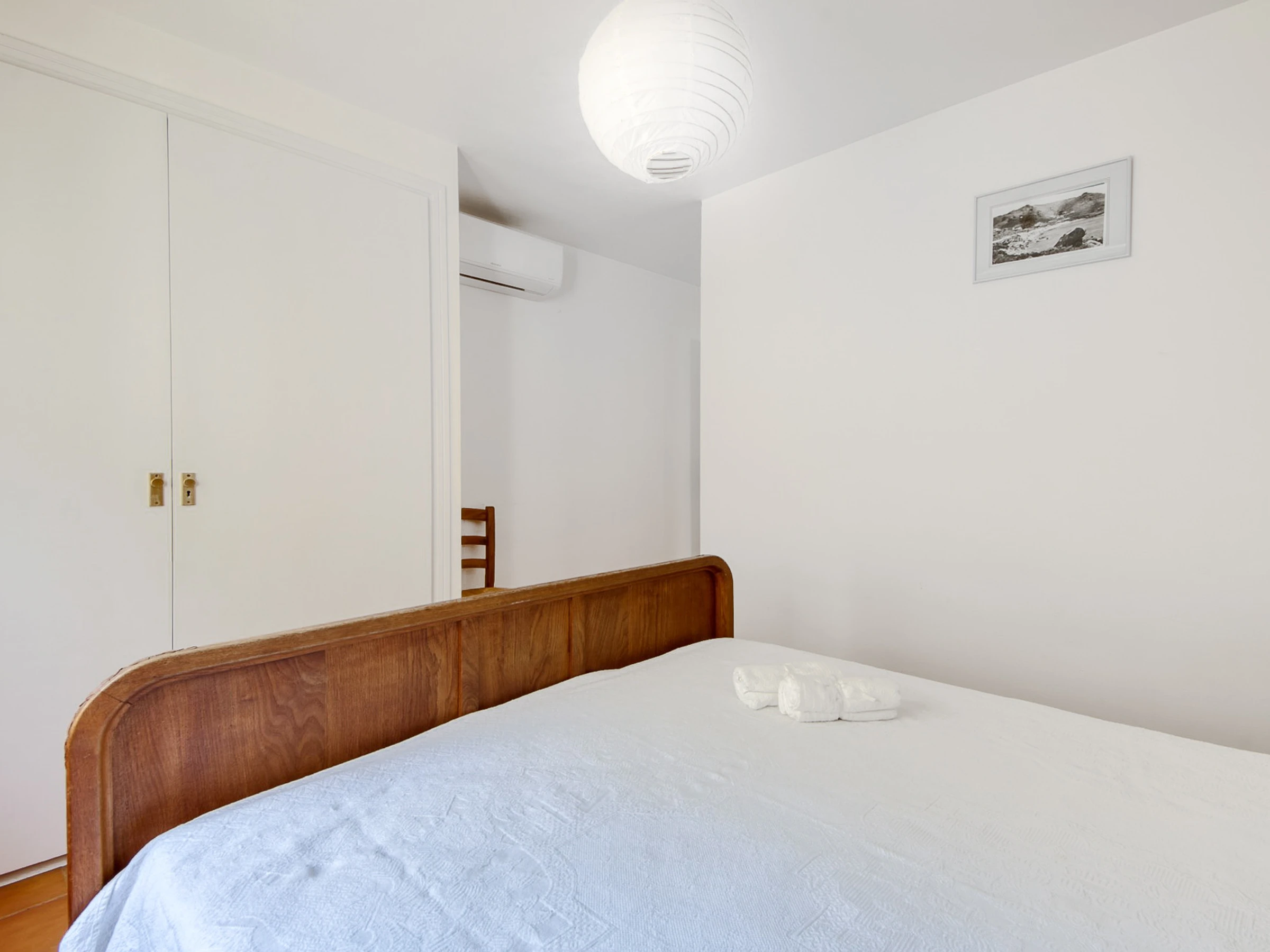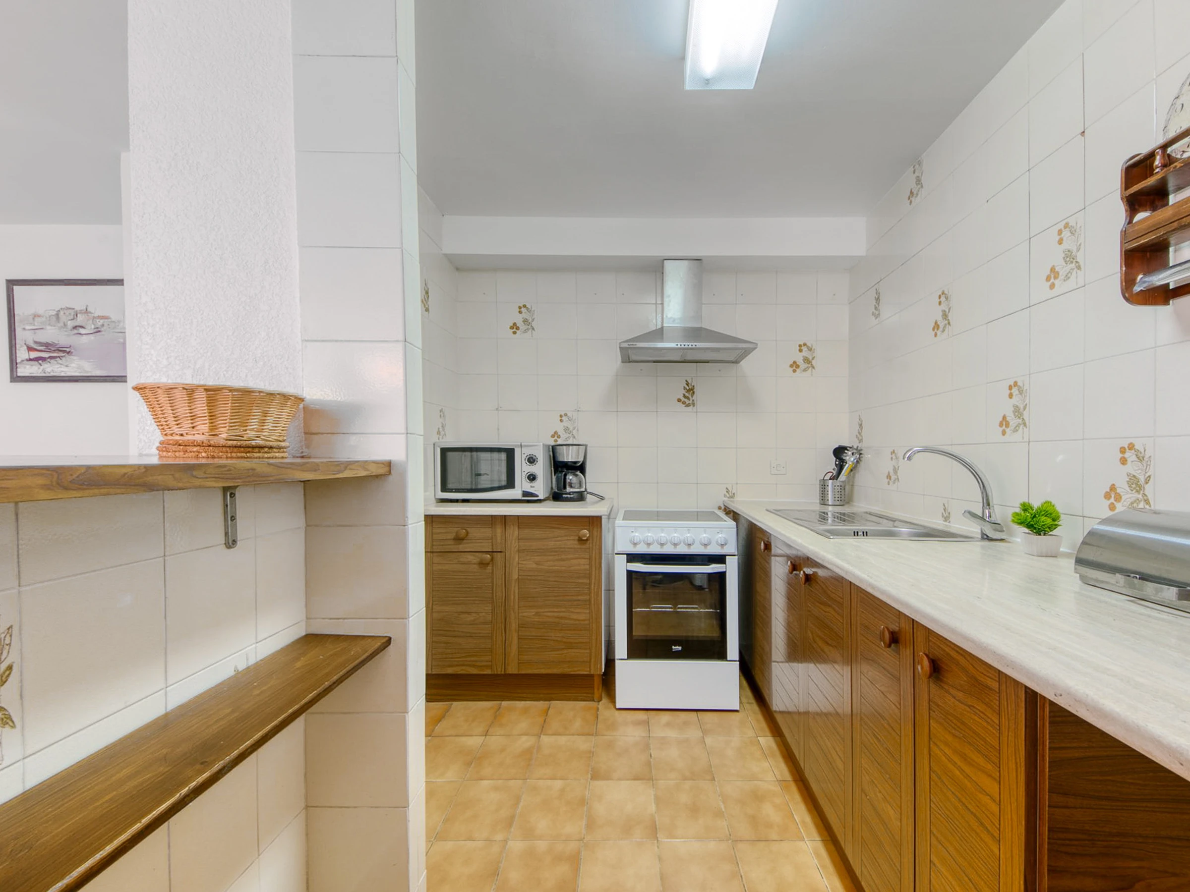 In der Wohnung befindet sich die voll ausgestattete Küche, gefolgt von der Waschküche mit Waschmaschine und Geschirrspüler. Dann gibt es ein Badezimmer mit Dusche, ein Schlafzimmer mit einem Doppelbett und Einbauschränken, ein Schlafzimmer mit zwei Einzelbetten und Einbauschränken, schließlich gibt es das Hauptschlafzimmer mit einem großen Doppelbett mit Einbauschränken und einem Badezimmer; Alle Teile haben Fenster.