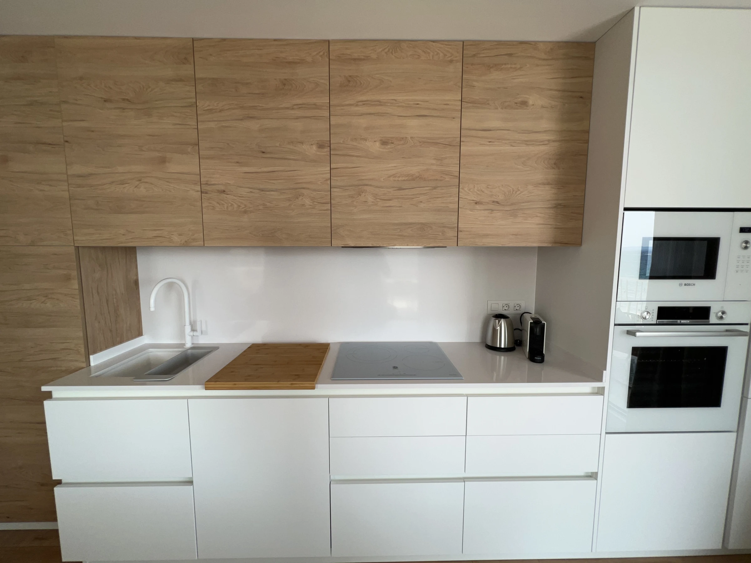 Im Wohnzimmer finden wir ein Schlafsofa und eine voll ausgestattete Küchenzeile mit Geschirrspüler, Mikrowelle, Kaffeemaschine, Kühlschrank, Gefrierschrank und Induktionskochfeld.