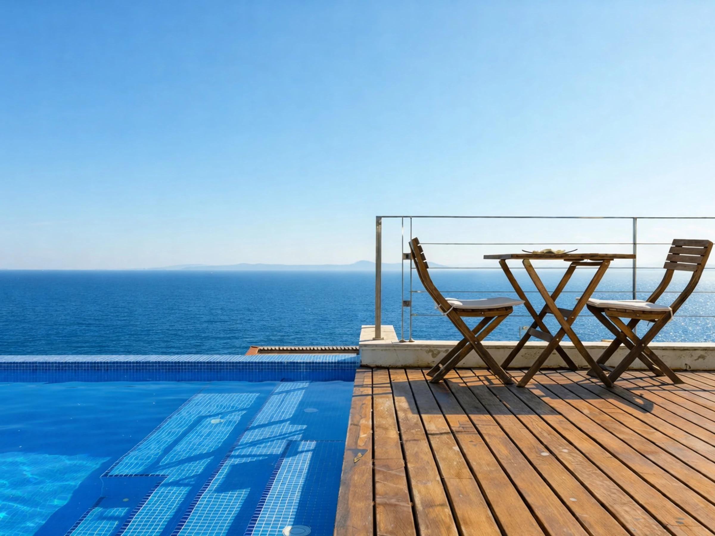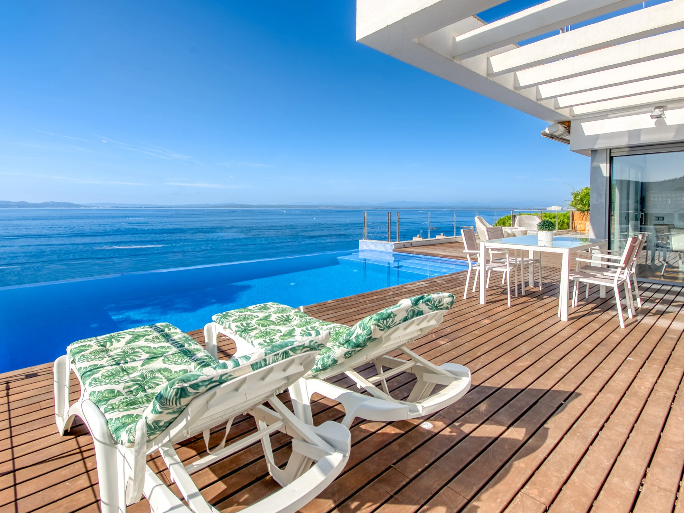 Der Salon-Esszimmer, geräumig und sehr hell, verfügt über große Fenster, die es ermöglichen, das Meer von innen zu genießen und direkten Zugang zu einer großen Terrasse mit Gartenmöbeln und zum privaten unendlichen Salzwasserpool bieten, der perfekt ist, um sich zu entspannen, während die Kleinsten das Wasser genießen.