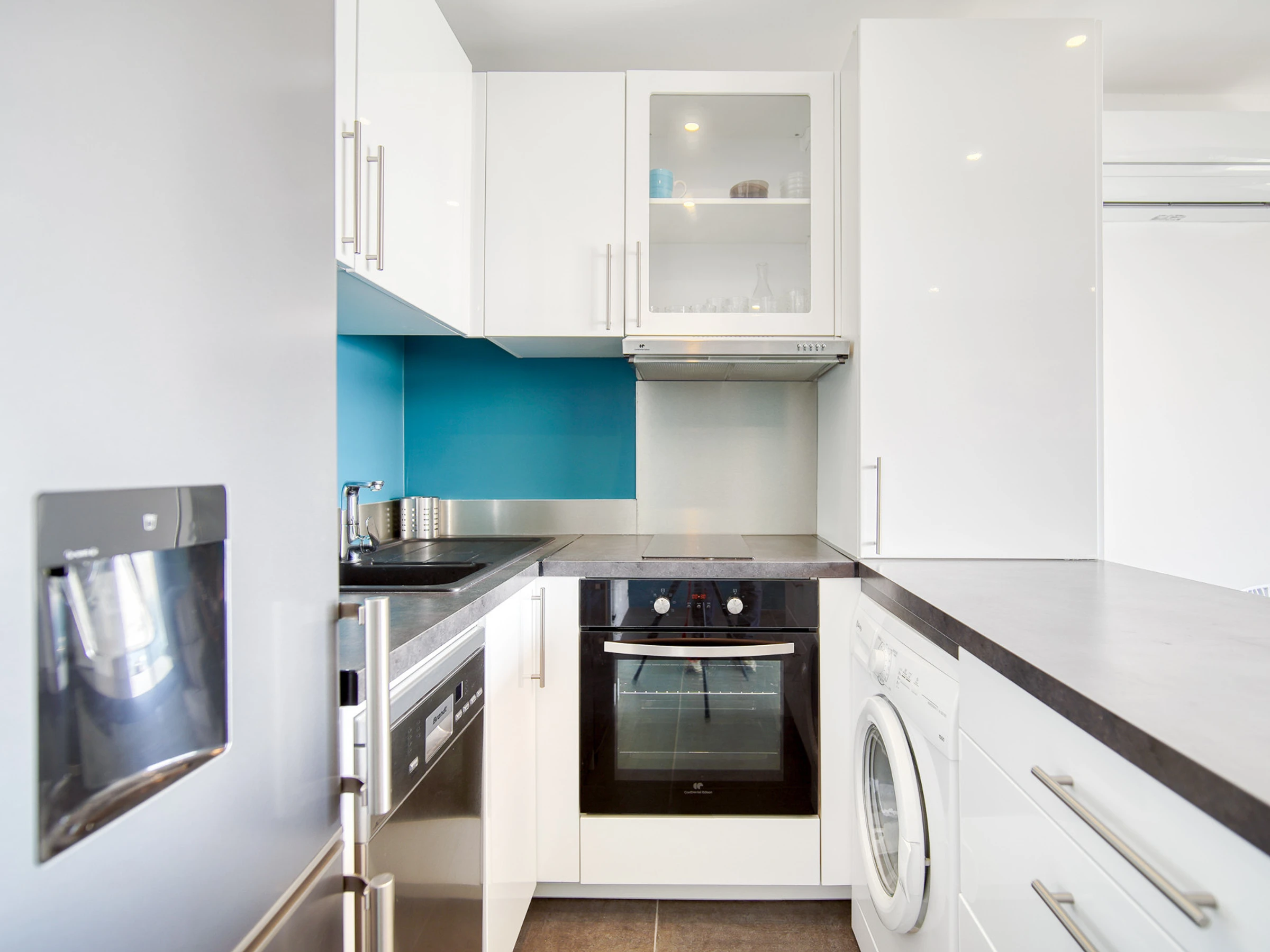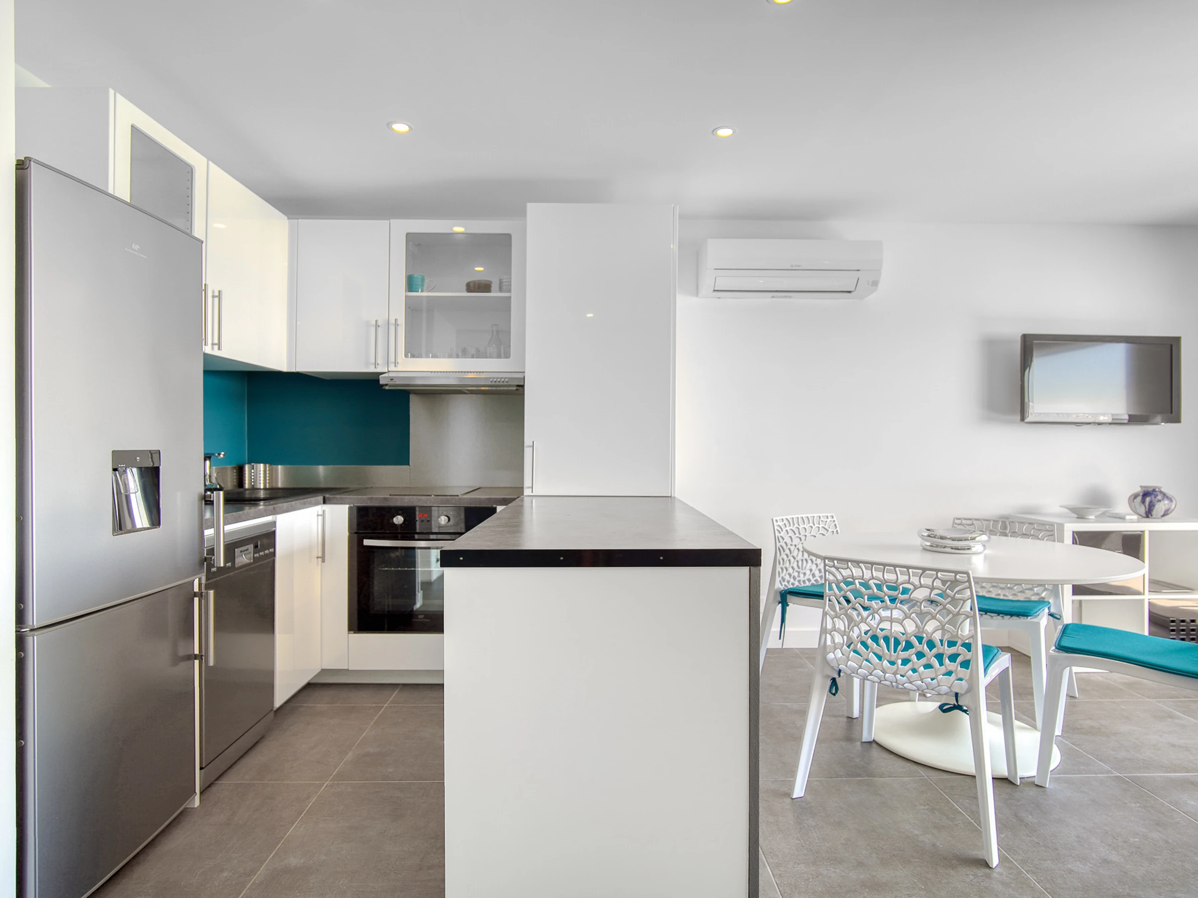 Die amerikanische Küche ist komplett ausgestattet mit Kühlschrank, Mikrowelle, Ofen, Geschirrspüler, Geschirr, Besteck, Küchenutensilien und Kaffeemaschine.