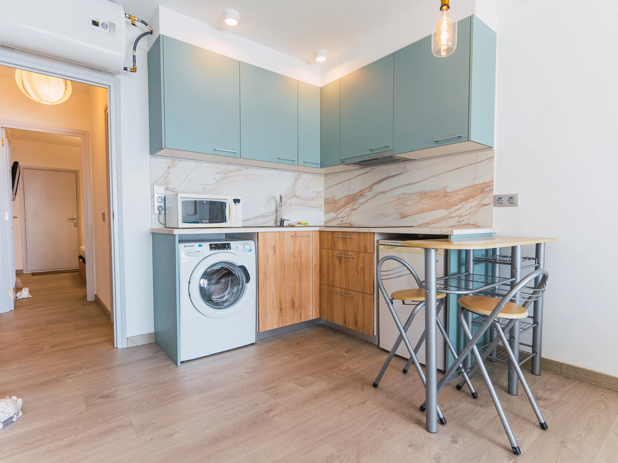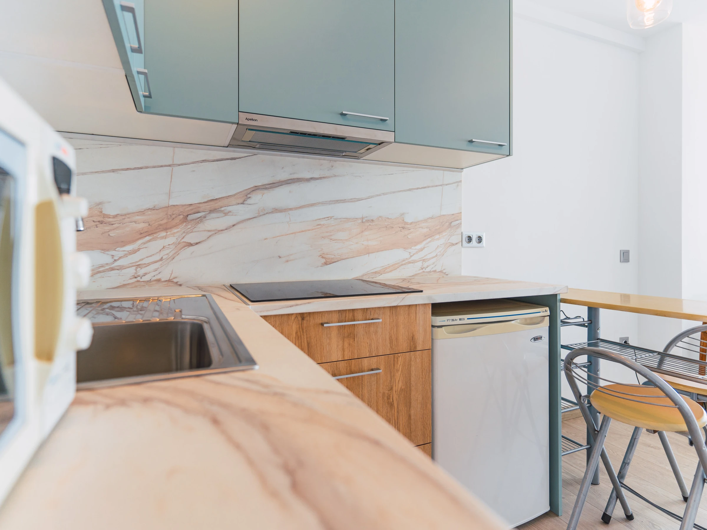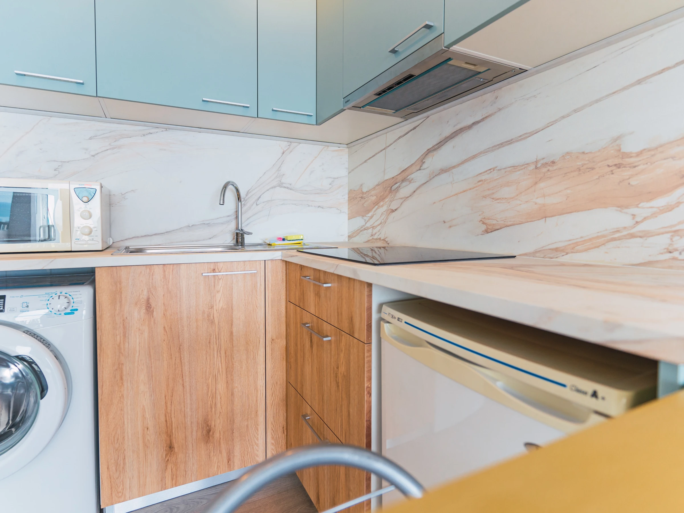 Vollständig ausgestattete Küche mit Kühlschrank, Ofen, Mikrowelle, Glaskeramikkochfeld, Geschirrspüler, Kaffeemaschine und Toaster