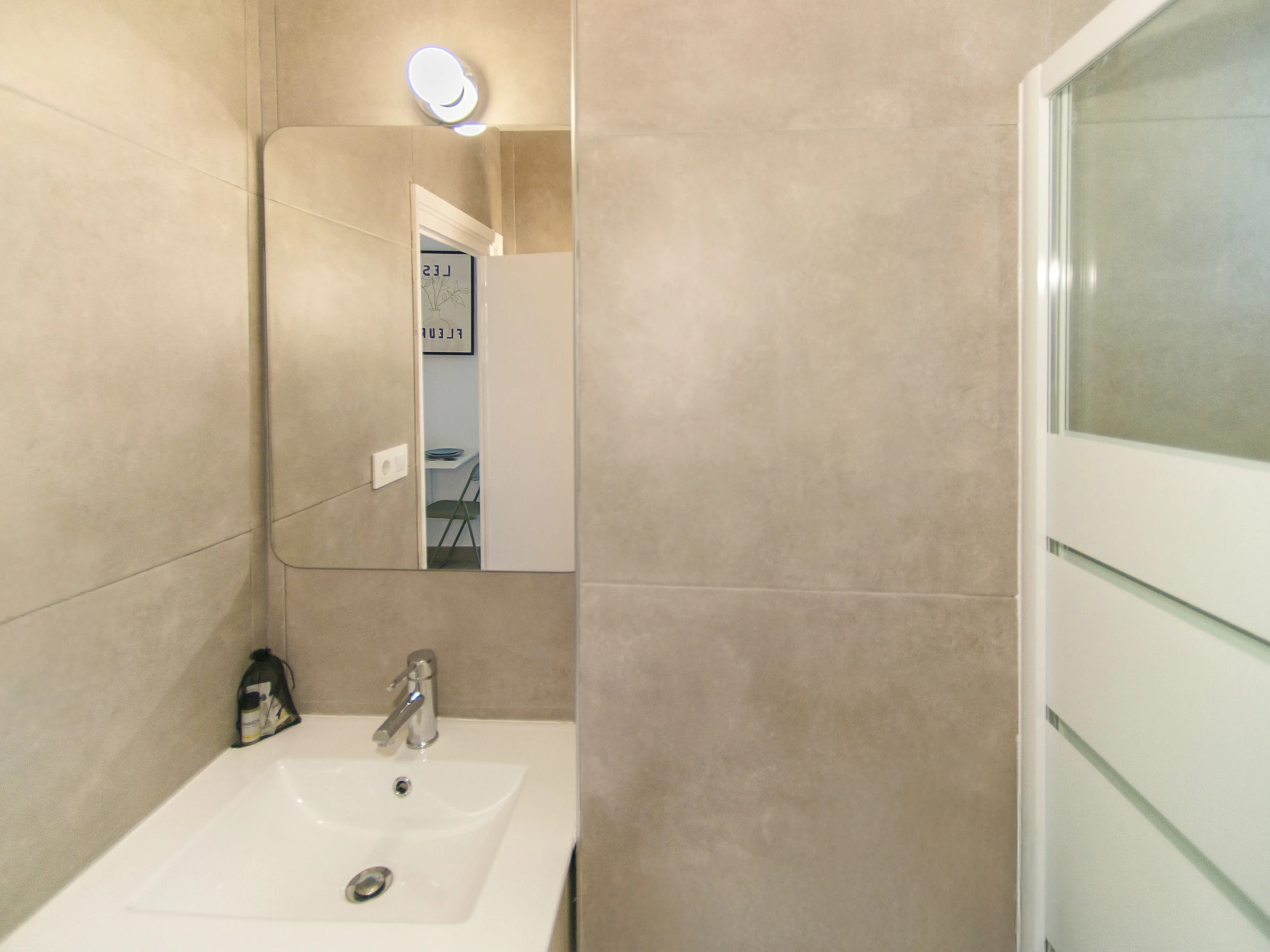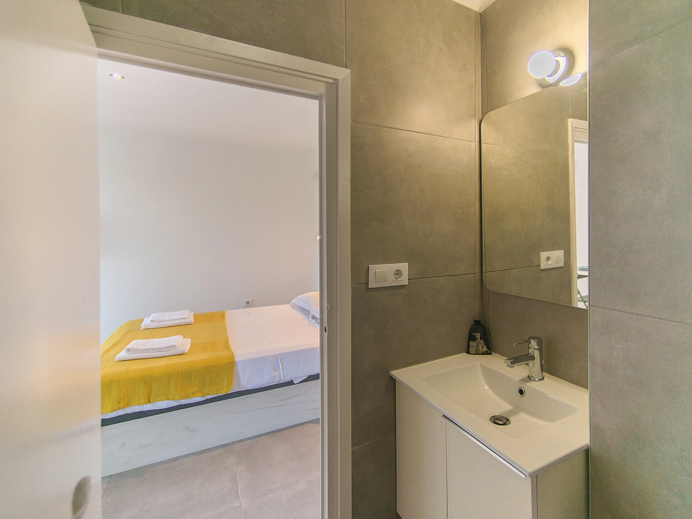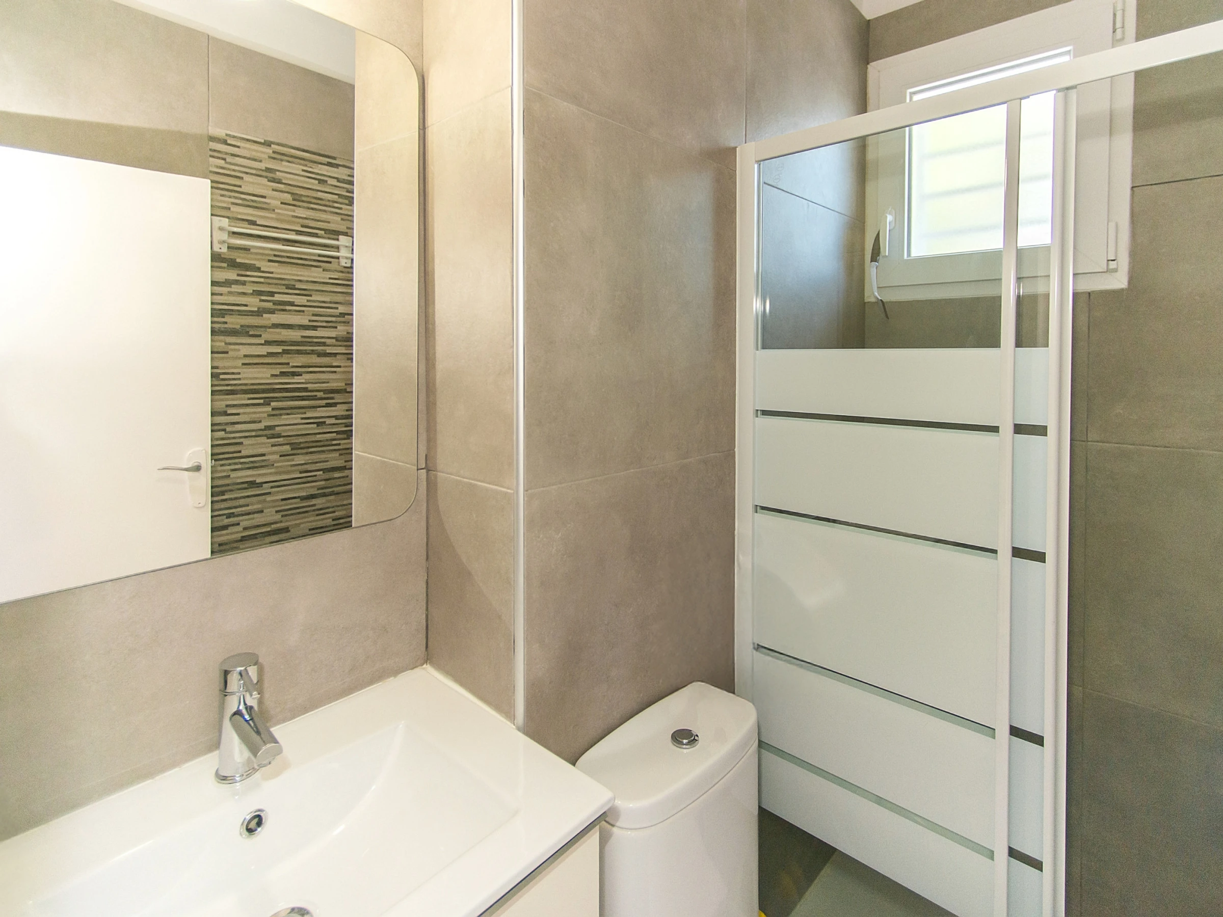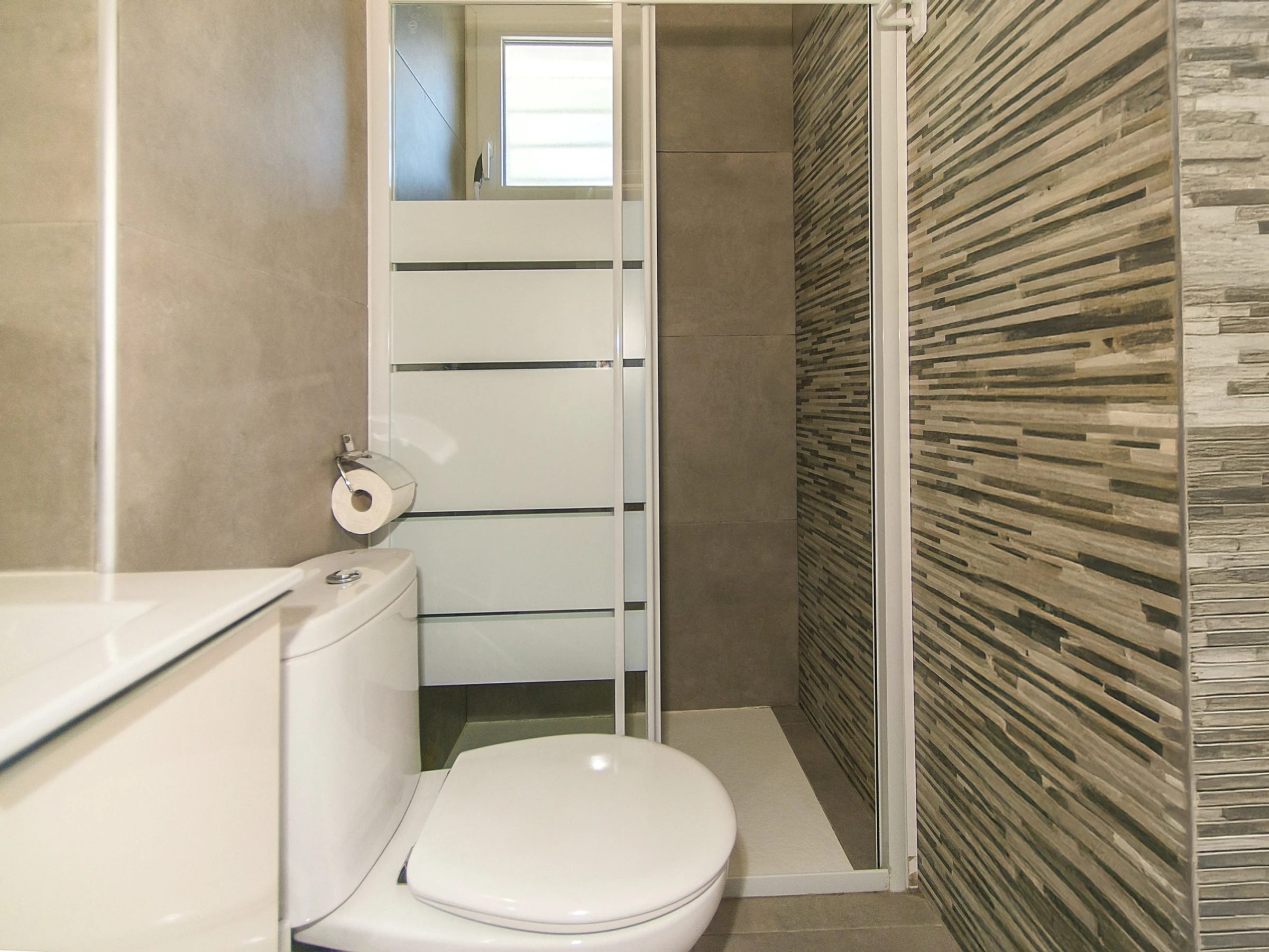 Das Badezimmer mit Dusche bietet Komfort und Funktionalität und ermöglicht es, den Tag mit Energie zu beginnen oder sich nach einem langen Tag am Strand zu entspannen.