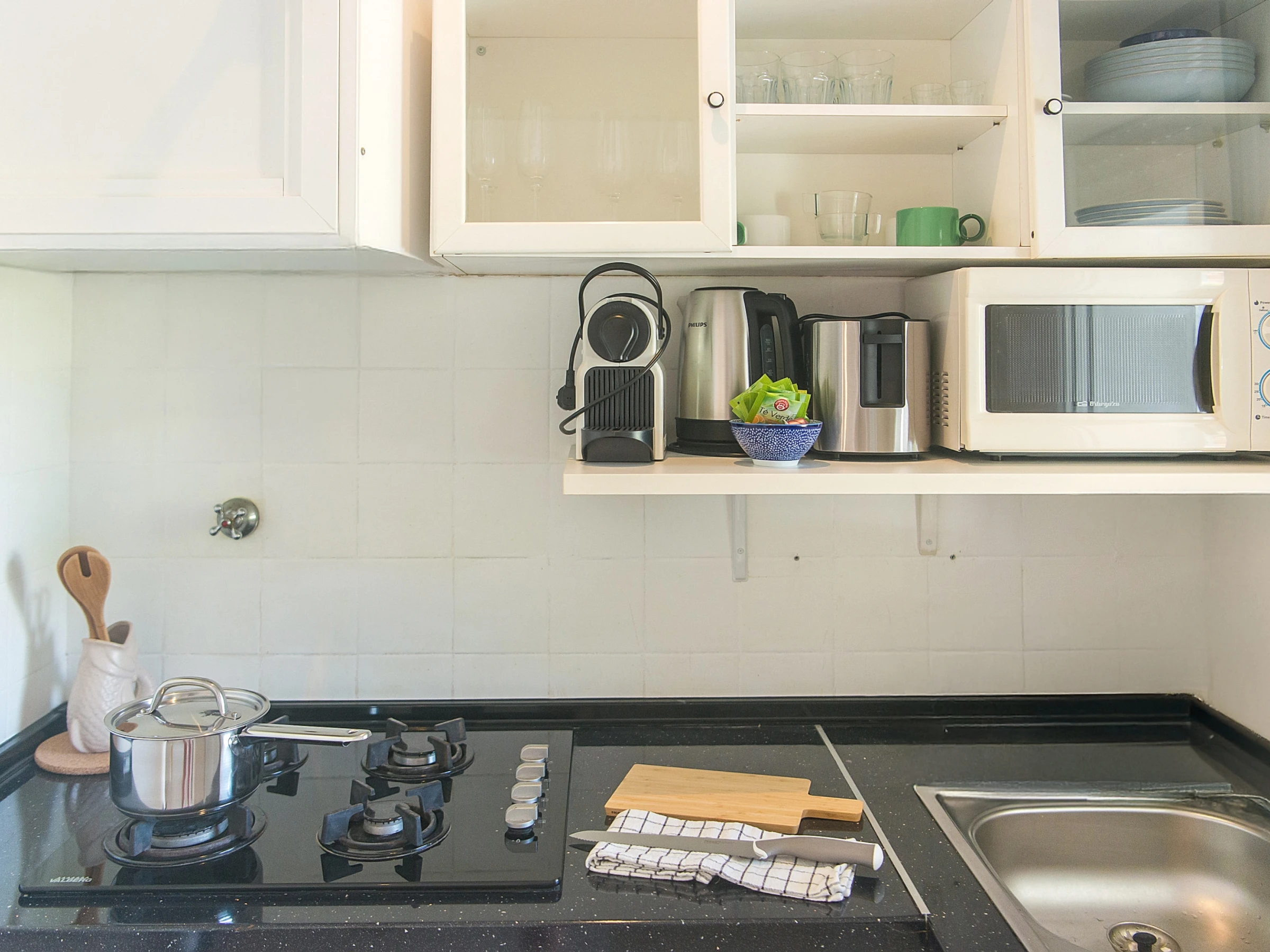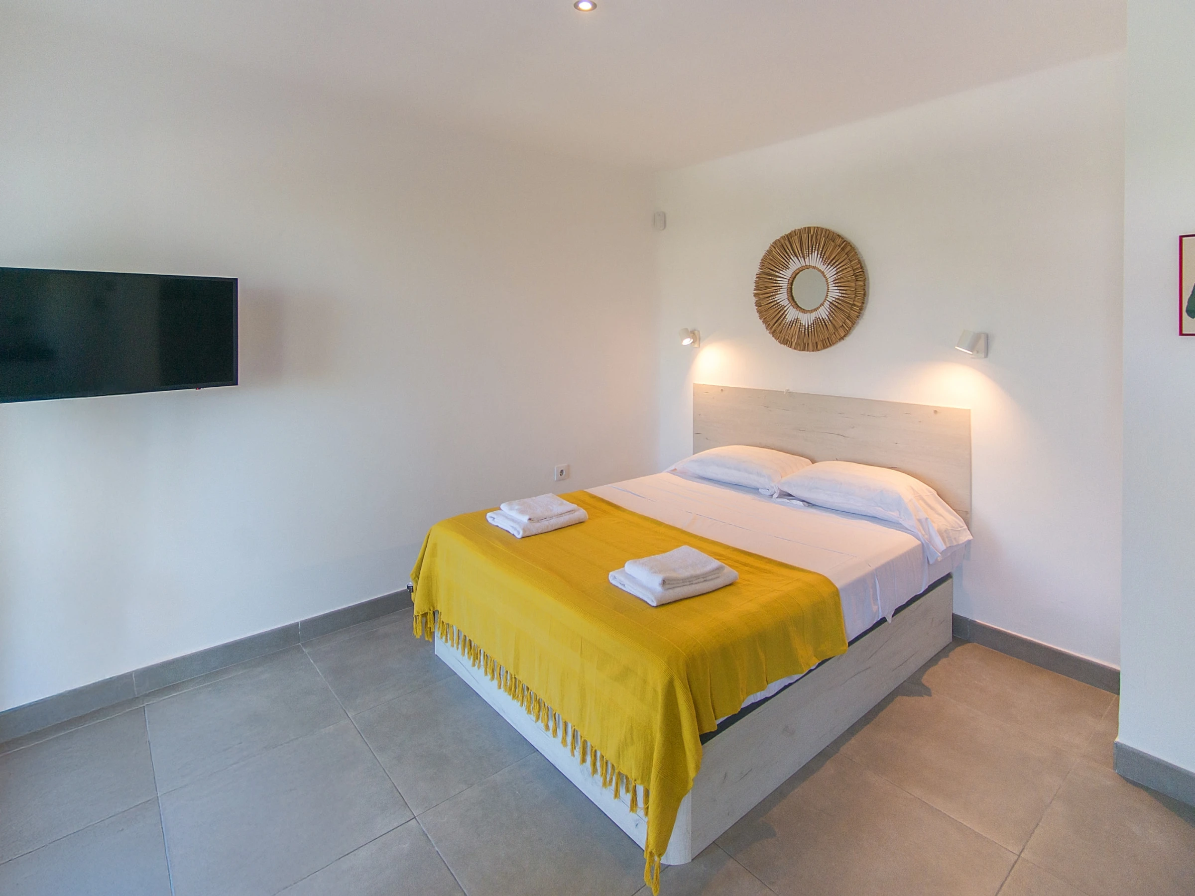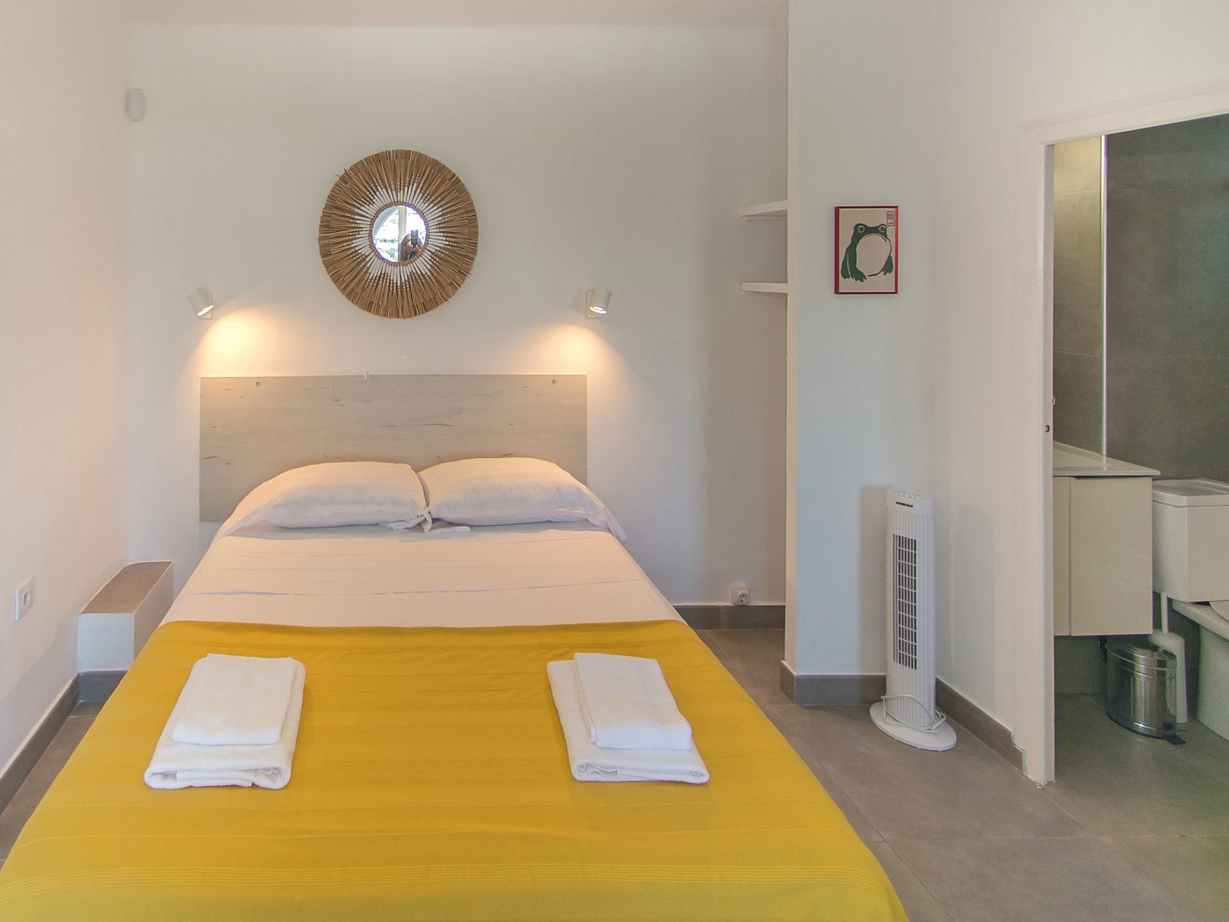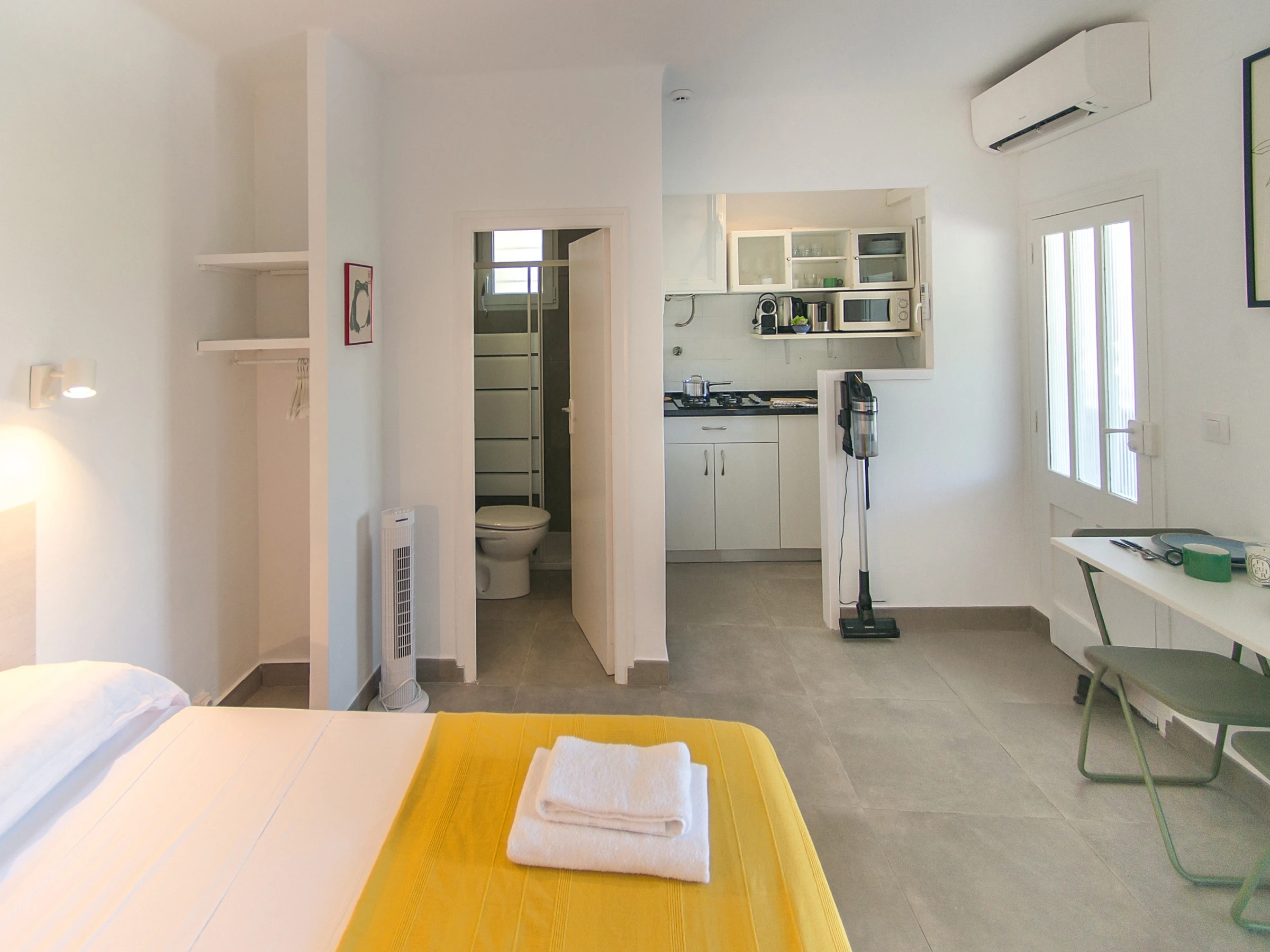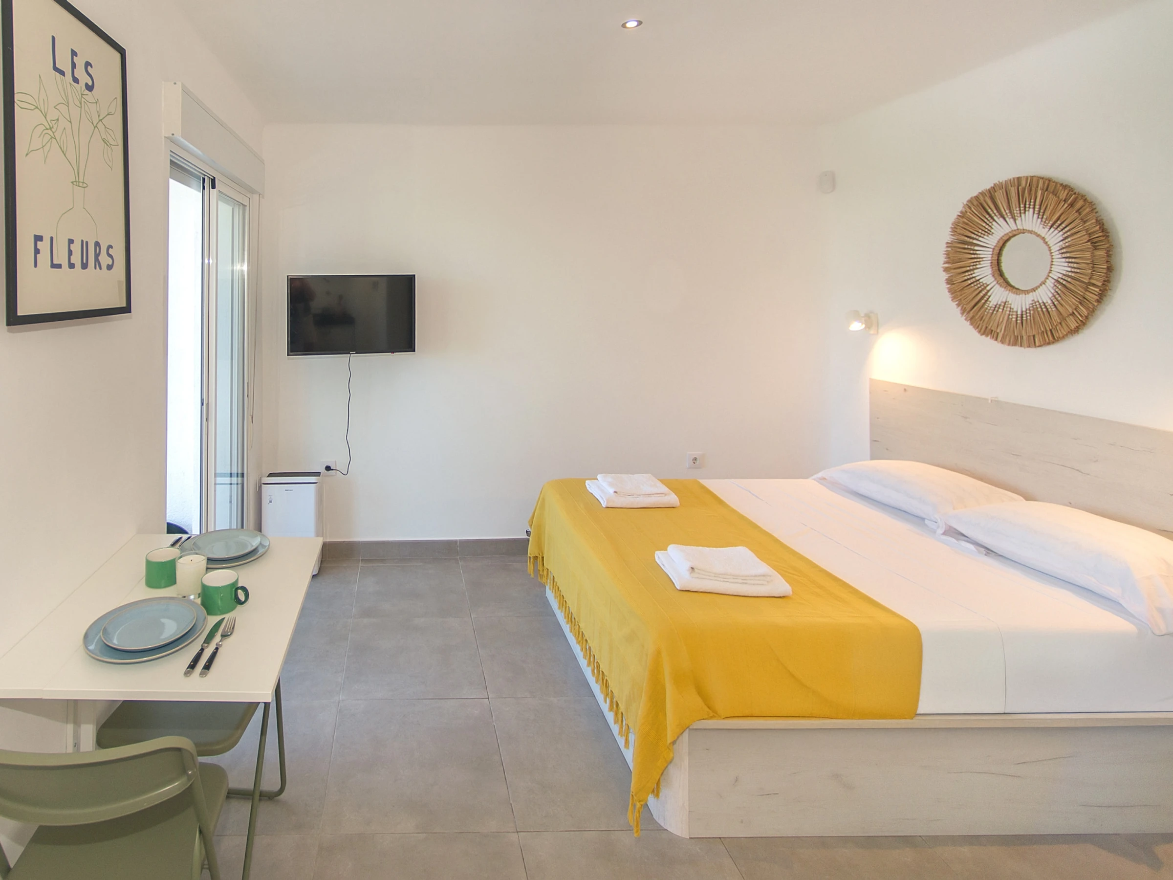Das Studio ist mit allem Notwendigen für ein komfortables Wohnen ausgestattet: einem gemütlichen Doppelbett, einem modernen Fernseher und einer Klimaanlage, die an heißen Tagen für Kühle sorgt. Die Essenszone und die kleine Küche ermöglichen es, eine selbst zubereitete Mahlzeit in gemütlicher Atmosphäre zu genießen.