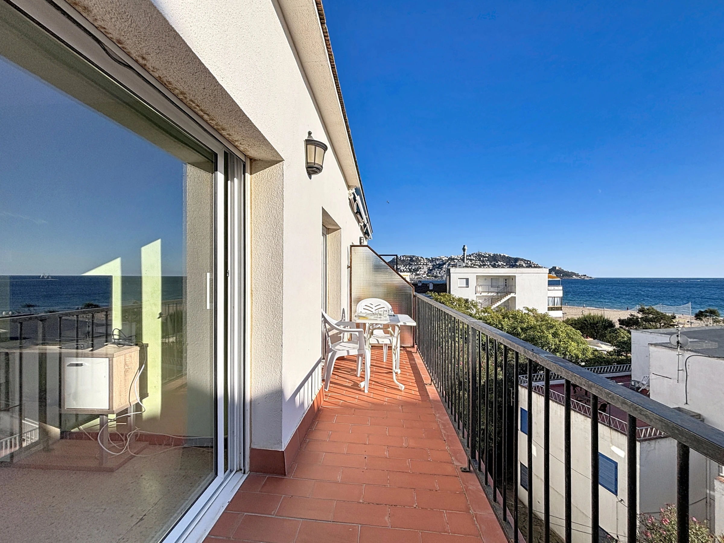 Genießen Sie eine große Terrasse mit Panoramablick aufs Meer — perfekt für Mahlzeiten im Freien oder zum Bewundern von Sonnenuntergängen.