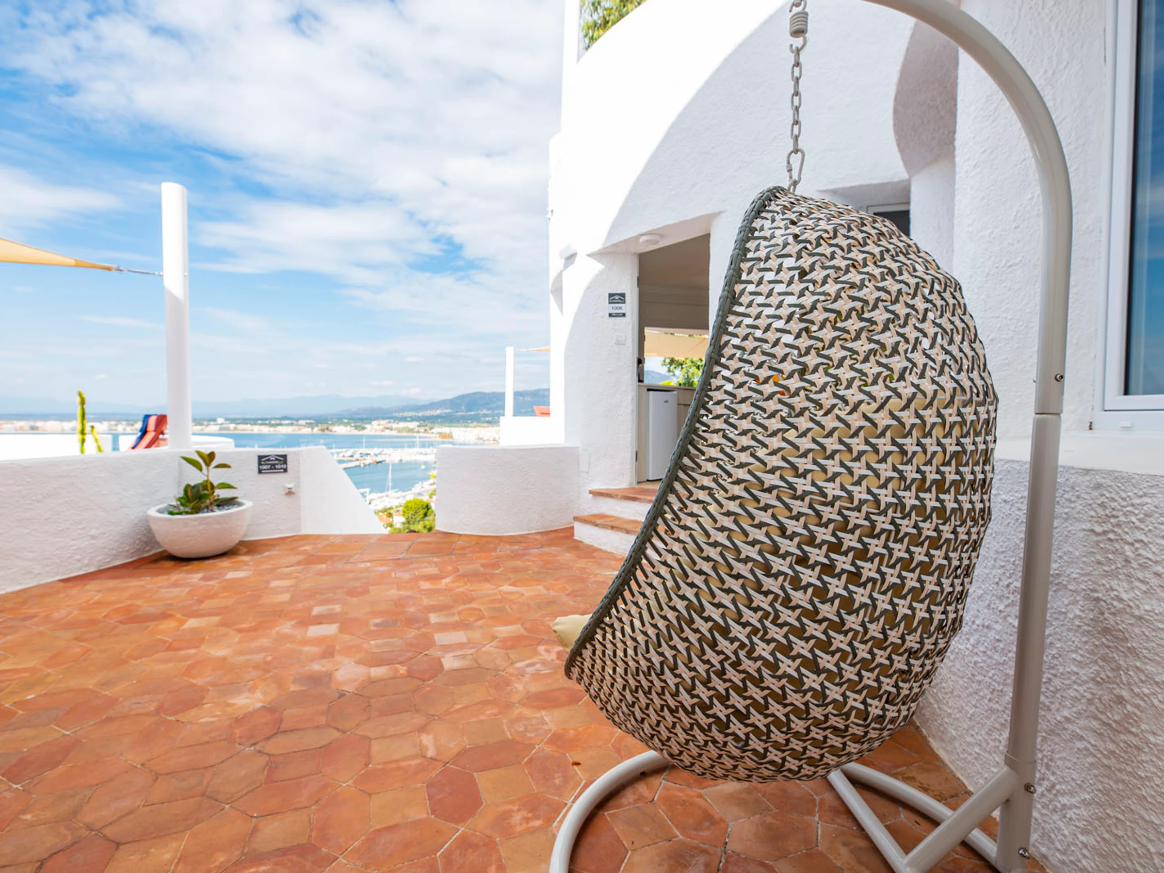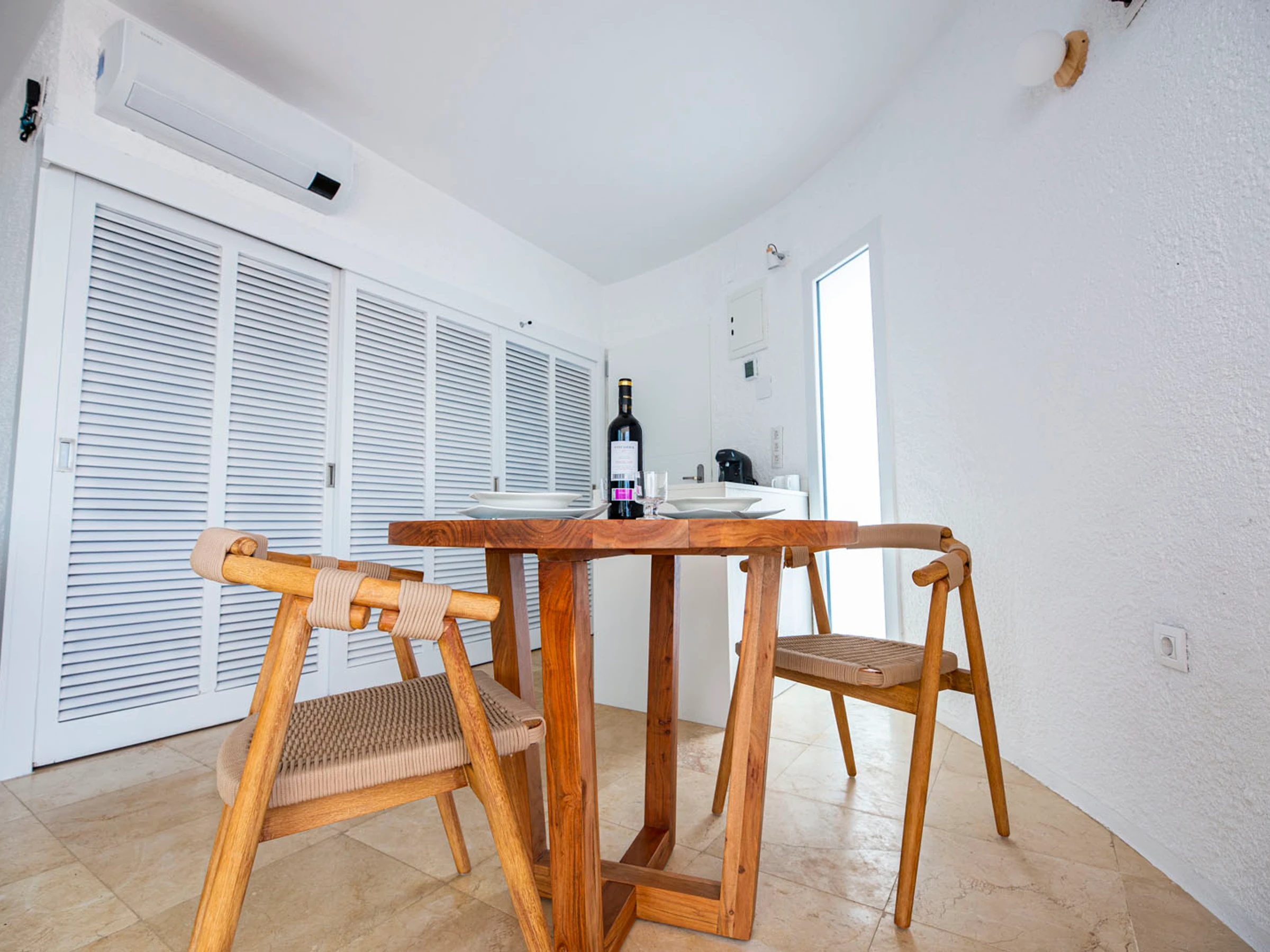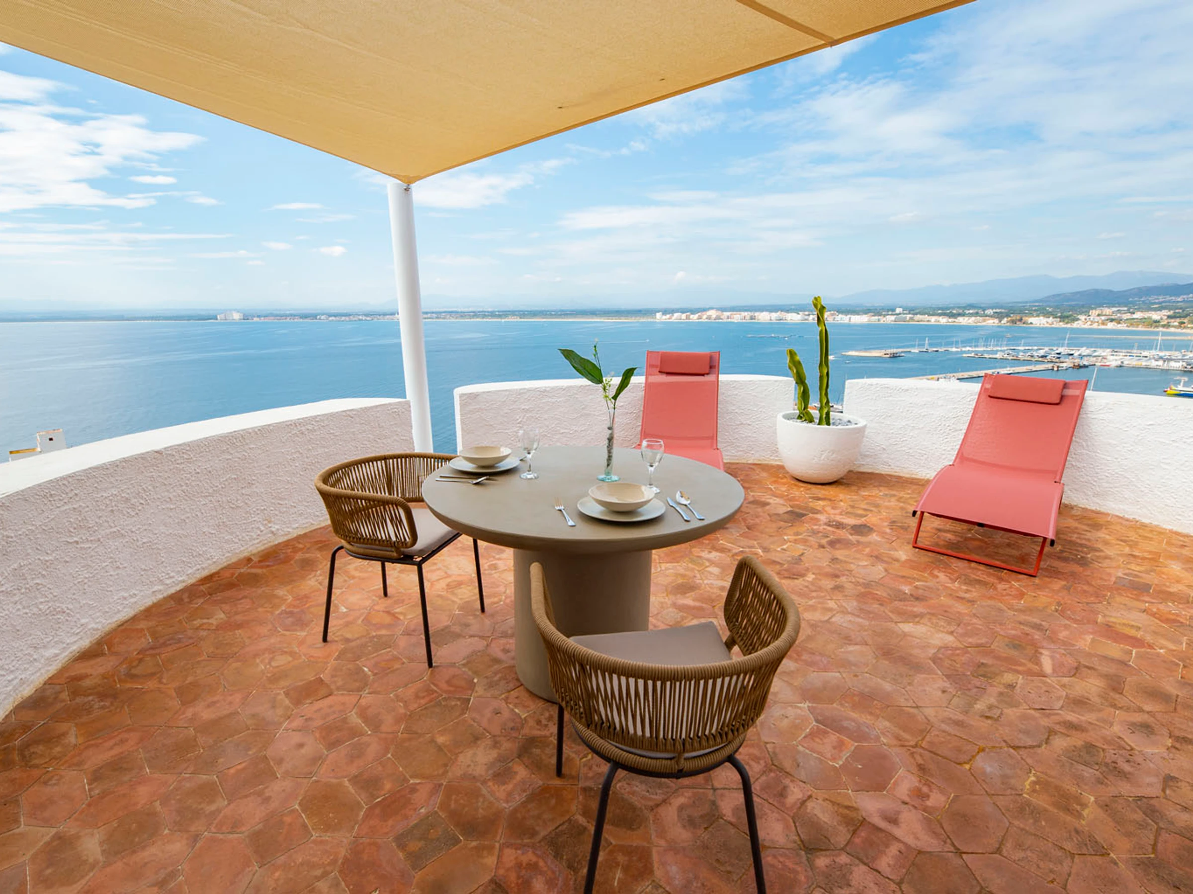 Exklusives Studio für zwei Personen, ideal für Paare oder Reisende, die ein einzigartiges und stilvolles Erlebnis in Roses suchen. Dieser Raum ist offen und modern gestaltet. Von der Terrasse aus genießen Sie einen unvergleichlichen Blick über die Bucht von Roses, wo die Sonnenuntergänge für einen wundervollen Abend sorgen.