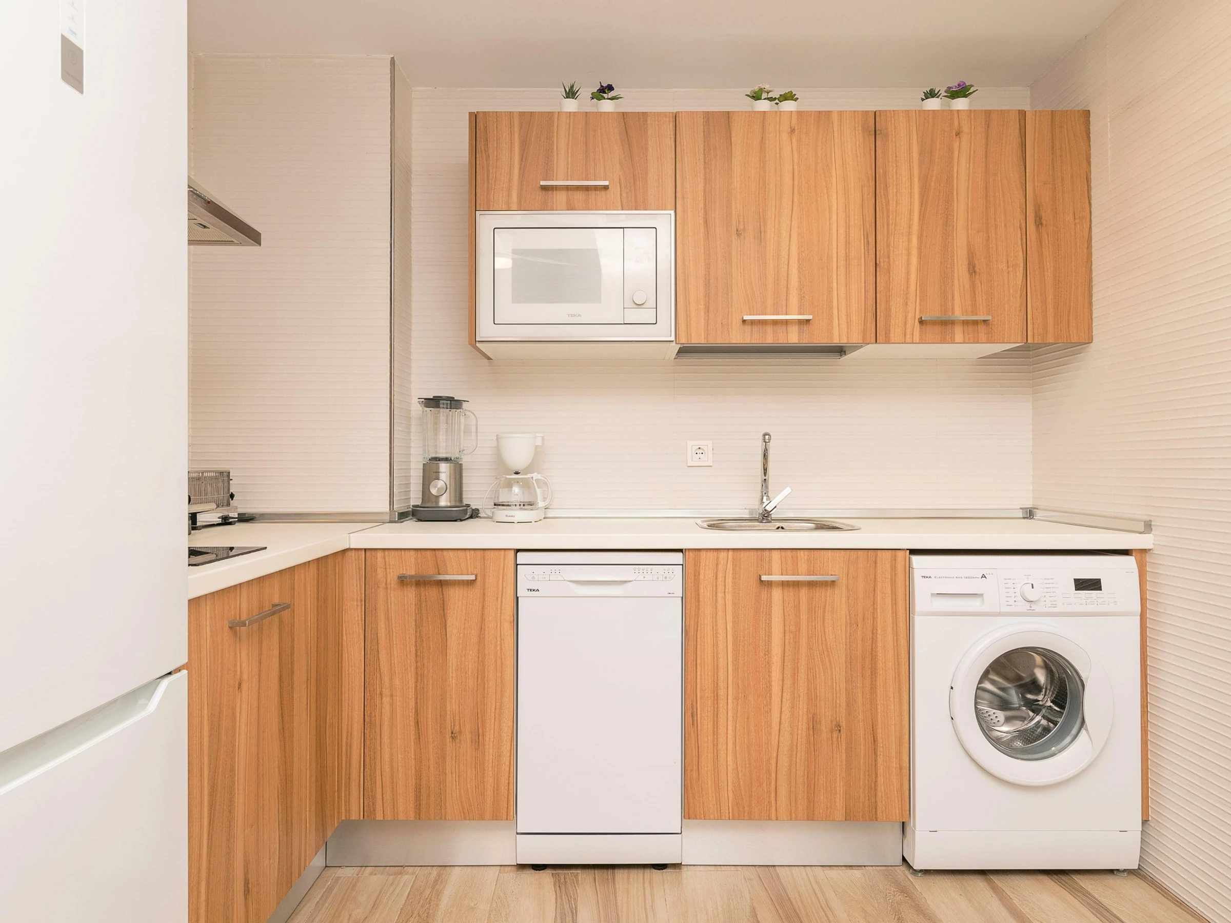 Dieses küche, ist ausgestattet in kühlschrank, mikrowelle, gefrierschrank, spülmaschine, kaffeemaschine und toaster.
