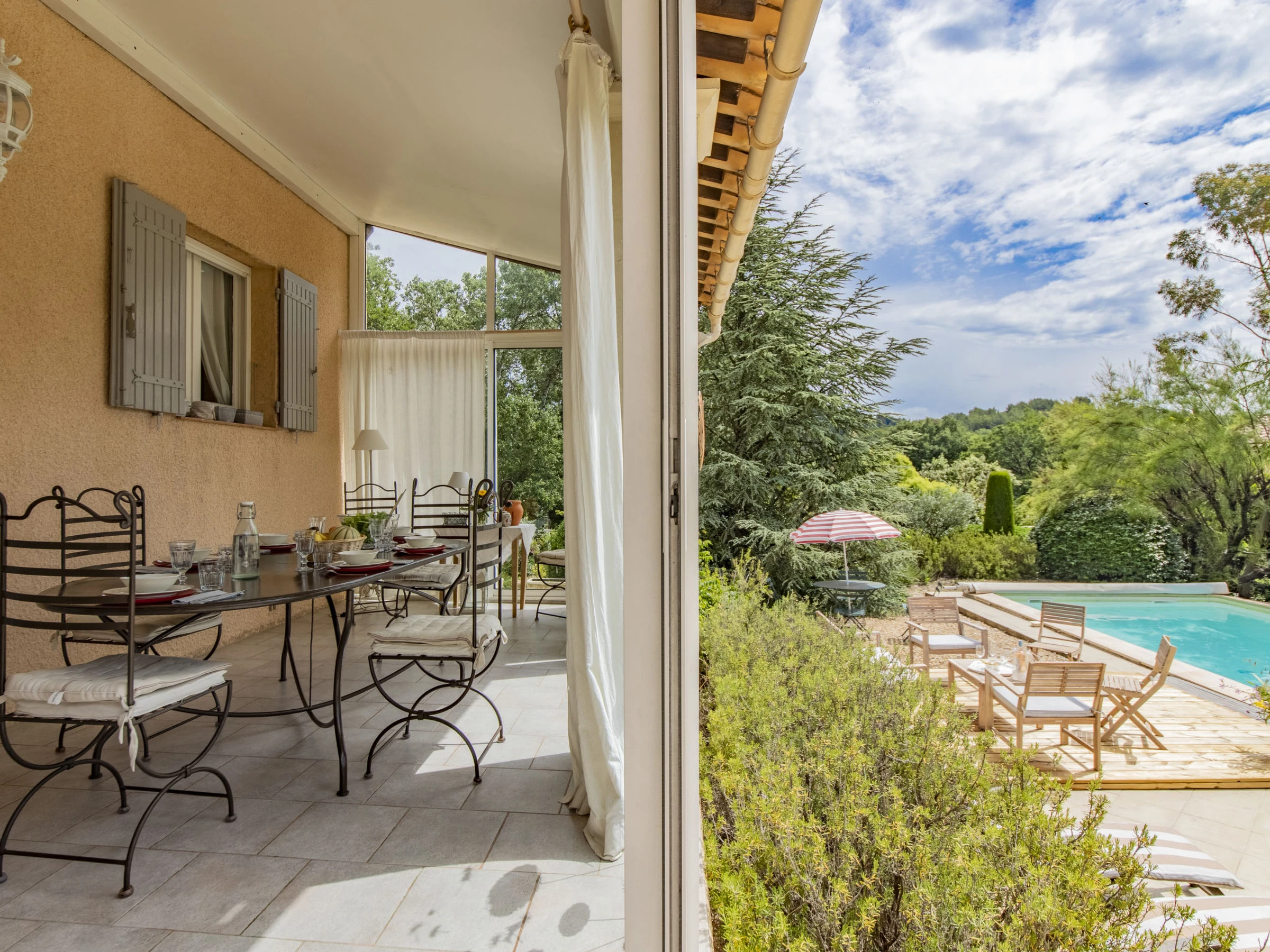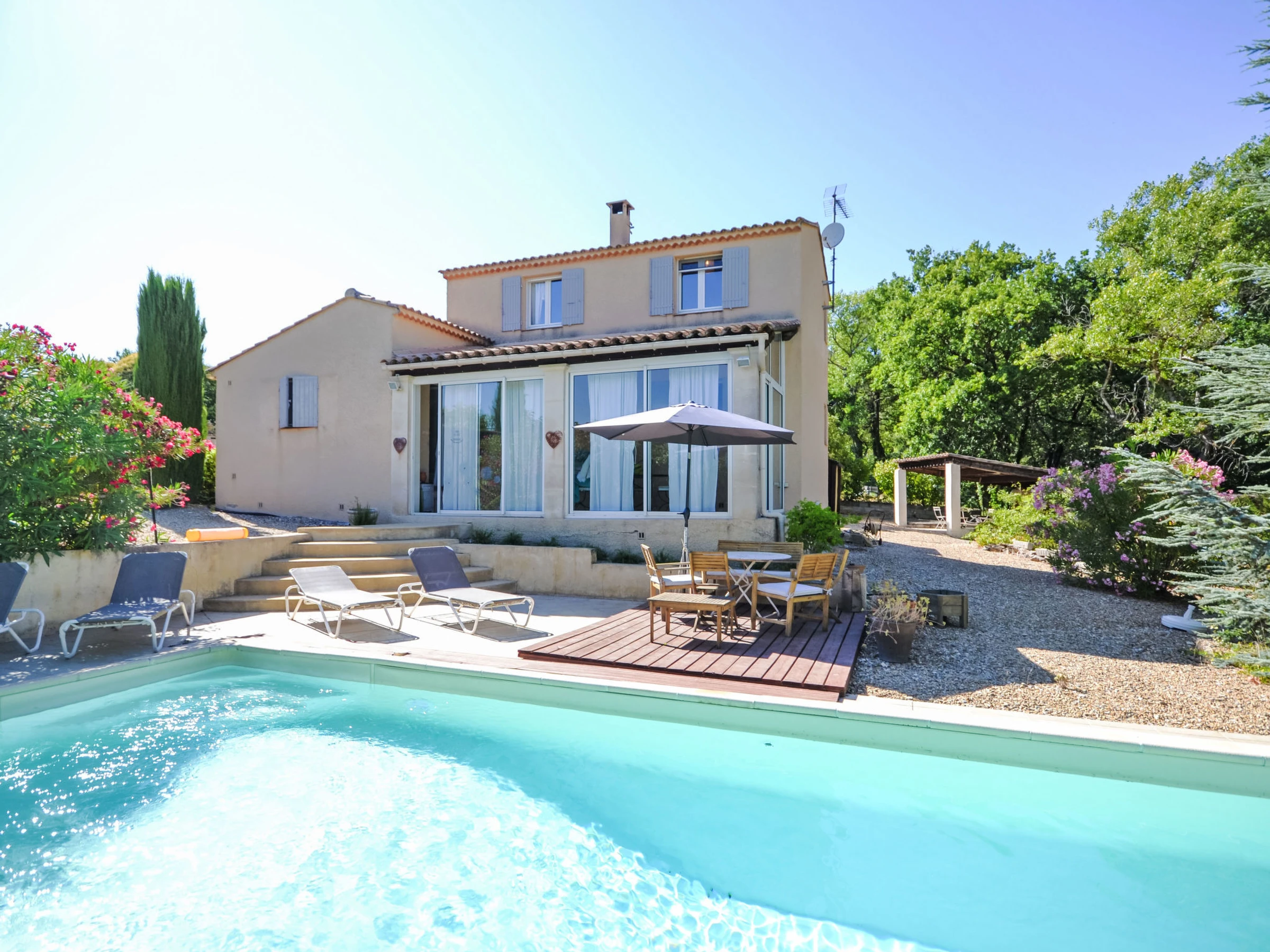 Gargas 4 km von Roussillon: Einfamilienhaus "Les Iris", Baujahr 1989, renoviert im Jahre 2014. Ausserhalb des Ortes. Zur Alleinbenutzung: Grundstück 1'300 m2 (eingezäunt), Schwimmbad geschützt (10 x 4 m, 80 - 150 cm tief, saisonale Verfügbarkeit: [hidden] - [hidden] mit Innentreppe. Parkplatz auf dem Grundstück. Carport. Einkaufsgeschäft 2 km, Lebensmittelgeschäft 2 km, Restaurant 2 km, Bushaltestelle "Avenue de Lançon" 3 km. Bitte beachten: Fahrzeug empfohlen. Garage nur für Motorräder und Fahrräder.