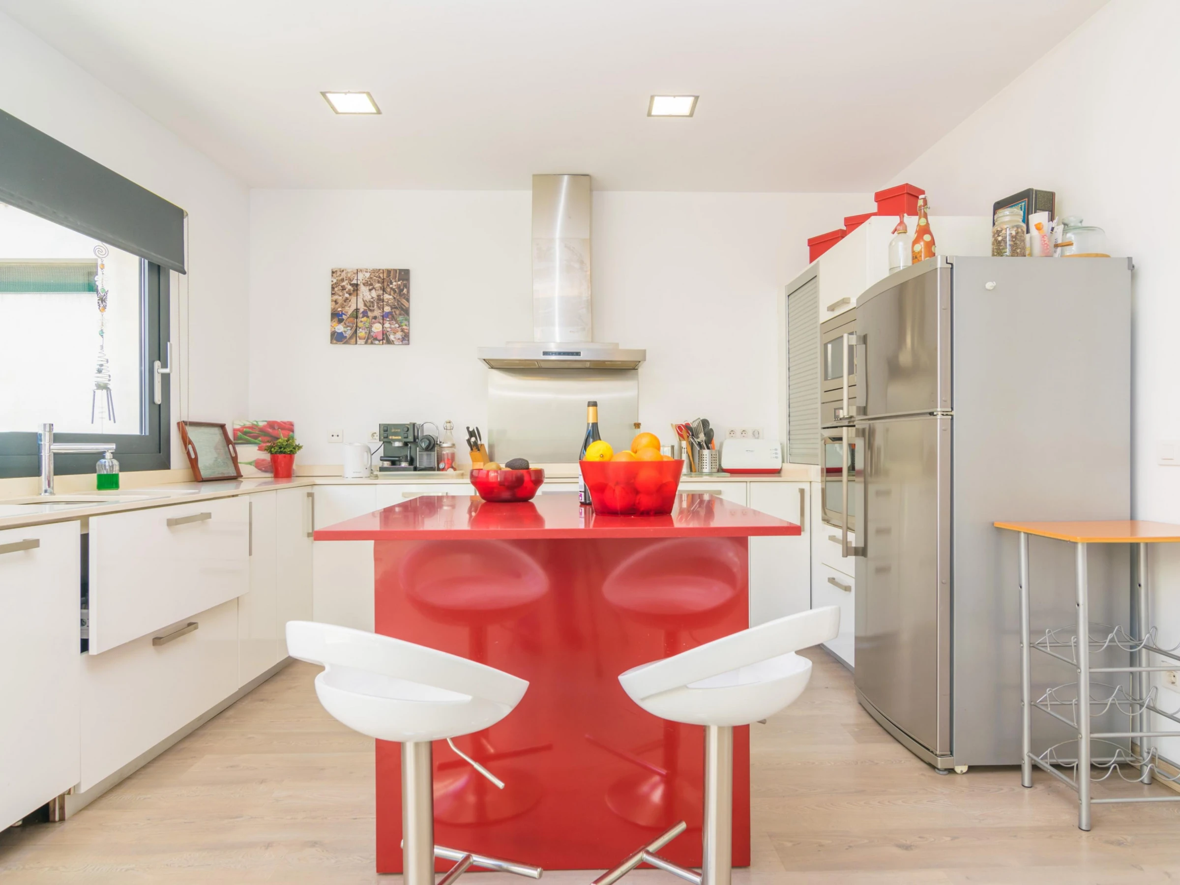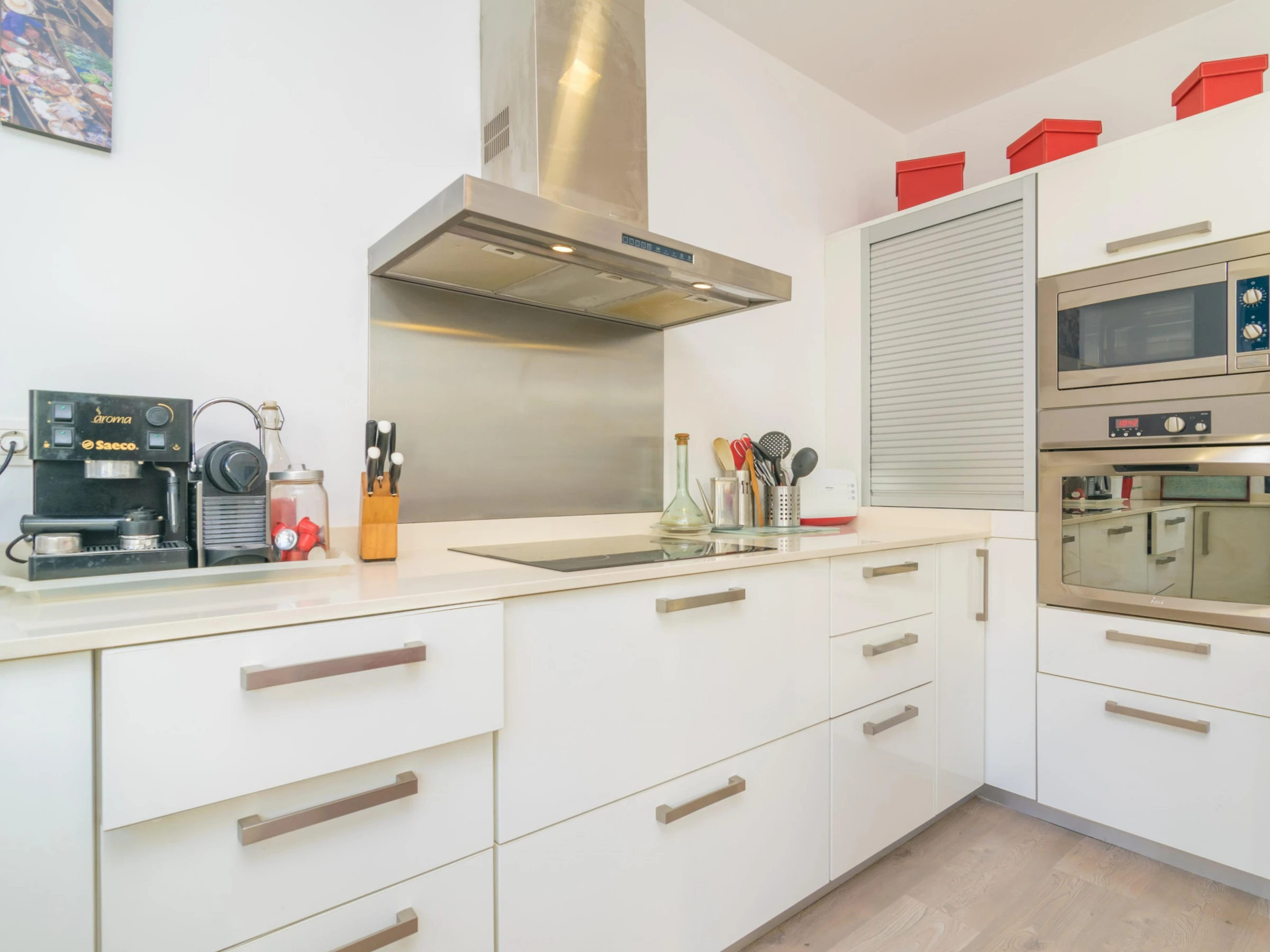 Dieses küche, ist ausgestattet in kühlschrank, mikrowelle, backofen, gefrierschrank, spülmaschine, kaffeemaschine und toaster.