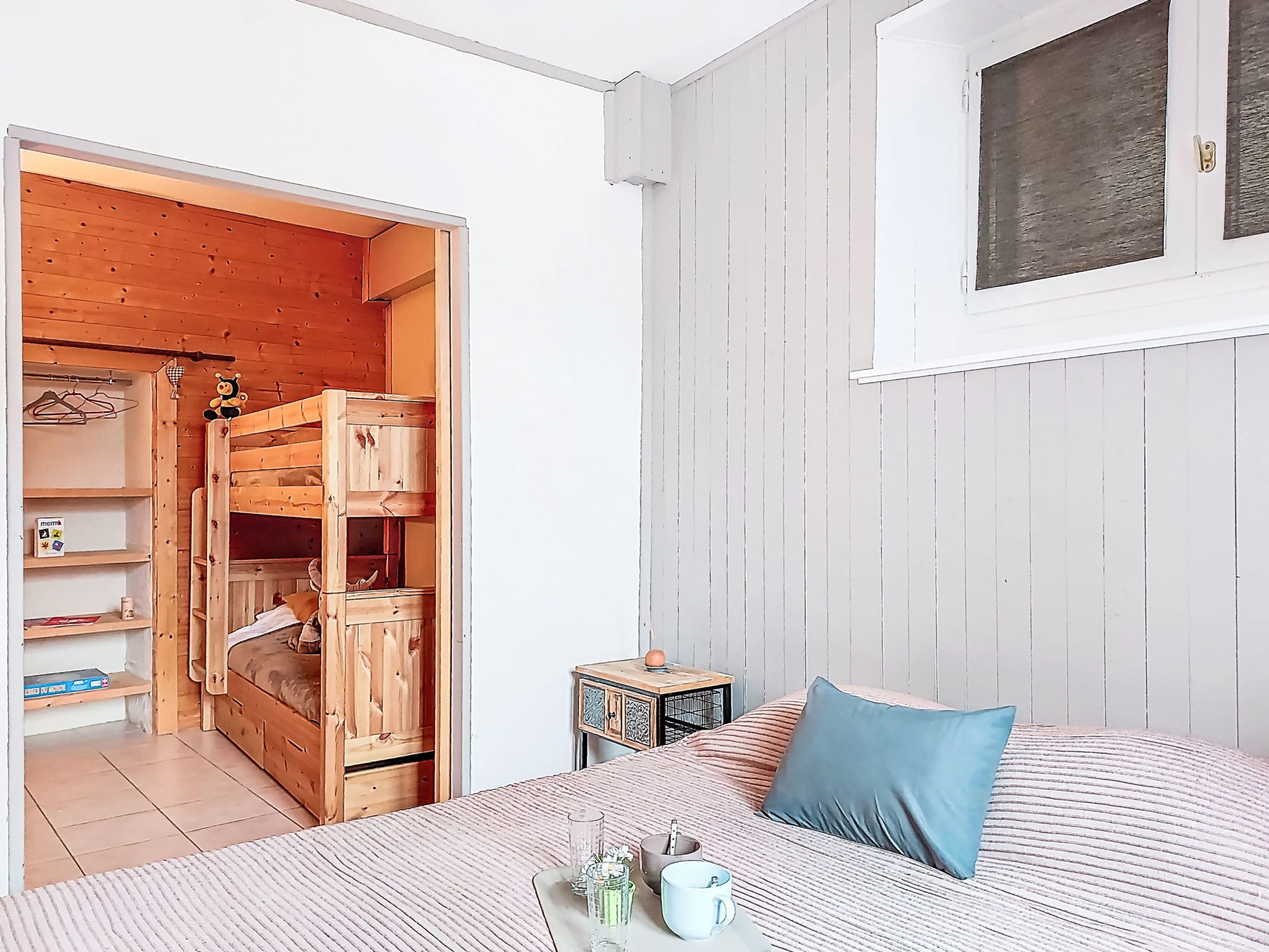 "Namaste", 3-Zimmer-Wohnung 60 m2, im Erdgeschoss. Wohn-/Esszimmer mit 1 Diwanbett (140 cm, Länge 190 cm), TV (Flachbildschirm). Durchgangszimmer mit 1 franz. Bett (160 cm, Länge 190 cm). Verbundenes Zimmer mit 1 x 2 Etagenbetten (90 cm, Länge 190 cm). Offene Küche (4 Kochplatten, Backofen, Toaster, Wasserkocher, Mikrowelle, Tiefkühler, elektrische Kaffeemaschine, Kapseln für die Kaffeemaschine (Nespresso) extra). Sitzbad, sep. WC. E-Heizung. Zur Verfügung: Babybett bis 3 Jahre. Internet (WLAN, extra). Parkplatz (überdacht, 1 Auto). Bitte beachten: Nichtraucher-Unterkunft. Maximal 1 kleines Haustier/Hund erlaubt. TV nur FR. Rauchmelder. Inserat einer Privatperson nach Artikel 155, IV, CGI.