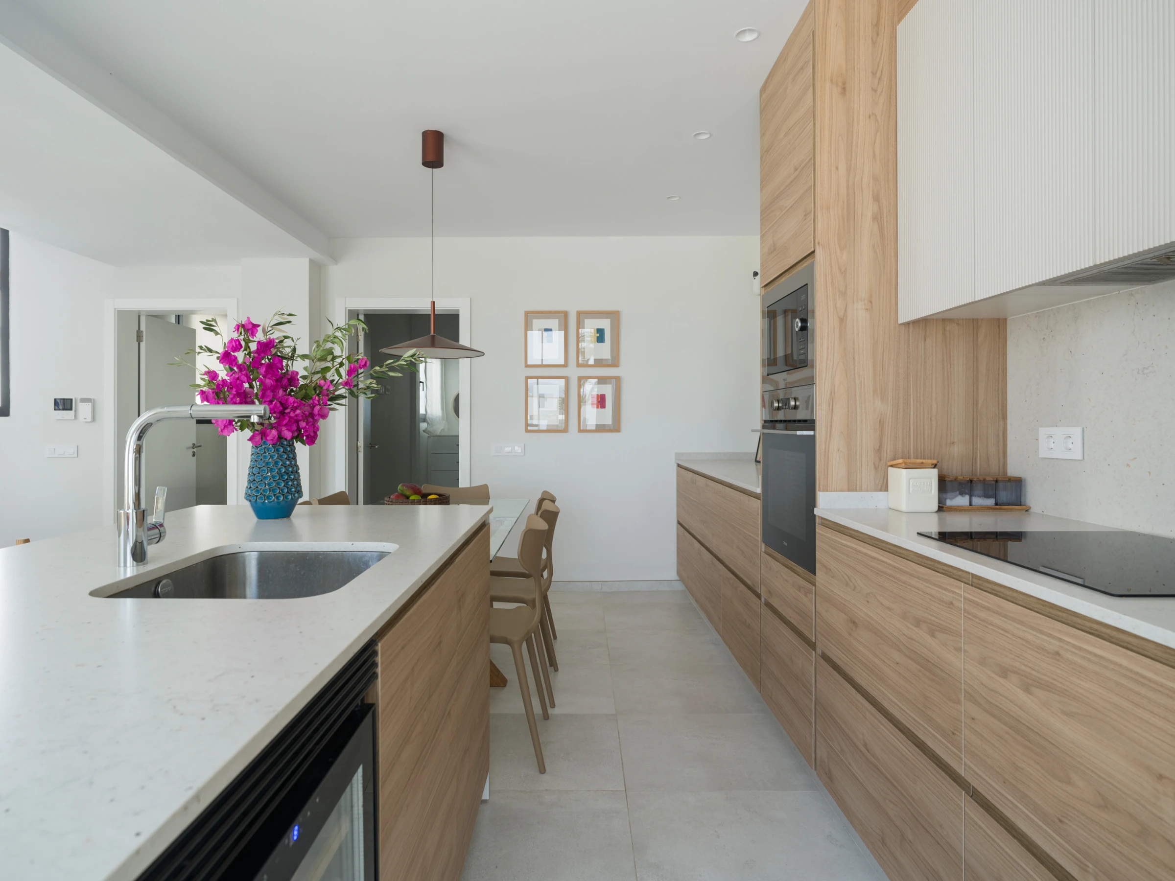 🛋️ Offenes Wohn- und Esszimmer mit großen Schiebetüren, die direkten Zugang zur Terrasse bieten – mit wunderschönem Meerblick 🌊. Das Wohnzimmer ist mit einem 65" Smart-TV mit internationalen Kanälen ausgestattet.