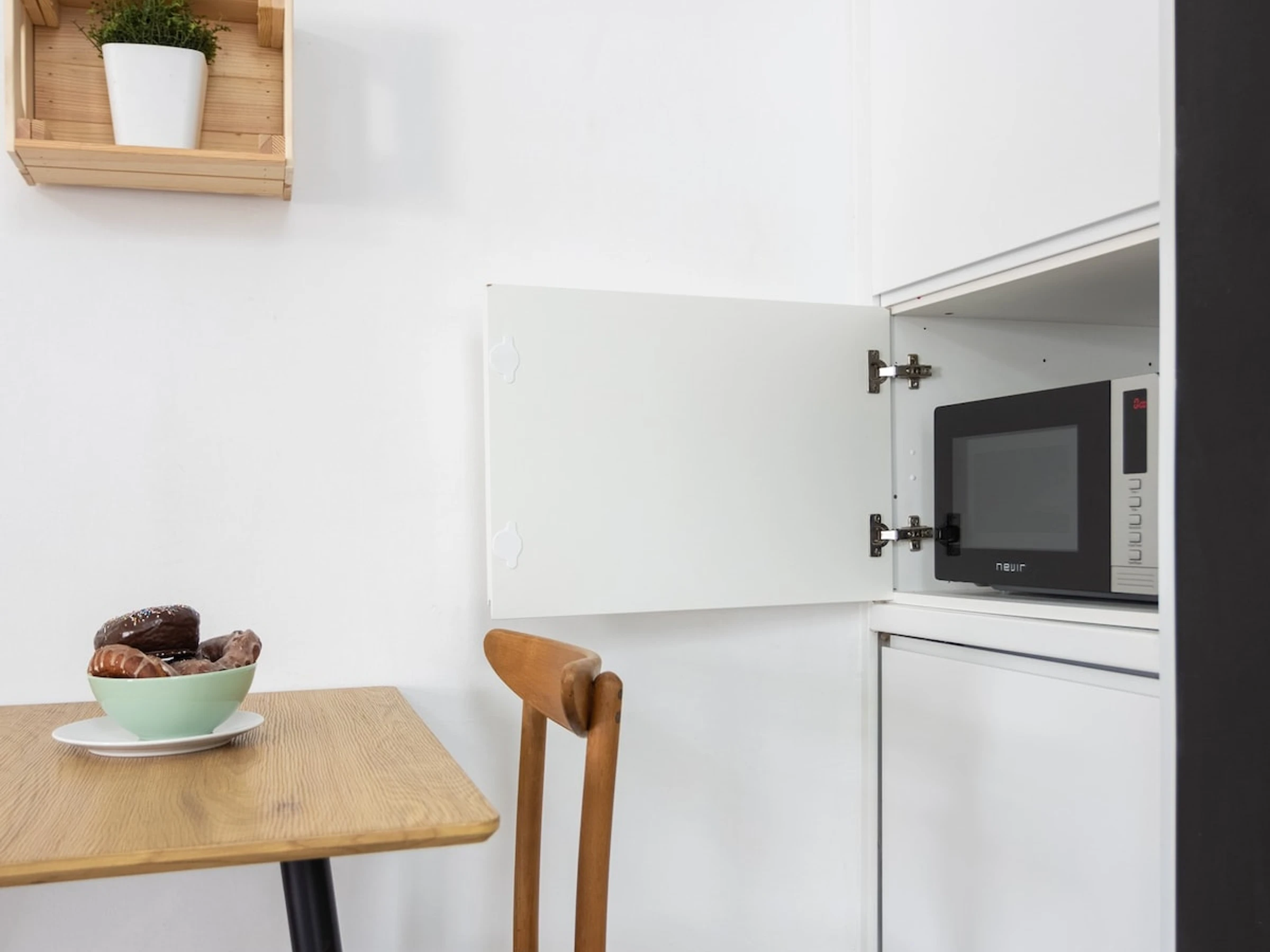 Dieses küche, ist ausgestattet in mikrowelle, kochutensilien und kaffeemaschine.