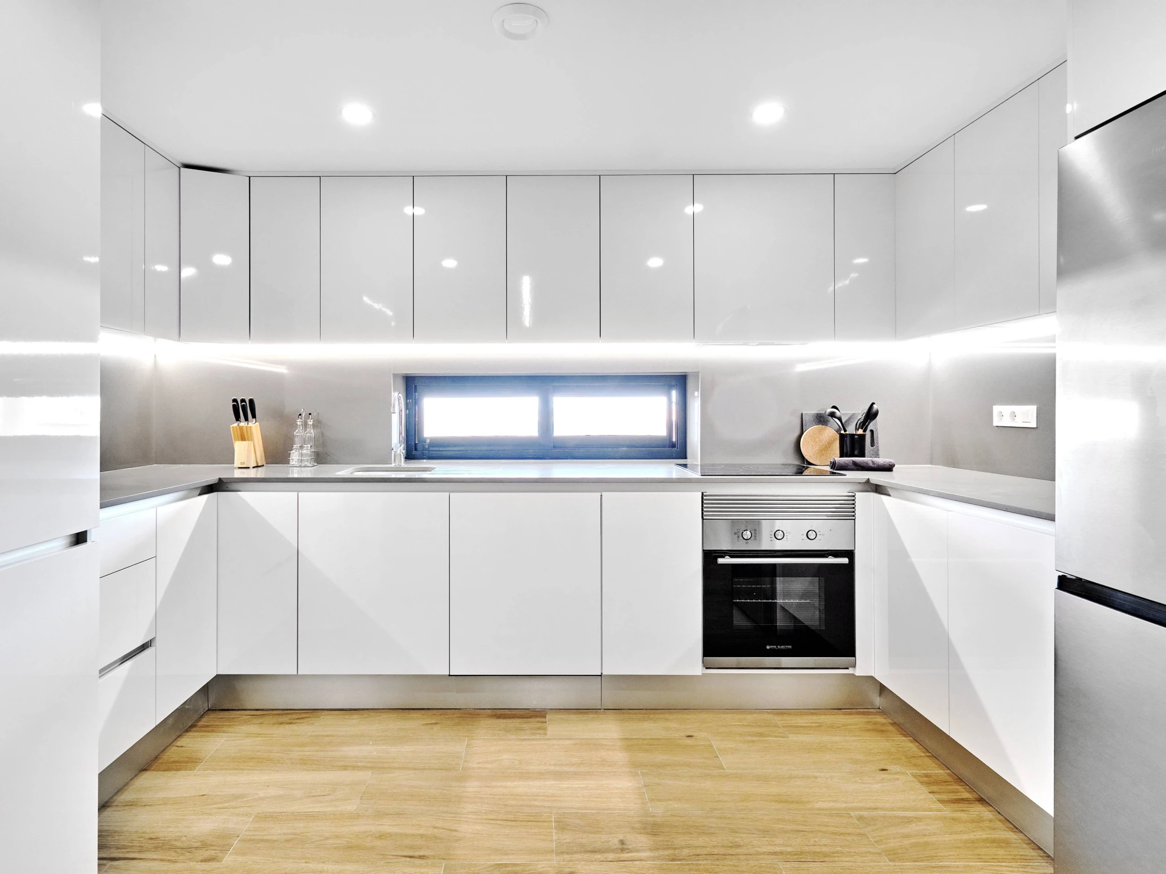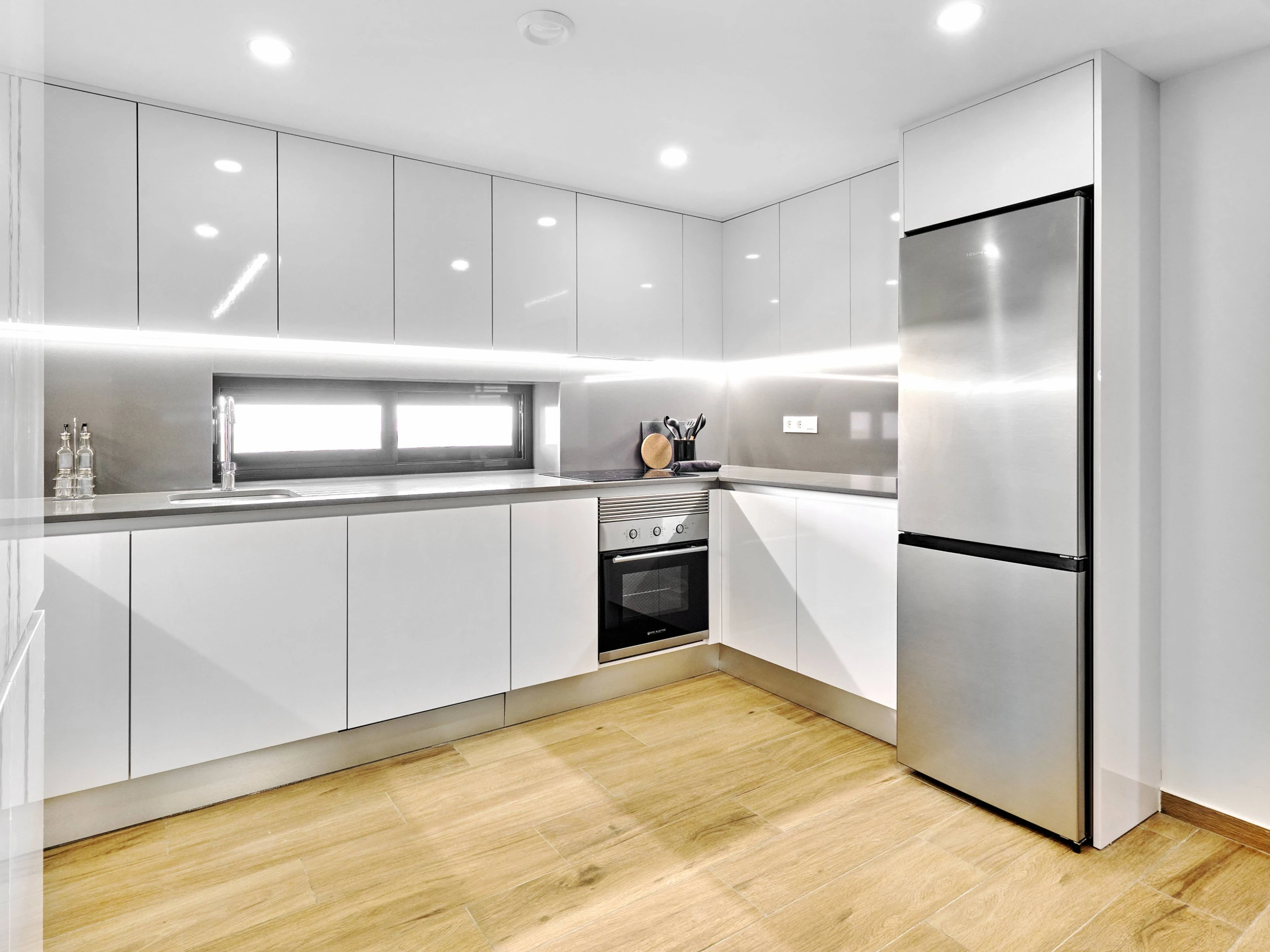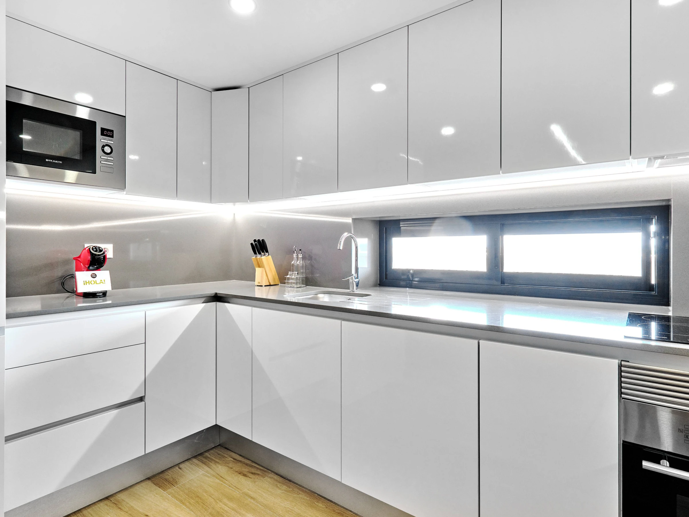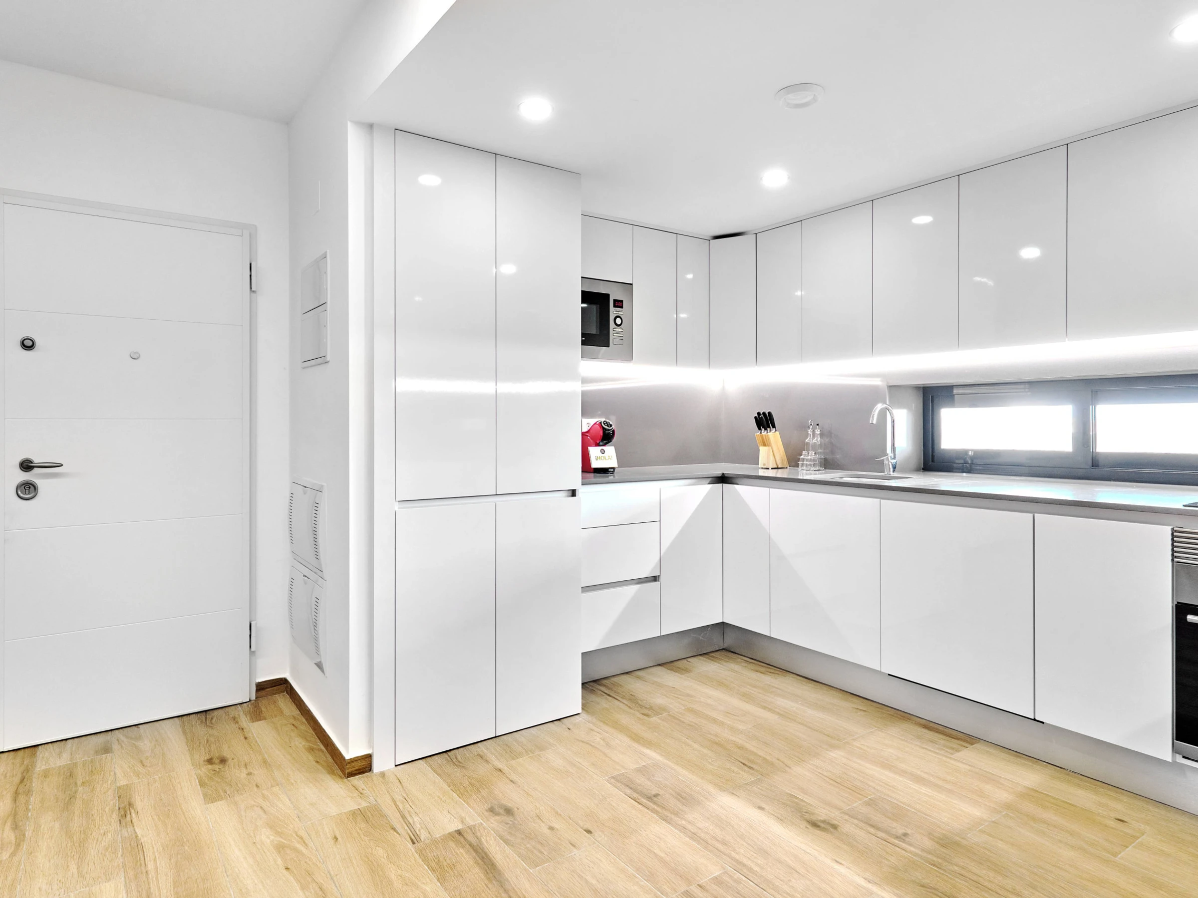 Dieses offene küche, mit ceranfeld, ist ausgestattet in kühlschrank, mikrowelle, backofen, gefrierschrank, spülmaschine, geschirr/besteck, kochutensilien, kaffeemaschine, toaster und wasserkocher.