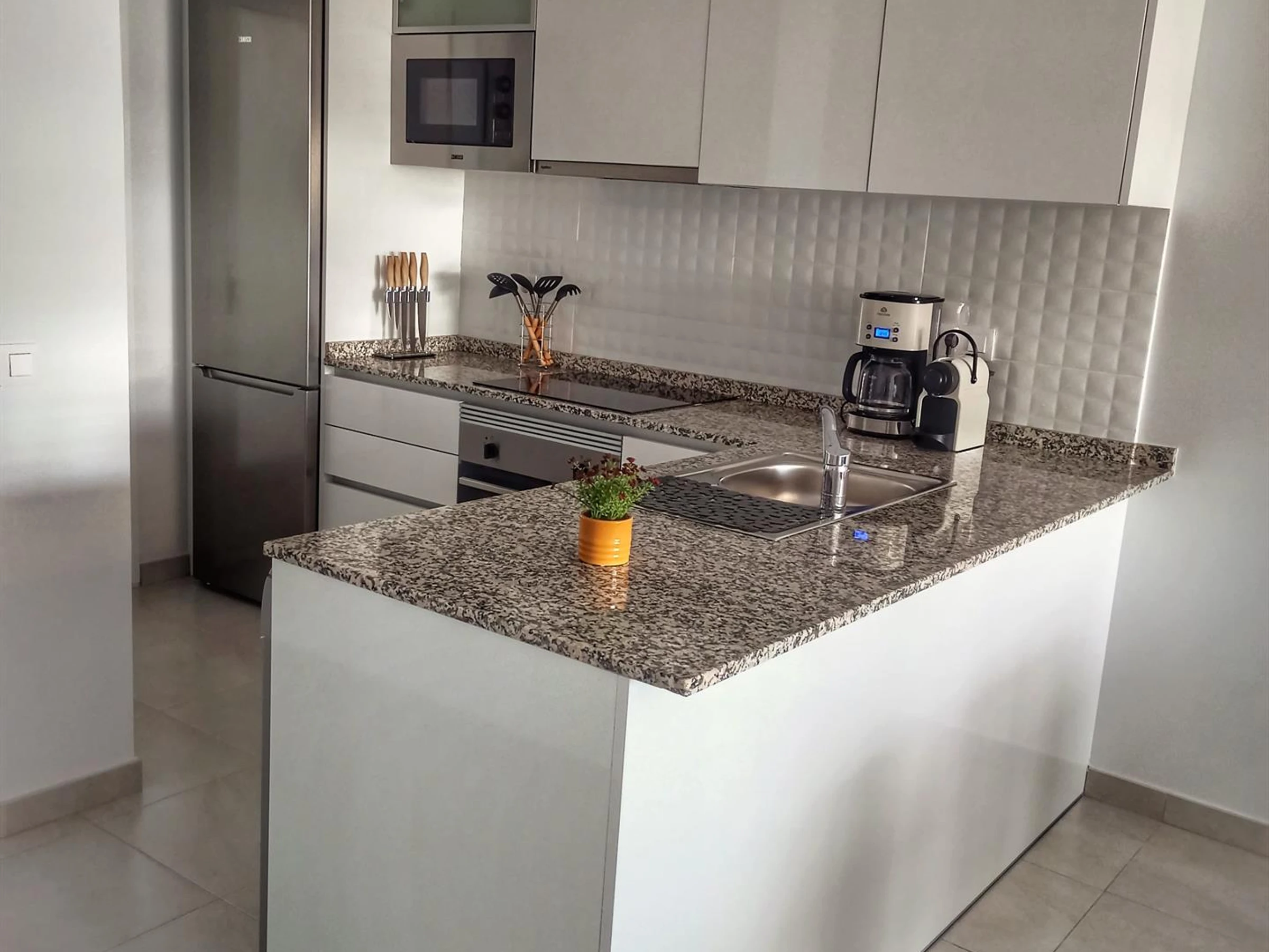 Geschirrspüler, Kühlschrank mit Gefrierfach, Kaffeemaschine, Wasserkocher,
