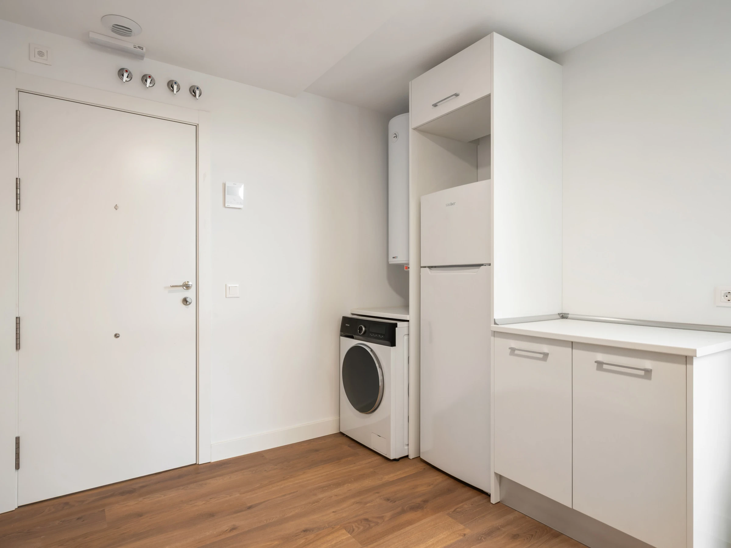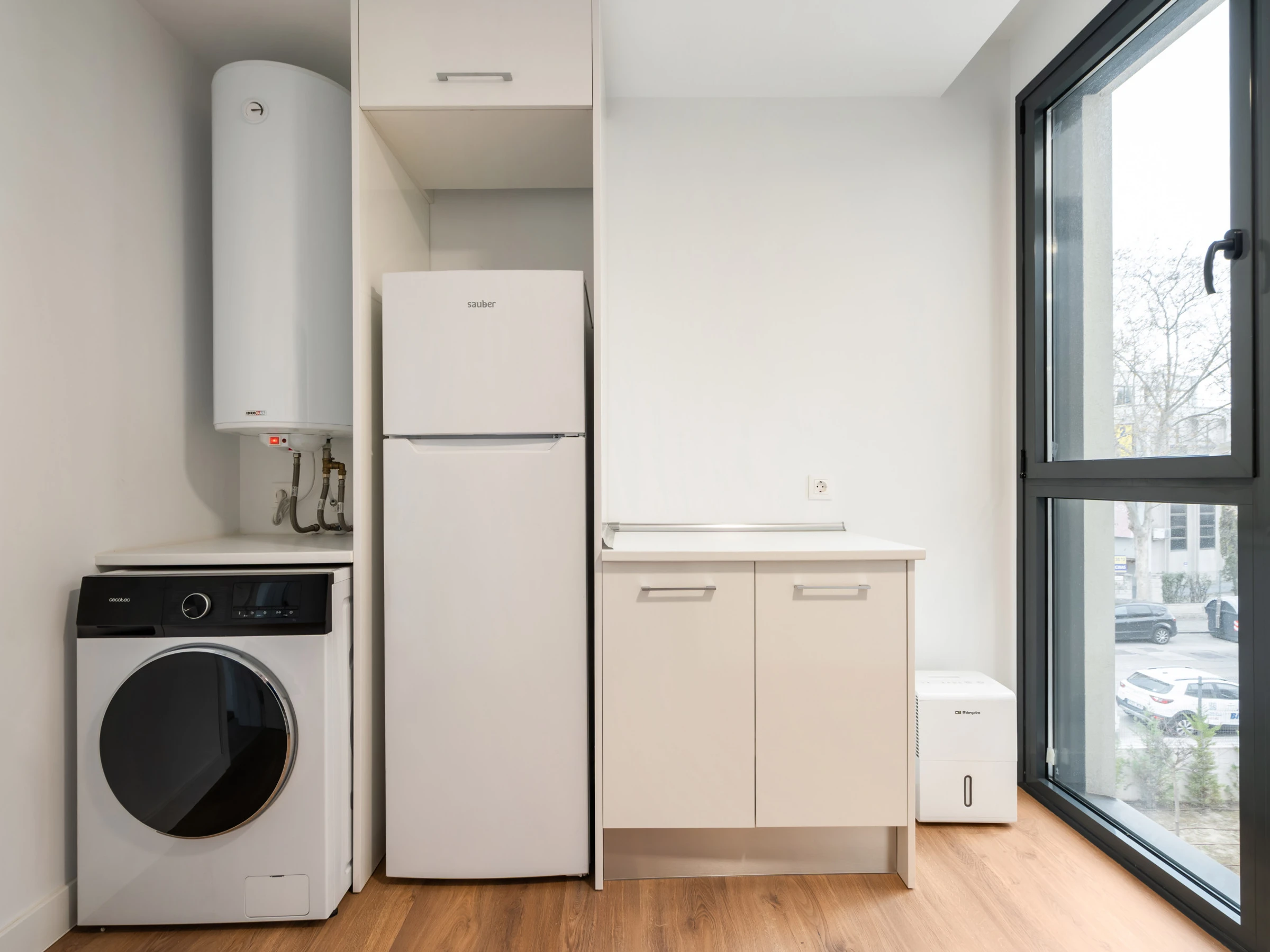 Die amerikanische Küche, komplett ausgestattet, umfasst modernste Haushaltsgeräte wie Kühlschrank, Waschmaschine, Mikrowelle, Kaffeemaschine, Toaster, Wasserkocher und Entsafter. Perfekt zum Zubereiten schneller Mahlzeiten oder zum Genießen eines Frühstücks, bevor der Tag beginnt.