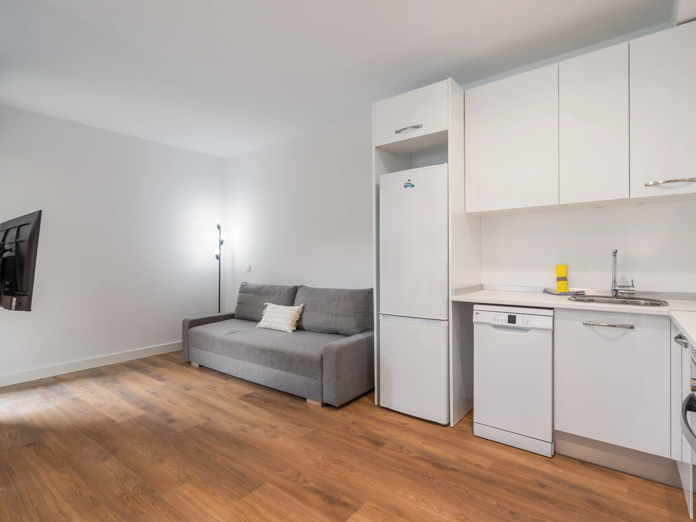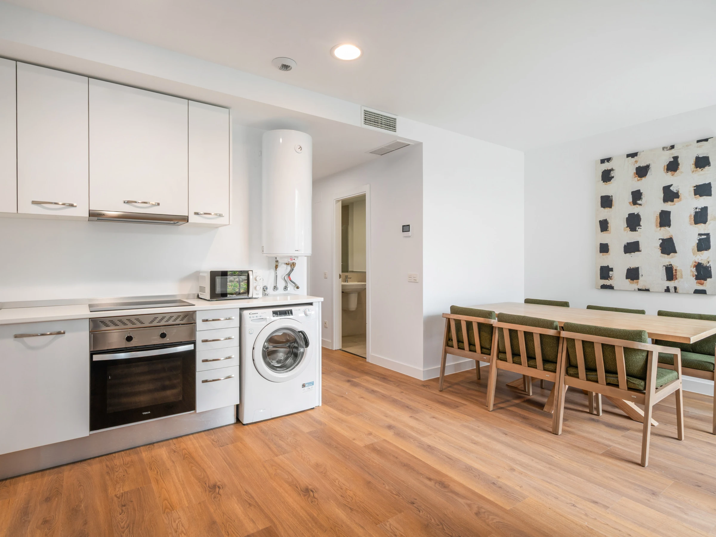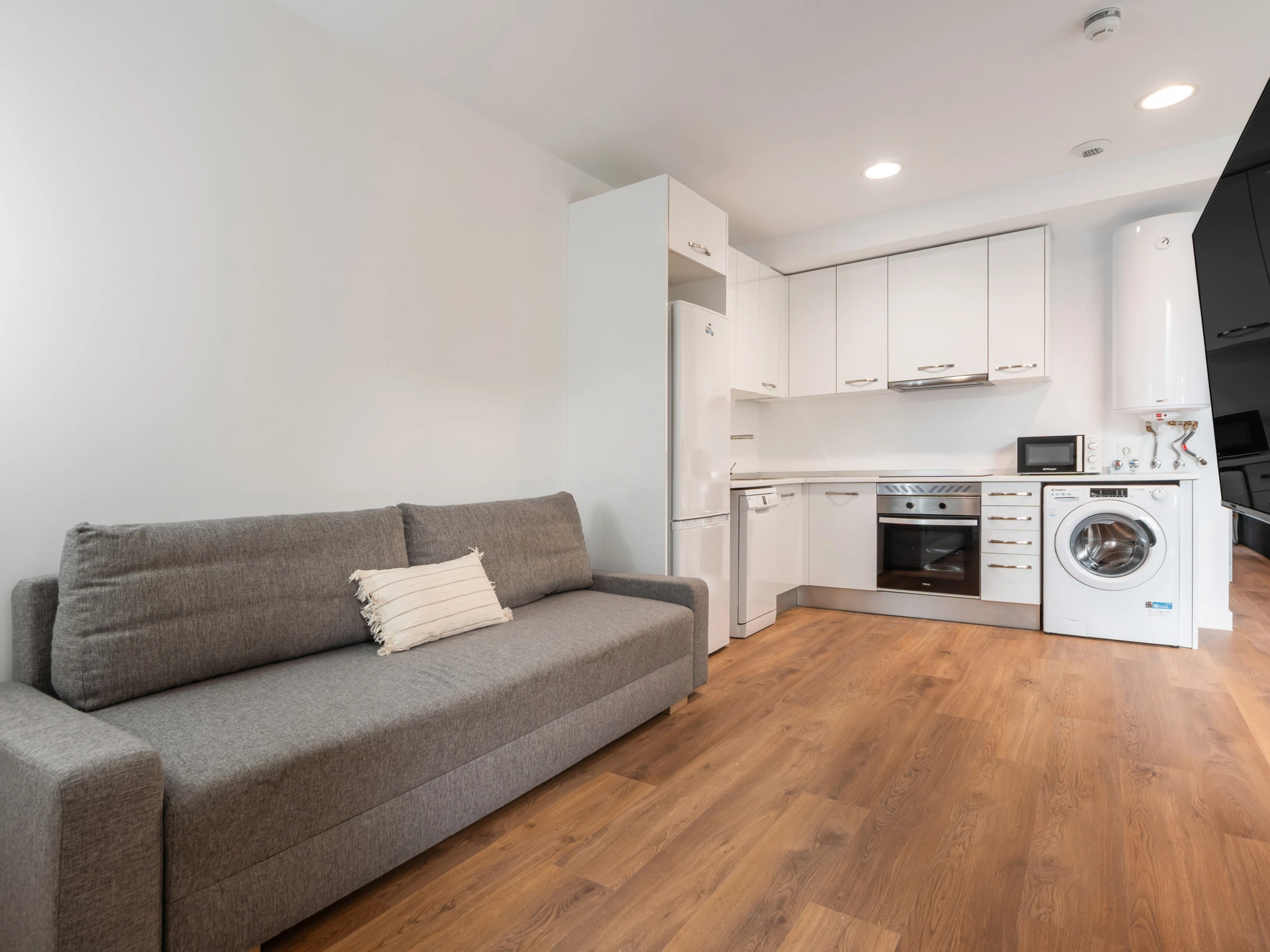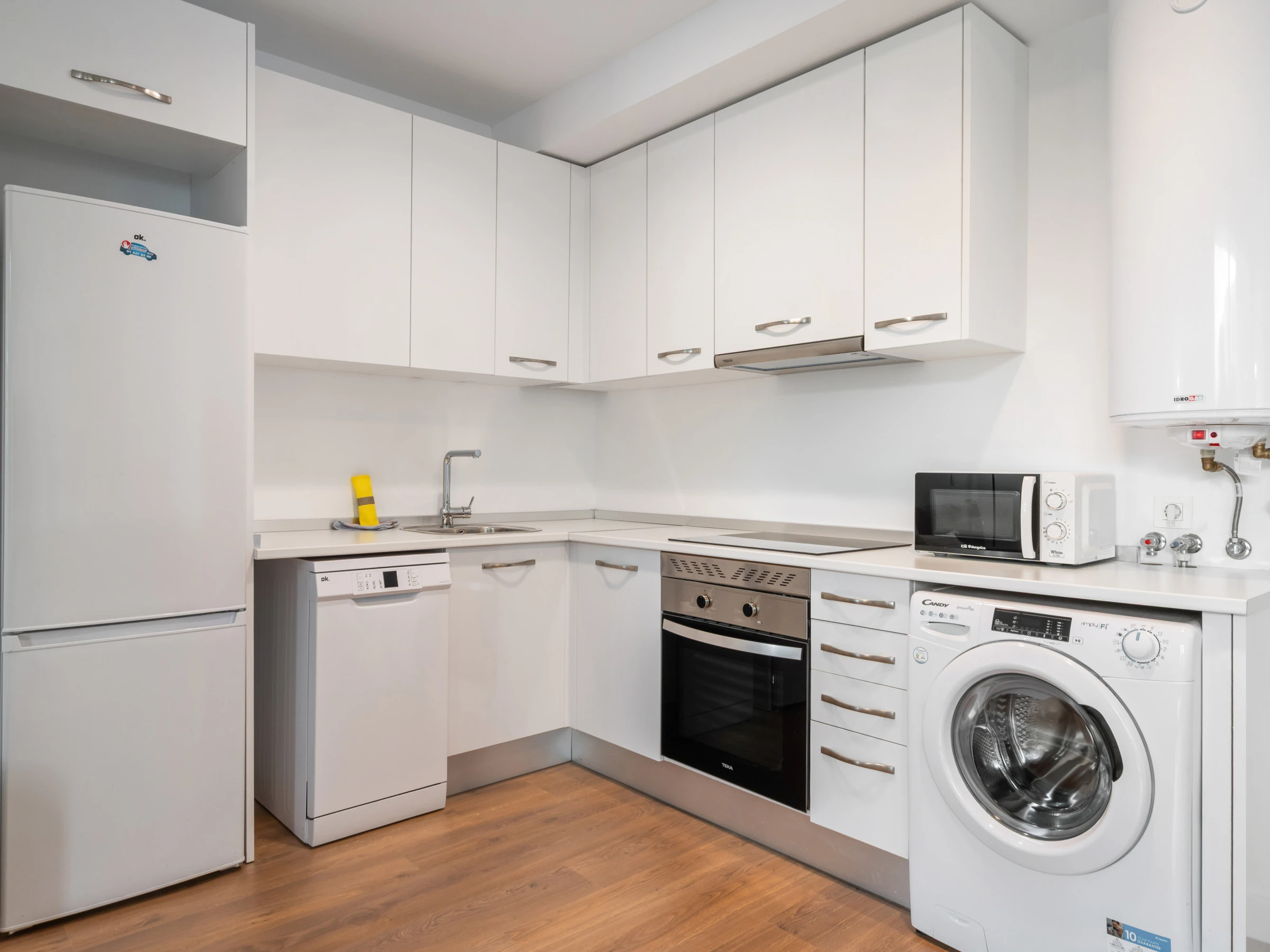 Dieses offene küche, mit induktions-kochfeld, ist ausgestattet in kühlschrank, mikrowelle, backofen, gefrierschrank, spülmaschine, geschirr/besteck, kochutensilien, kaffeemaschine, toaster und wasserkocher[hidden]