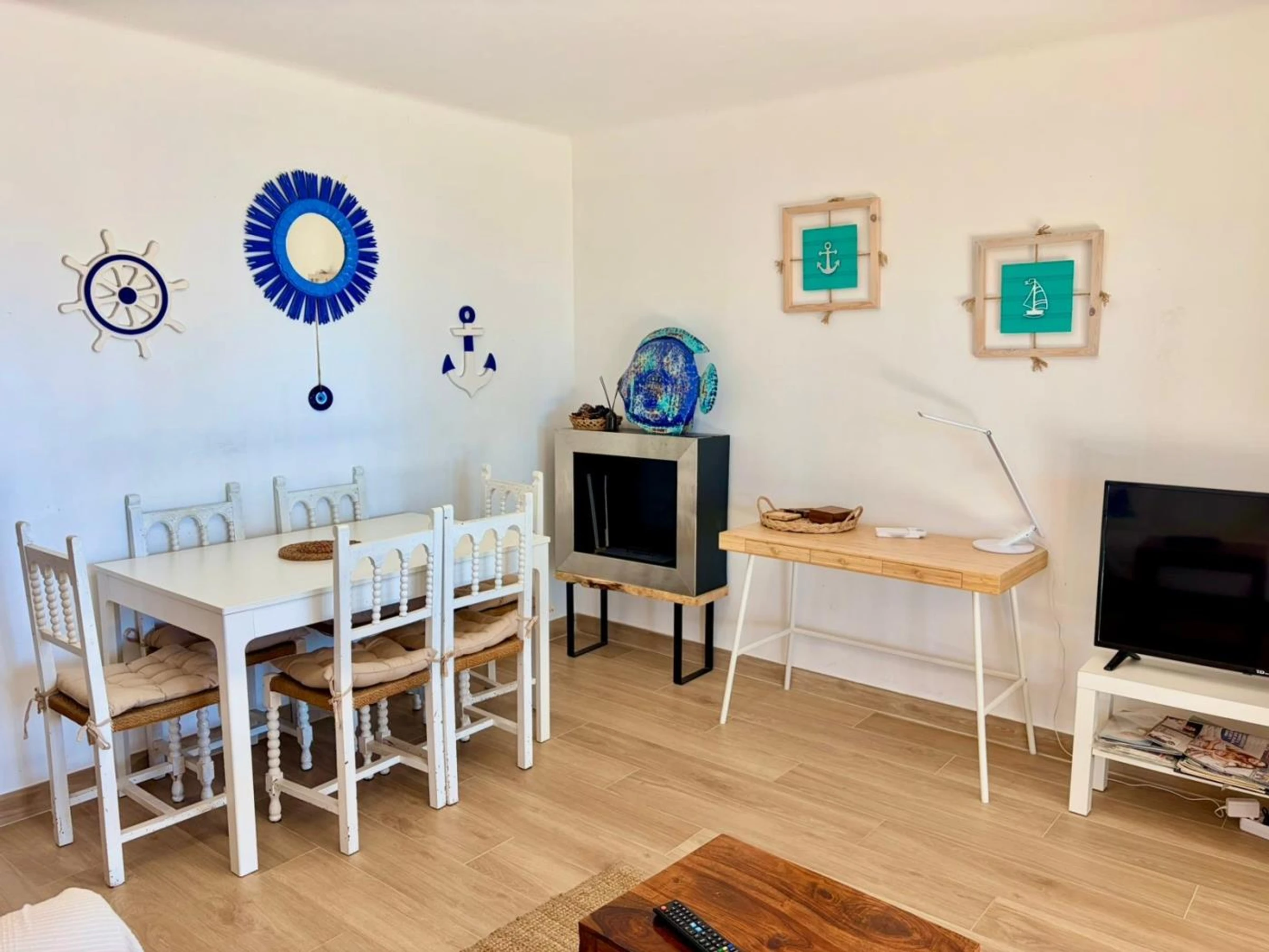 Die Wohnung verfügt über einen hellen und großzügigen Wohn- und Essbereich mit direktem Zugang zu einer gemütlichen privaten Terrasse, ausgestattet mit Gartenmöbeln – perfekt für Frühstück oder Abendessen im Freien mit Meerblick. Große Fenster sorgen den ganzen Tag über für viel natürliches Licht.