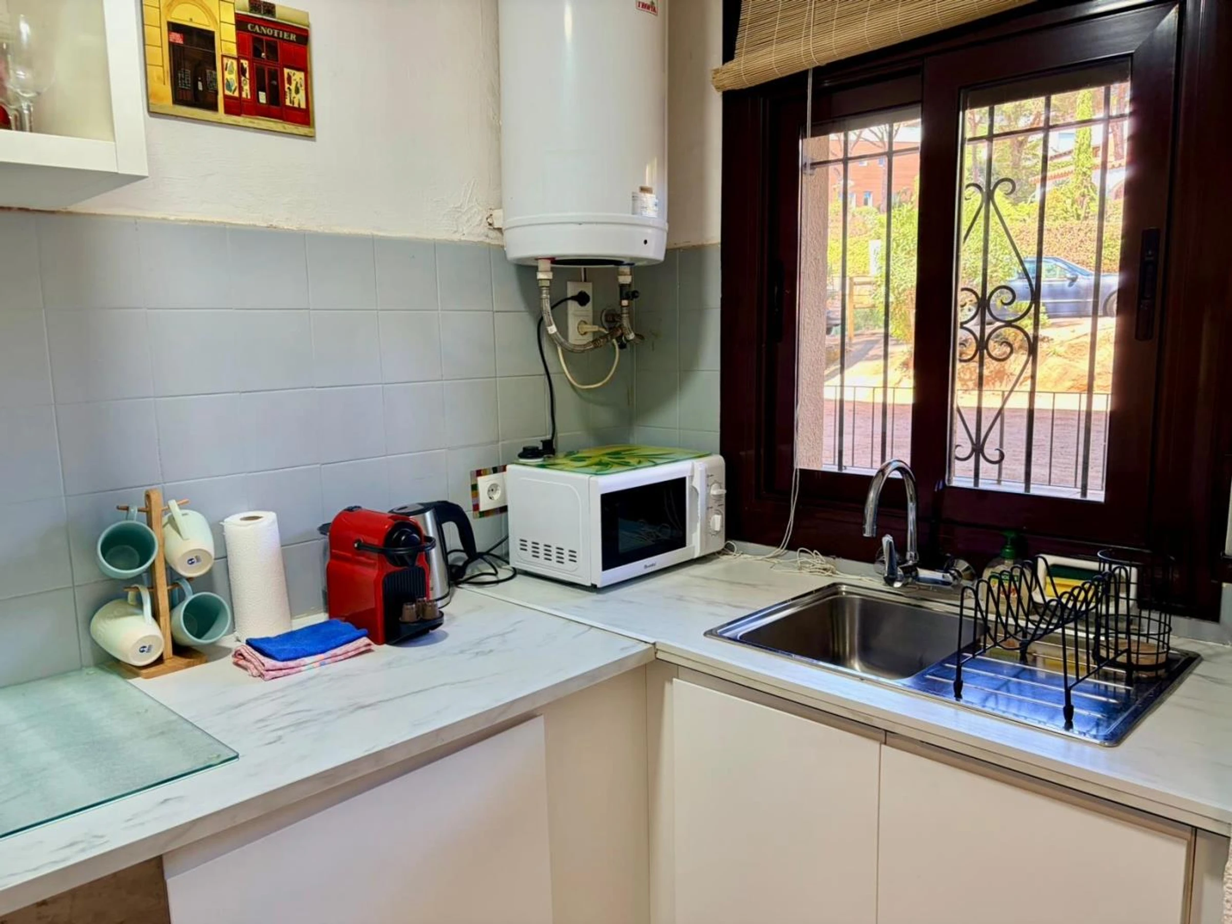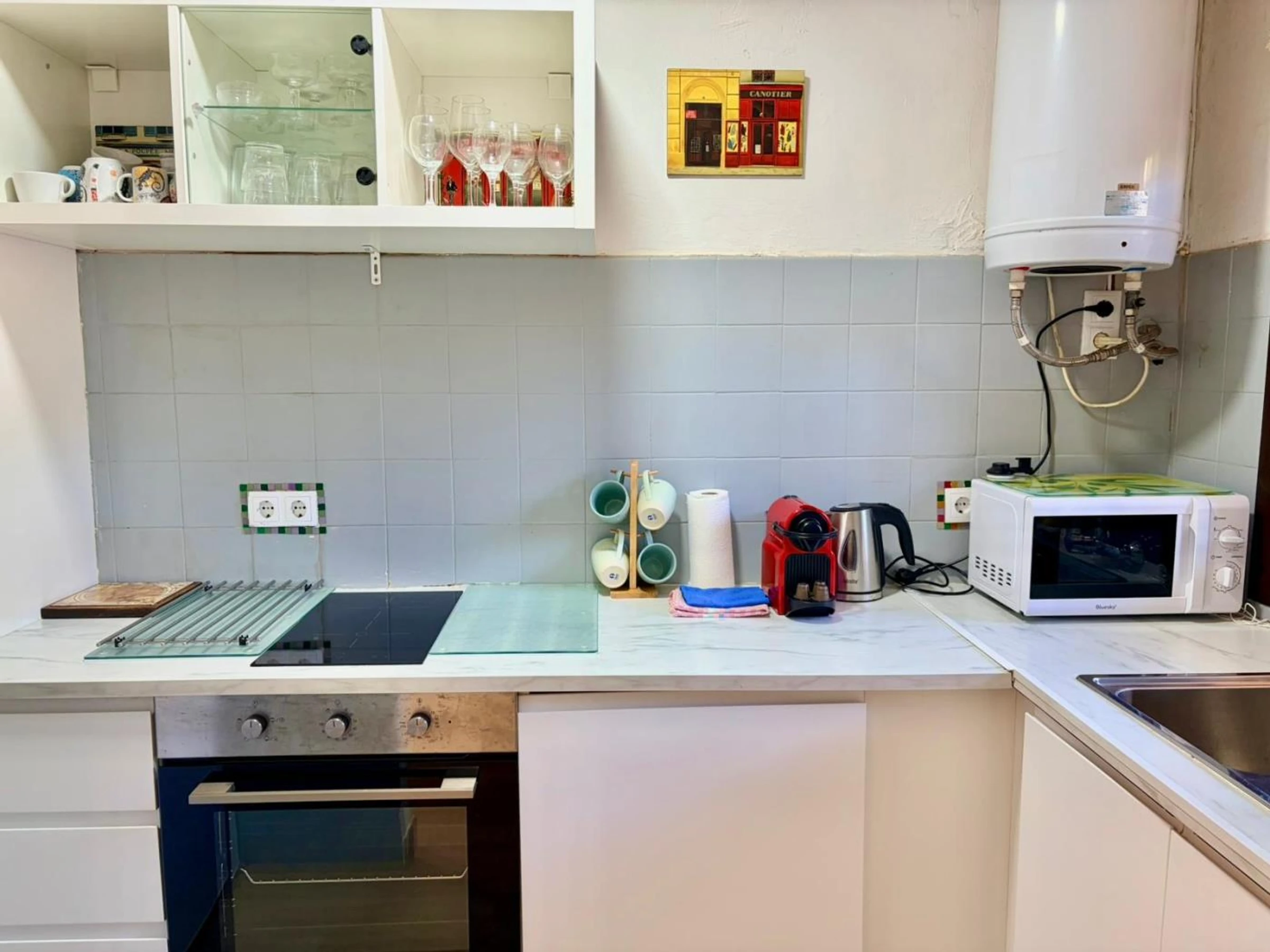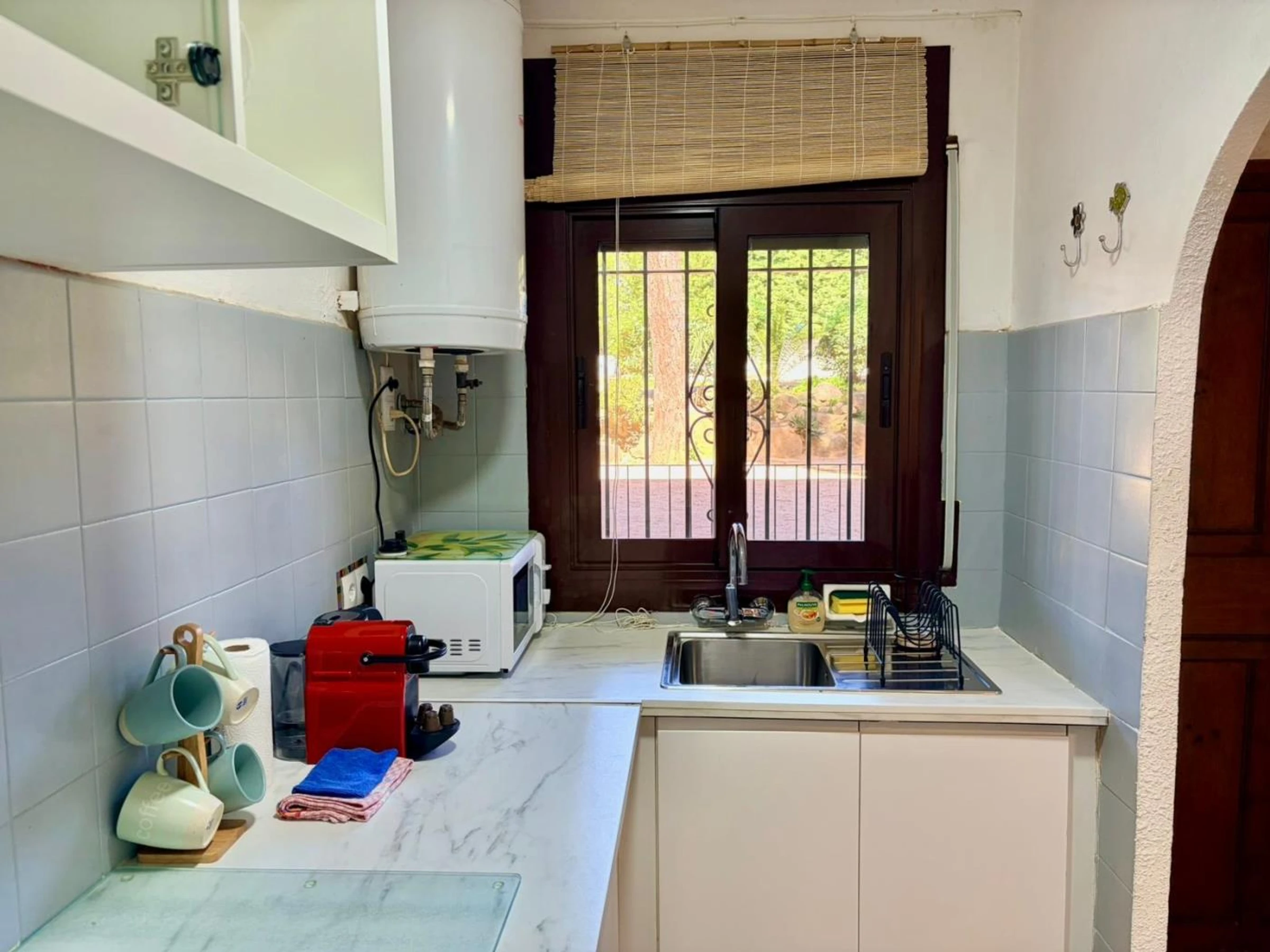 Die separate, voll ausgestattete Küche bietet Cerankochfeld, Backofen, Mikrowelle, Kaffeemaschine und grundlegende Küchenutensilien für einen angenehmen Aufenthalt. Zudem ist eine Klimaanlage vorhanden, die an warmen Tagen für zusätzlichen Komfort sorgt.