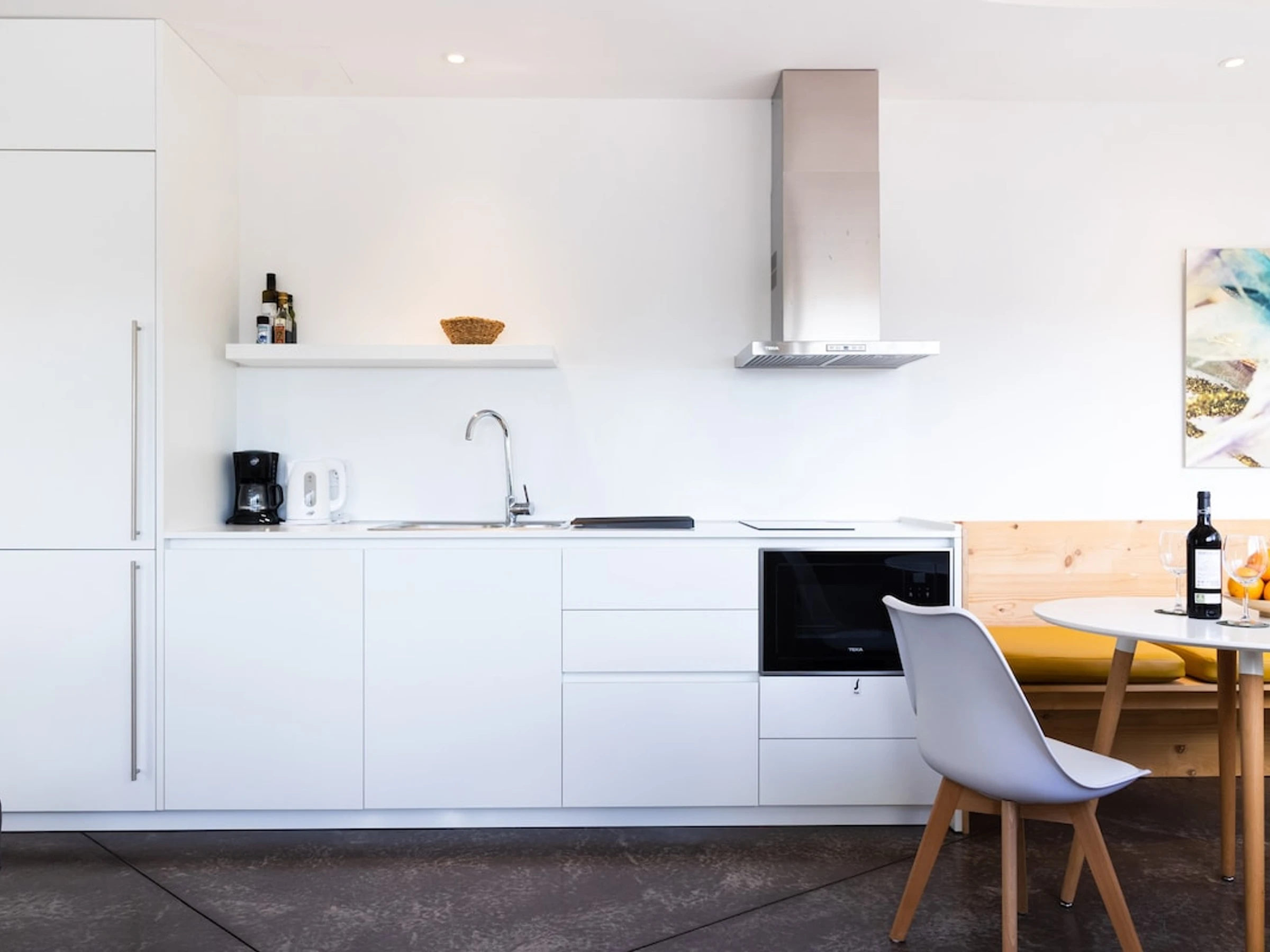 Dieses küche, ist ausgestattet in mikrowelle, kochutensilien und kaffeemaschine.
