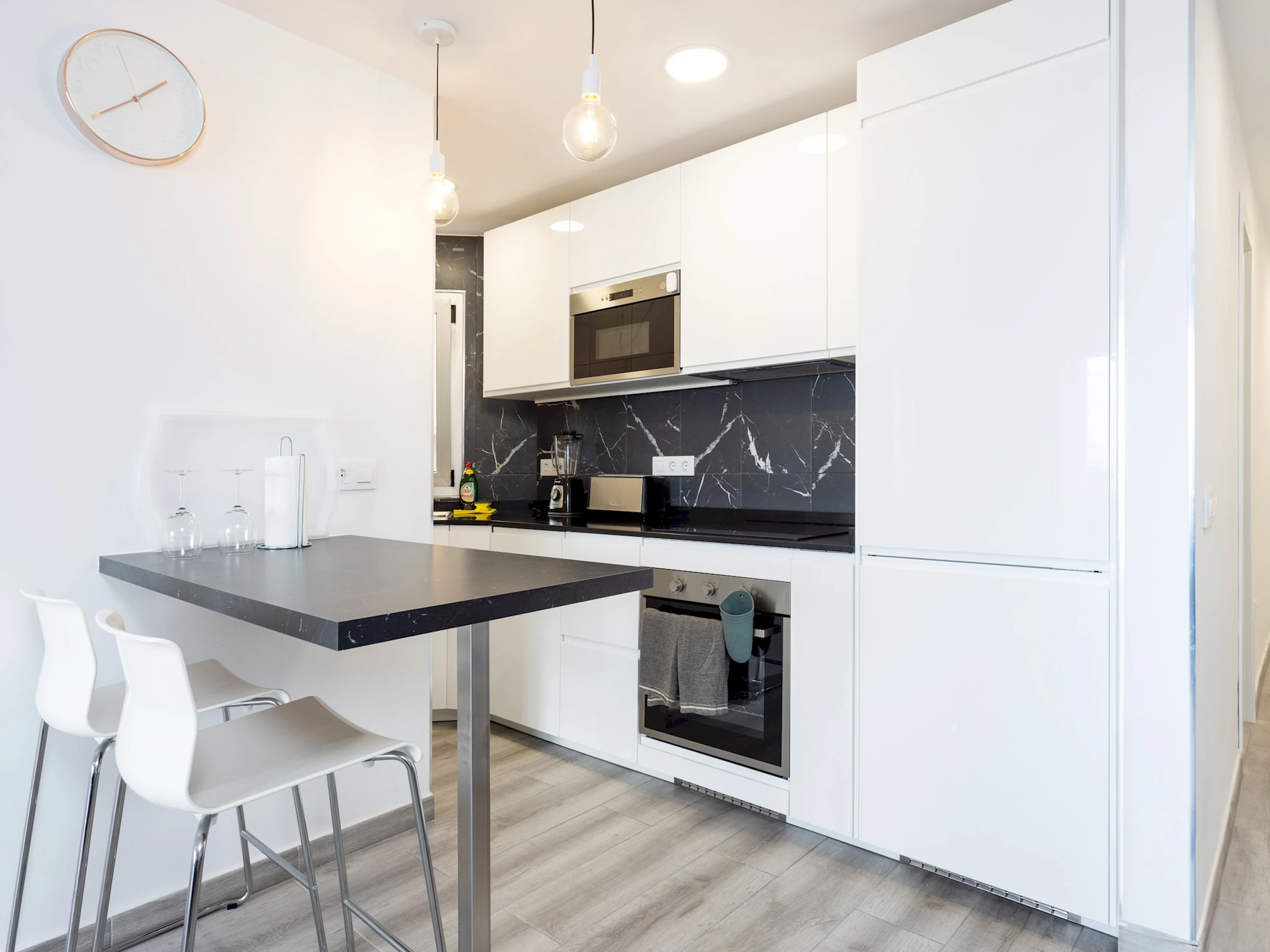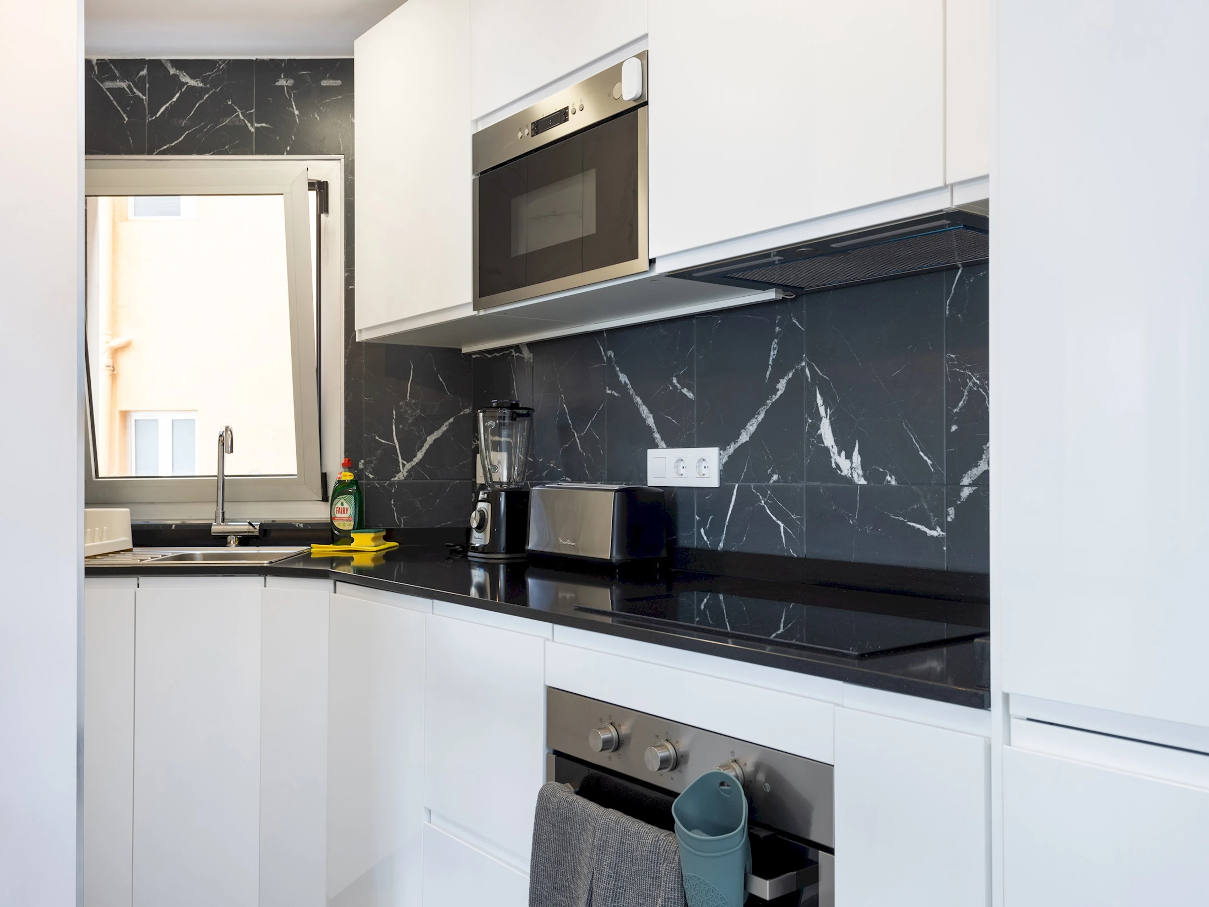 Dieses küche, ist ausgestattet in mikrowelle, backofen, spülmaschine, kochutensilien und kaffeemaschine.