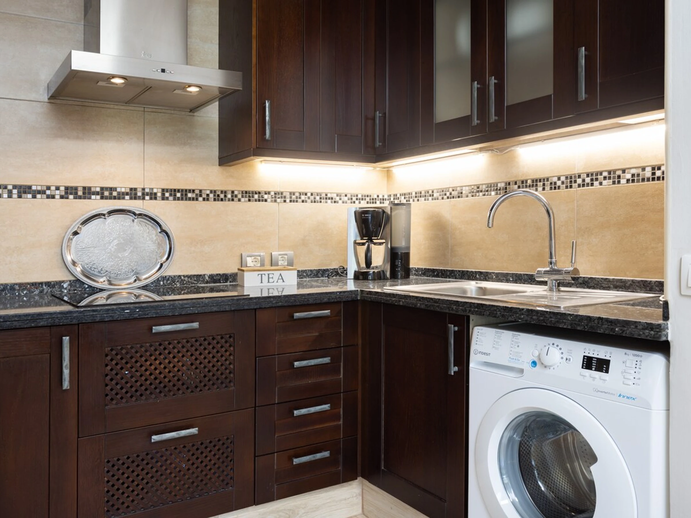 Dieses küche, ist ausgestattet in mikrowelle, backofen, kochutensilien und kaffeemaschine.