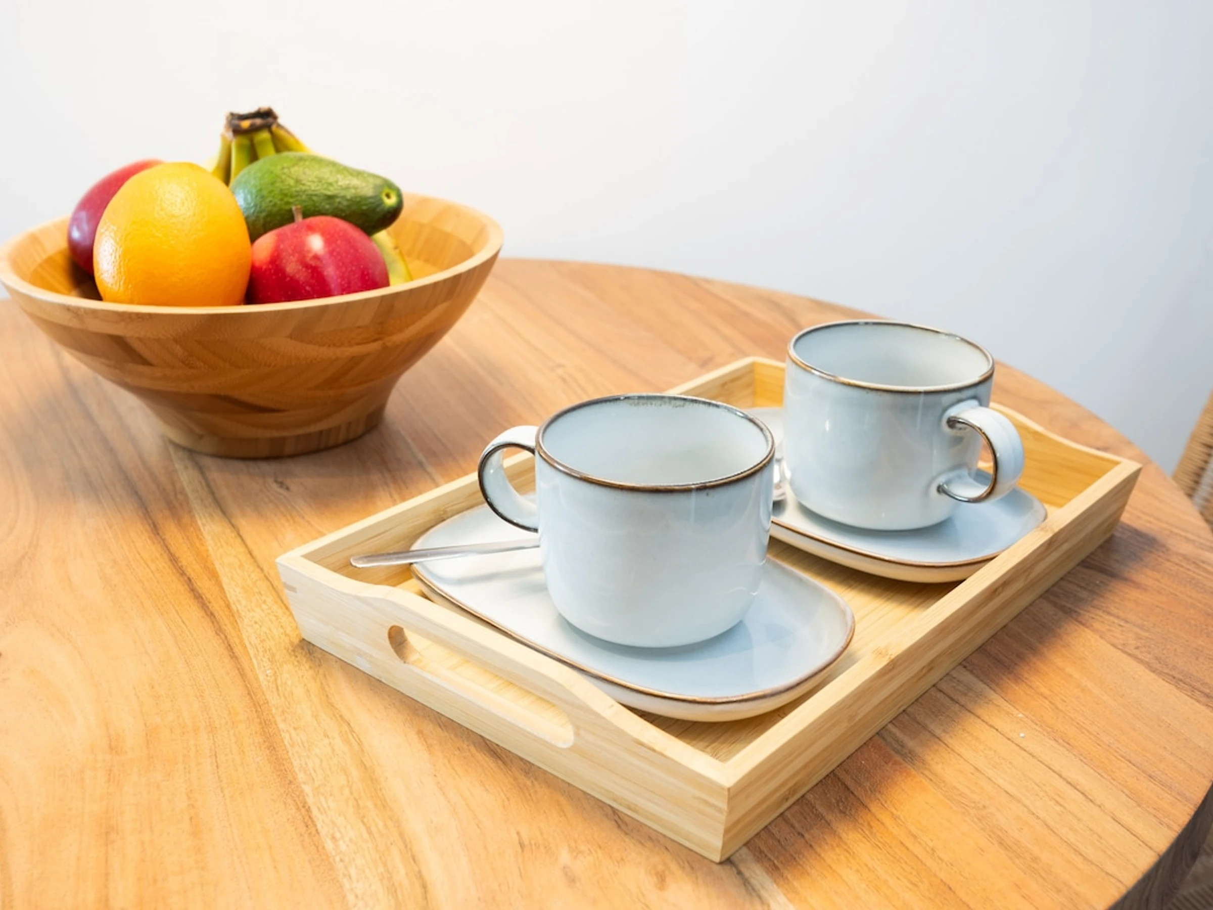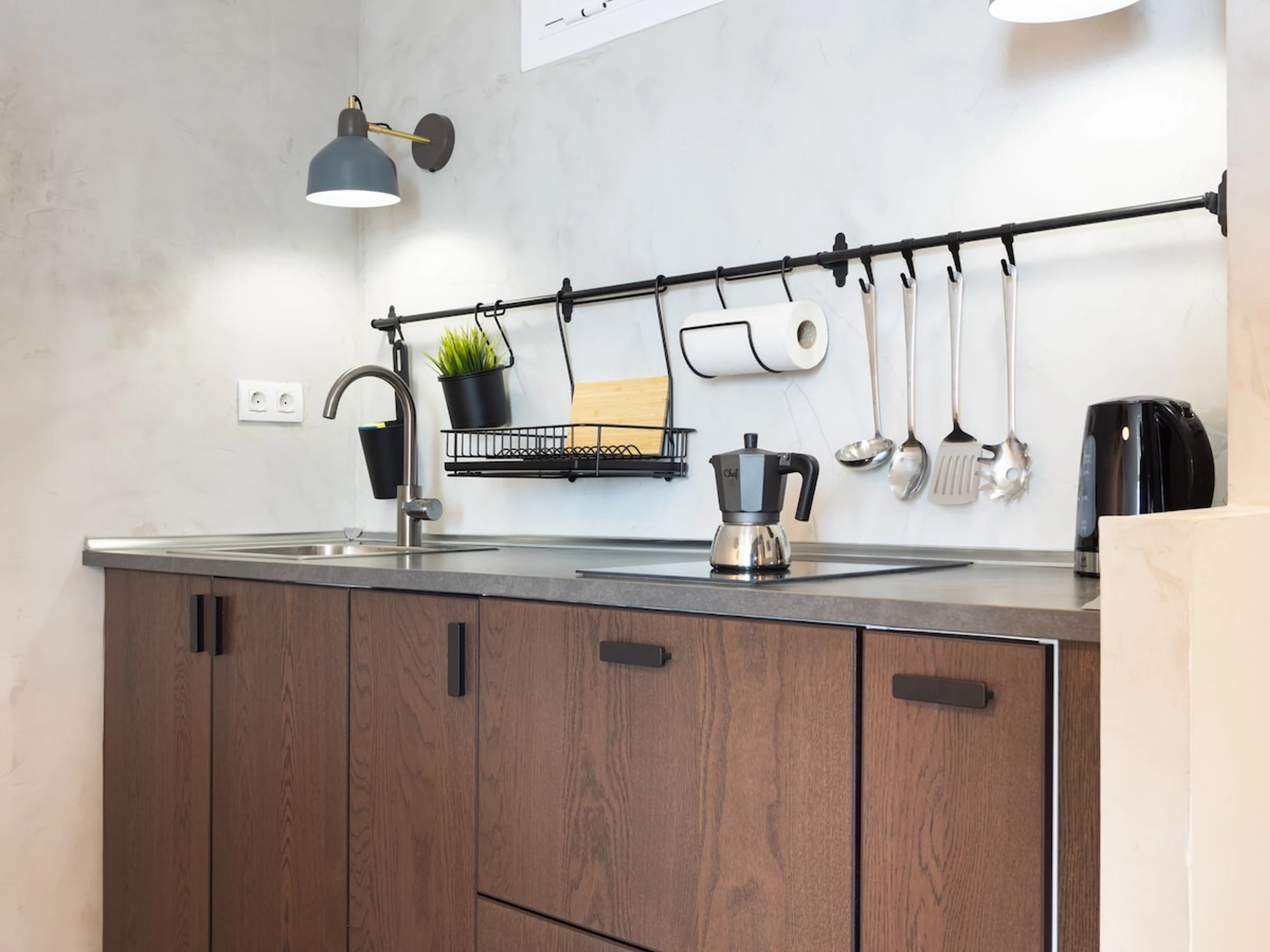 Dieses küche, ist ausgestattet in mikrowelle, backofen, kochutensilien und kaffeemaschine.