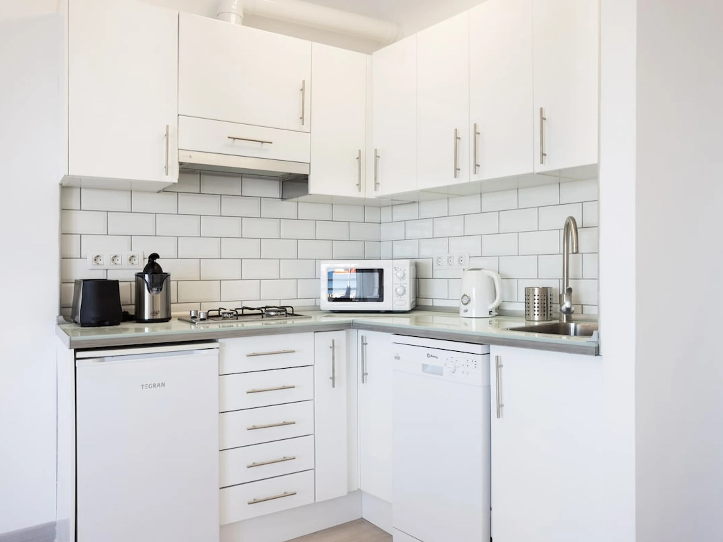 Dieses küche, ist ausgestattet in mikrowelle, spülmaschine, kochutensilien und kaffeemaschine.