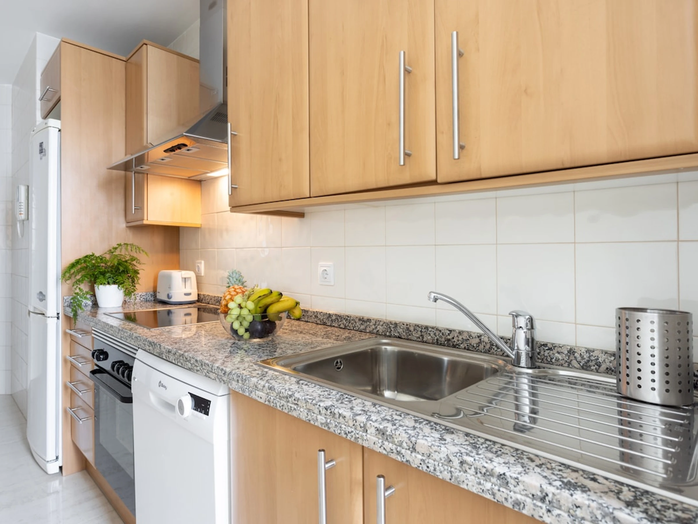 Dieses küche, ist ausgestattet in mikrowelle, spülmaschine, kochutensilien und kaffeemaschine.