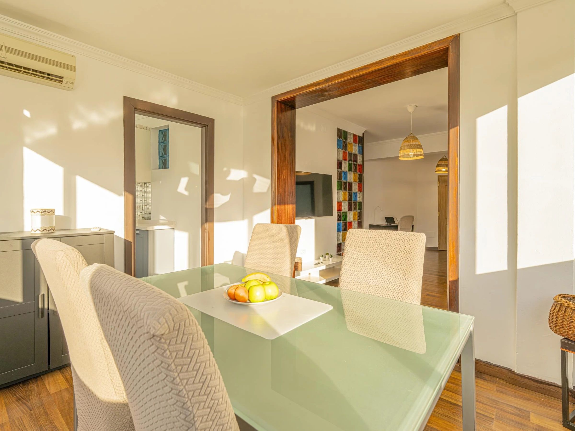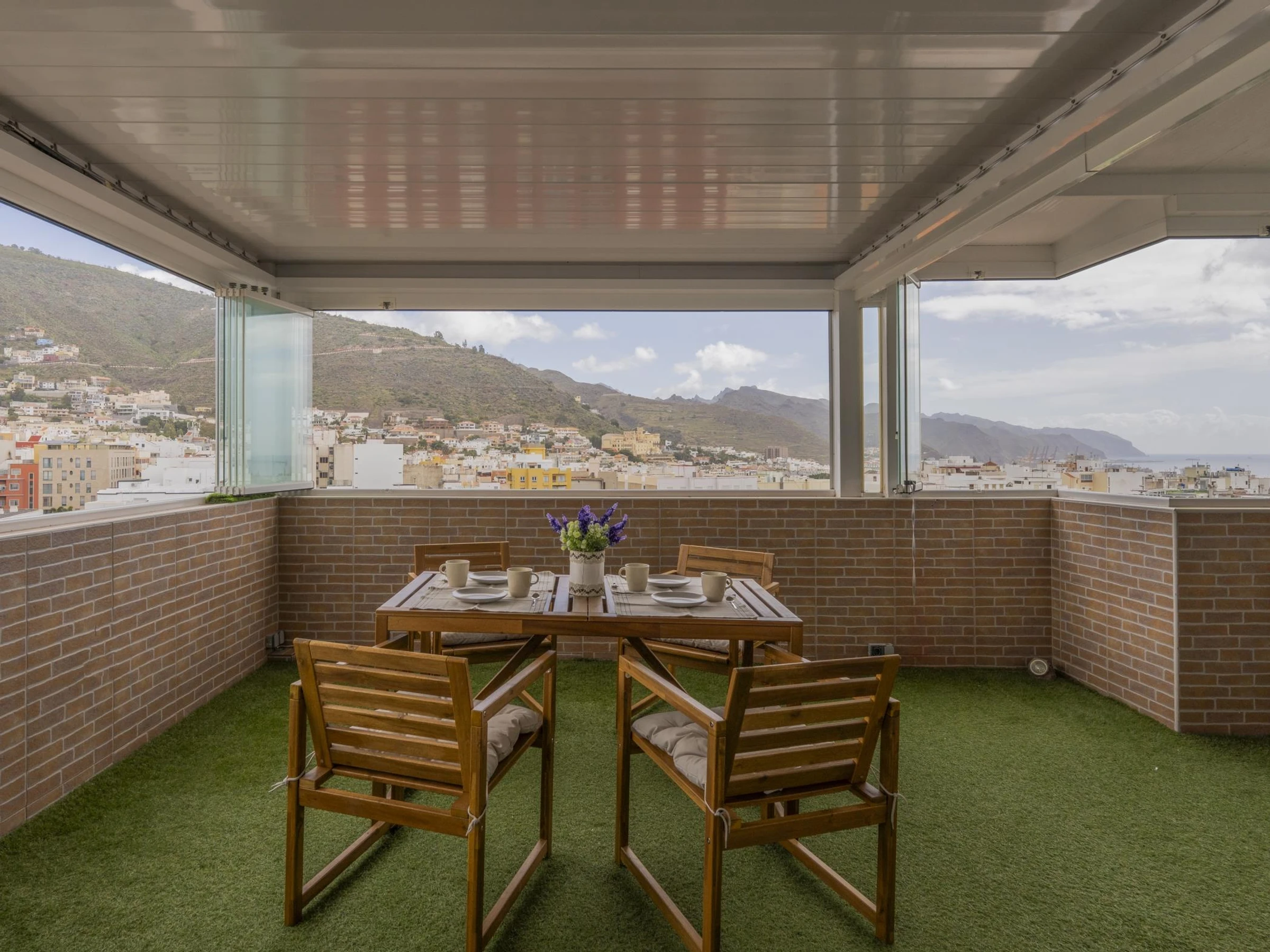 Das absolute Highlight dieser Wohnung ist jedoch die großzügige Terrasse. Ein besonderer Rückzugsort mitten in der Stadt mit beeindruckendem Blick über Santa Cruz de Tenerife bis hin zum Meer. Ausgestattet mit Kunstrasen, Essbereich im Freien und einer Außendusche lädt sie dazu ein, das ganzjährig milde Klima der Insel in vollen Zügen zu genießen. Die vollständig zu öffnende Glasfront ermöglicht es, Innen- und Außenbereich nahtlos miteinander zu verbinden und das Leben auf Teneriffa ganz unmittelbar zu erleben. Ein echtes Highlight im urbanen Umfeld.