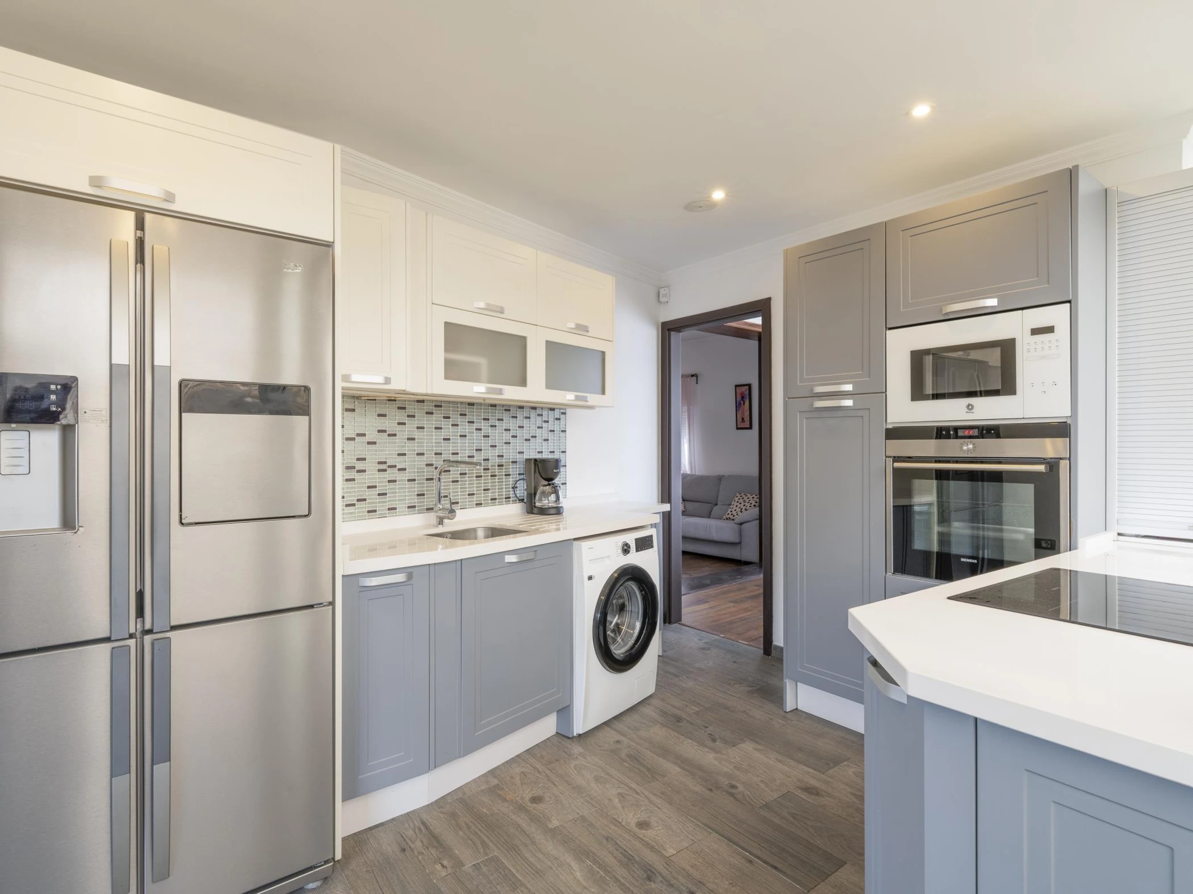 Die moderne Küche lässt keine Wünsche offen und verfügt über einen großen Kühlschrank mit Doppeltür, Backofen, Mikrowelle, Espressokocher und Filterkaffeemaschine, Zitruspresse, Toaster, Induktionskochfeld, Wasserkocher, Mixer sowie sämtliche Küchenutensilien für einen komfortablen Aufenthalt.