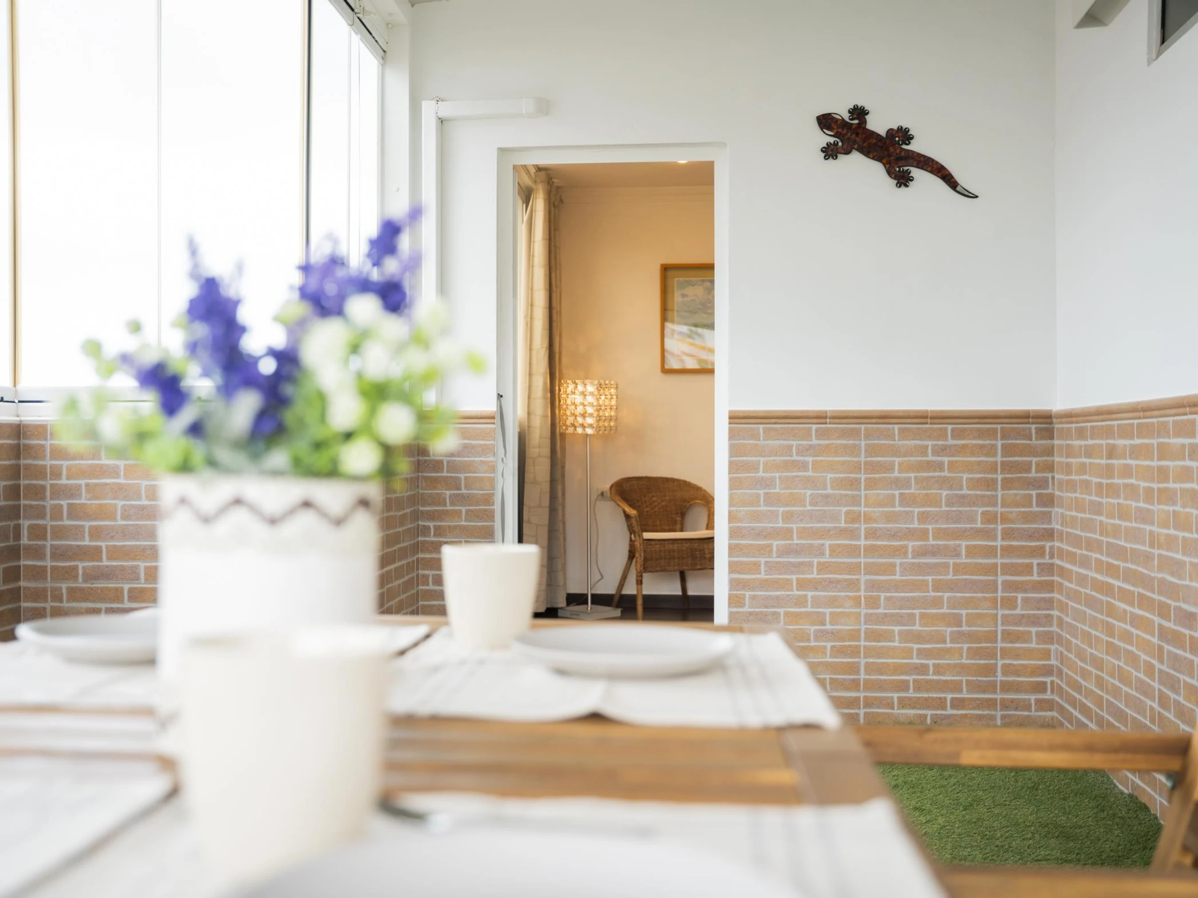 Der offen gestaltete Wohnbereich verbindet Wohnzimmer, Essbereich und Küche zu einem großzügigen, harmonischen Raum mit viel Tageslicht, das durch die umlaufenden Fenster hereinfällt. Das Wohnzimmer ist mit einem 55-Zoll-Smart-TV, schnellem WLAN, Klimaanlage und einem funktionalen Arbeitsplatz ausgestattet – perfekt sowohl zum Entspannen als auch zum Arbeiten im Homeoffice.