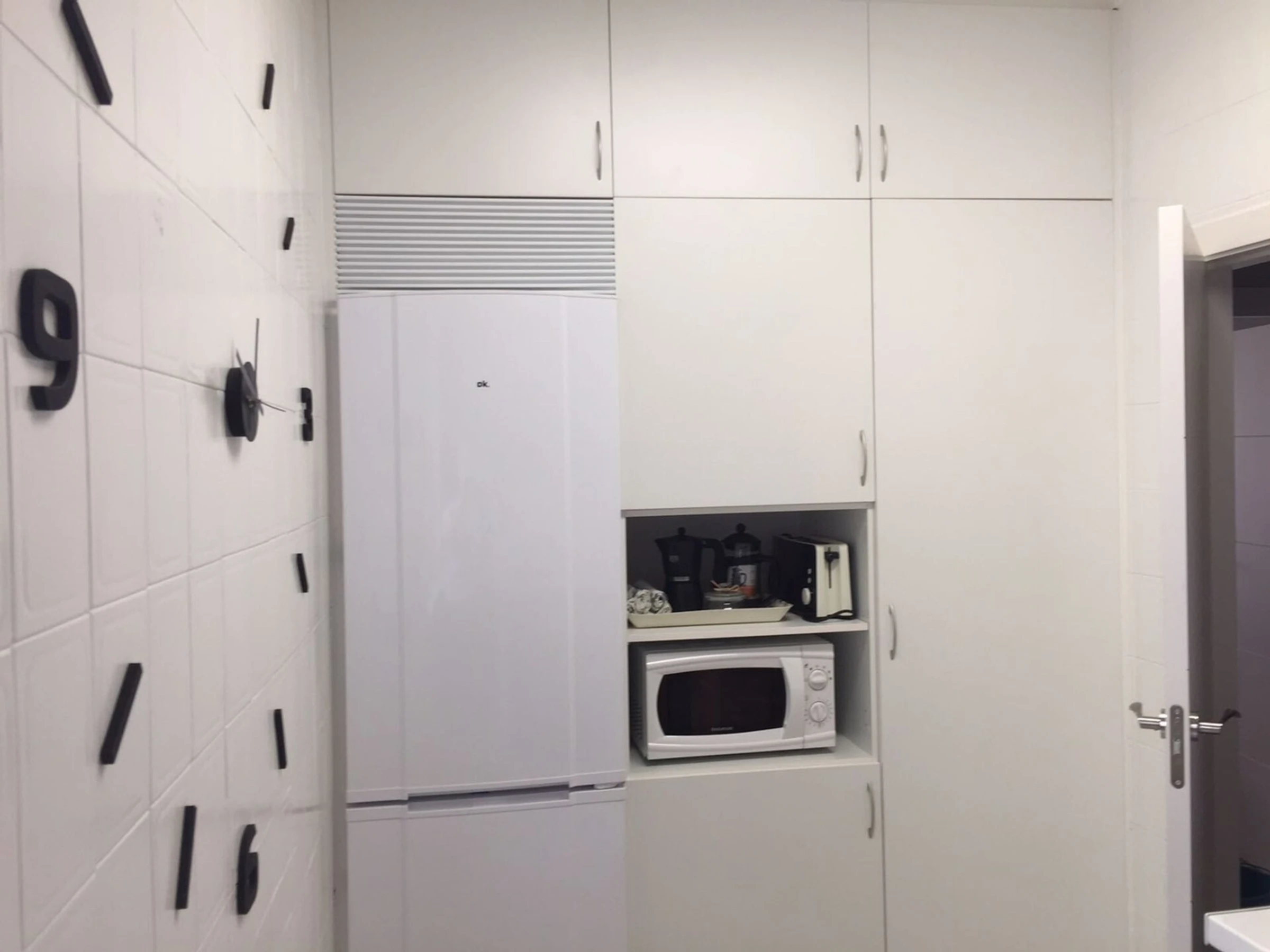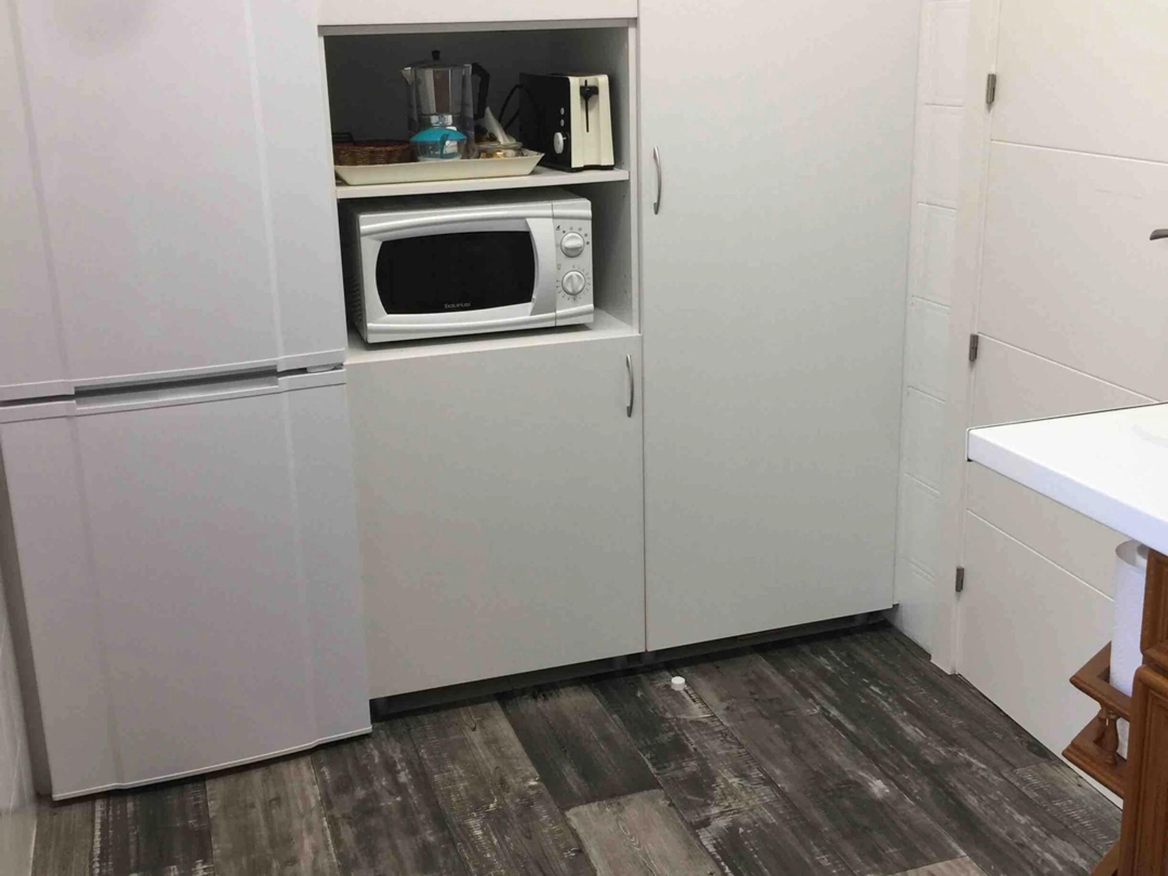 Dieses küche, ist ausgestattet in mikrowelle, backofen, gefrierschrank, kochutensilien, kaffeemaschine und toaster.