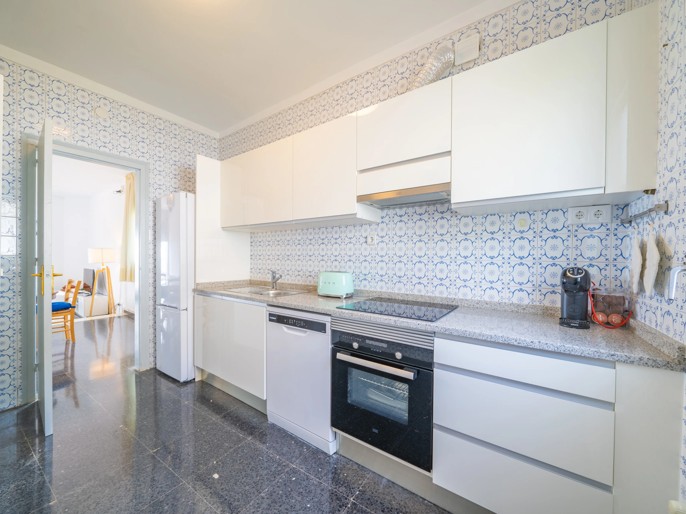 Dieses separate küche, mit ceranfeld, ist ausgestattet in kühlschrank, mikrowelle, backofen, gefrierschrank, spülmaschine, geschirr/besteck, kochutensilien, kaffeemaschine, toaster und wasserkocher.